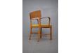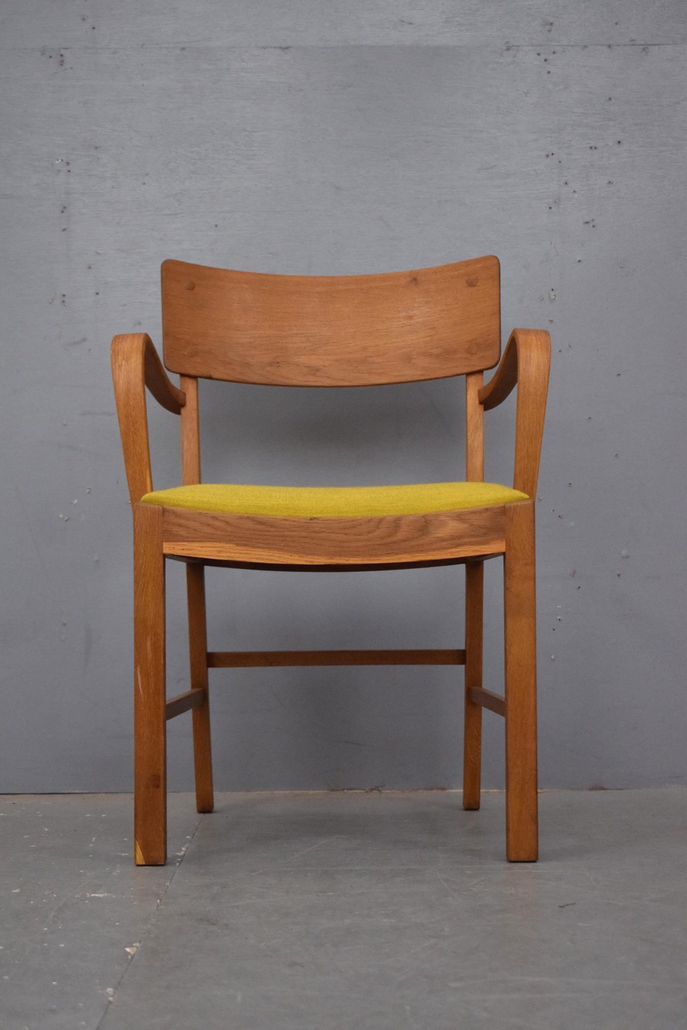 Elegant vintage oak framed armchair with steam bent armrests, wide back rest and new upholstered seat in complimenting yellow mottled fabric from Danish Artweaving.