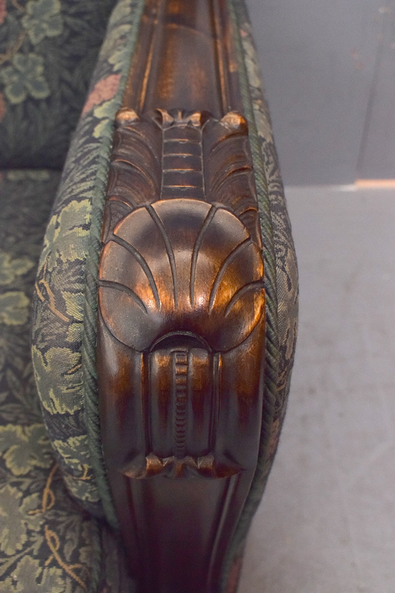 The settee has decorative shell carved front of arms and rests made of polished nutwood which give it the unique style.