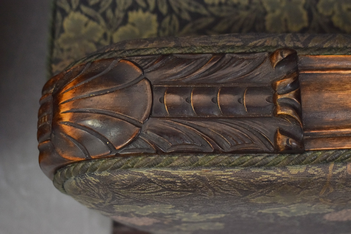 The chair has decorative shell carved front of arms and rests made of polished nutwood which give it the unique style.