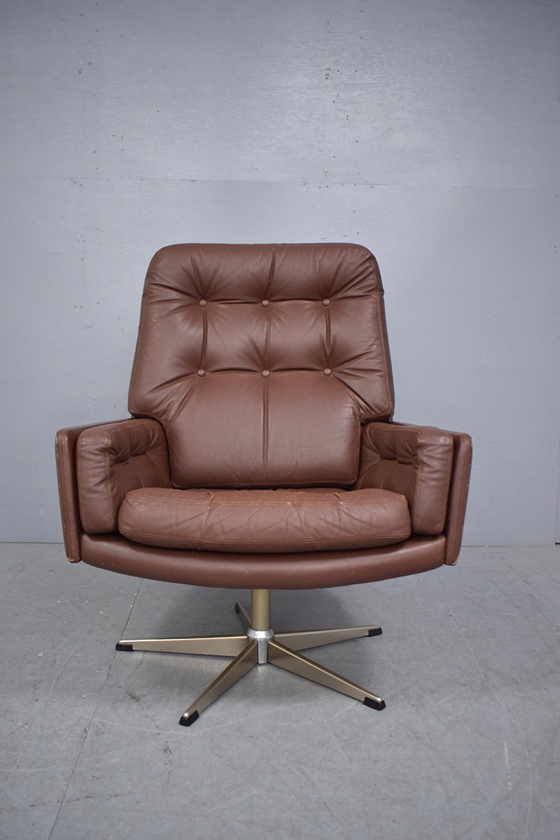 High back swivel chair in original brown colour vintage leather and standing on chromed 5 finger swivel base produced by Danish furniture company in the mid 1970s.