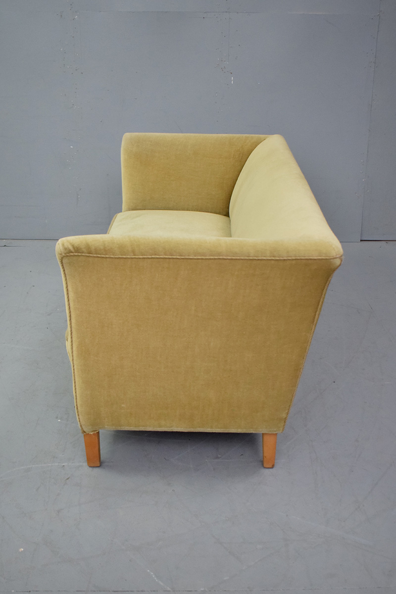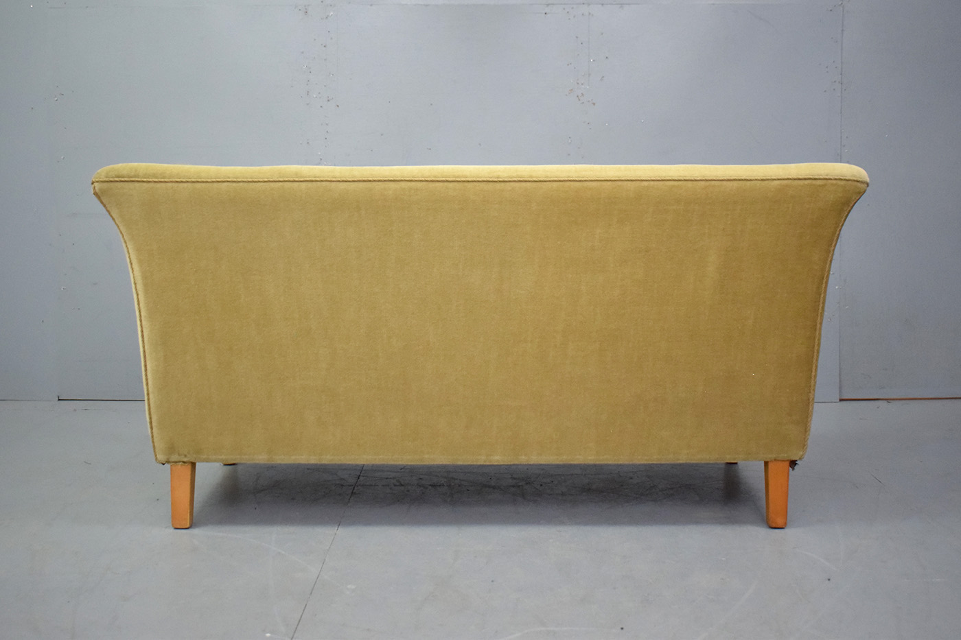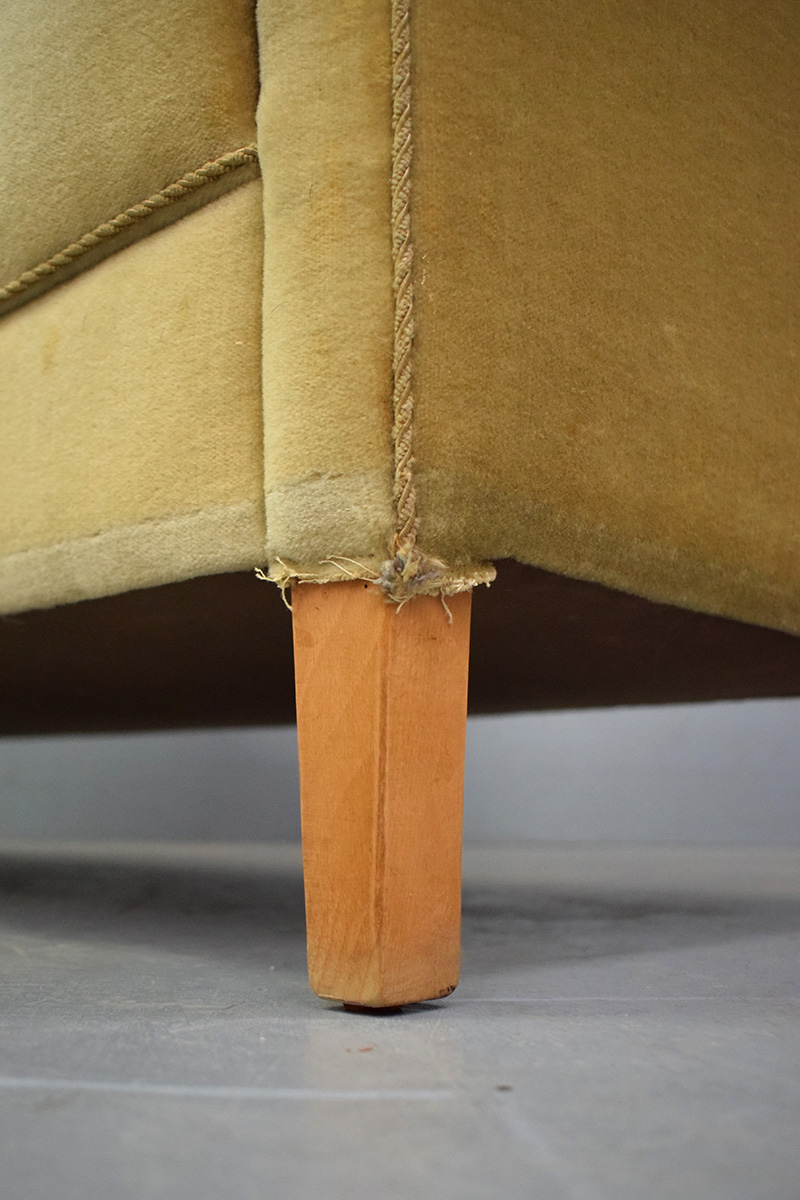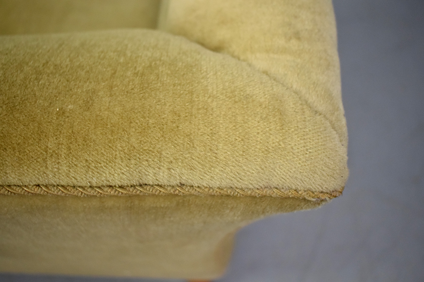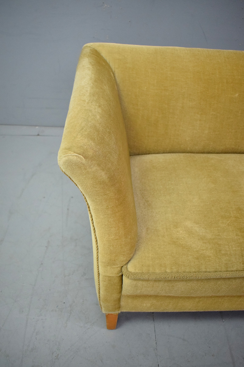 While the sofa is currently in its original gold colour vdraylon upholstery, and there is little wrong with it, it can be re-upholstered at moderate cost due to not having to change any of the padding, only the cover.
