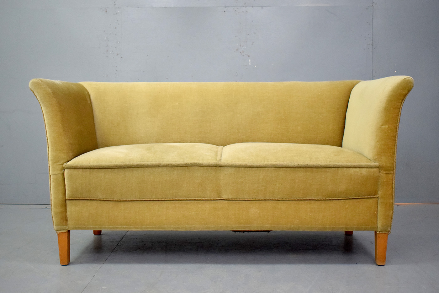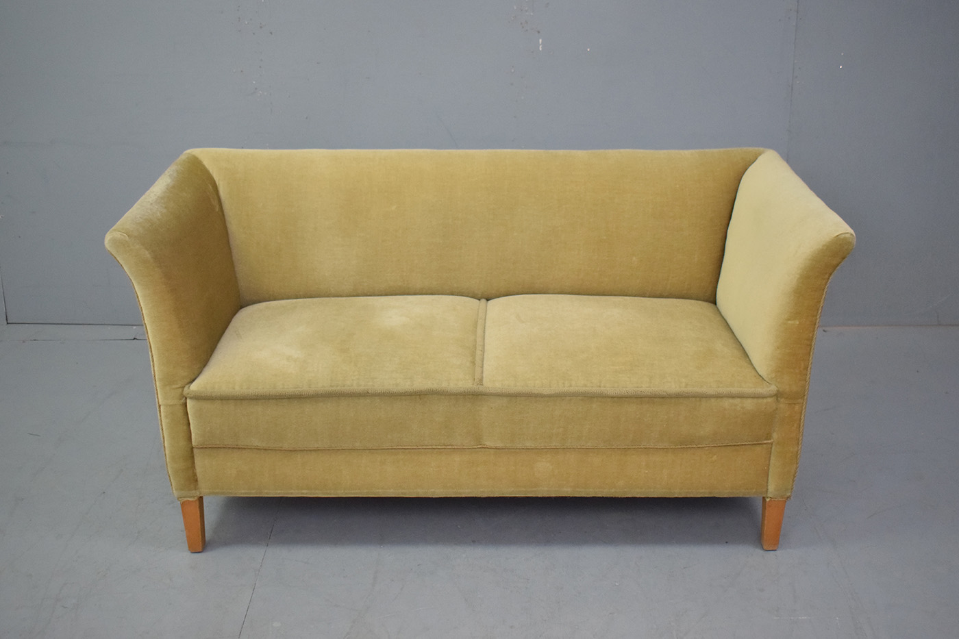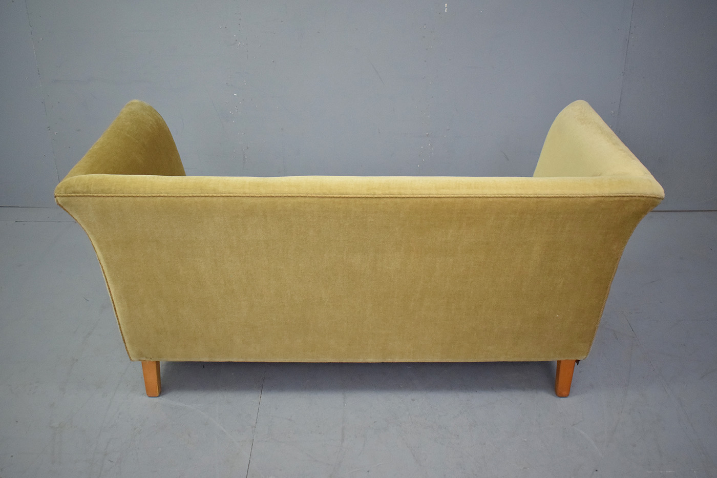 Classic Danish design box frame 2 seat sofa with sprung seat and gold uphostery, produced 1950s by Danish Cabinetmaker.