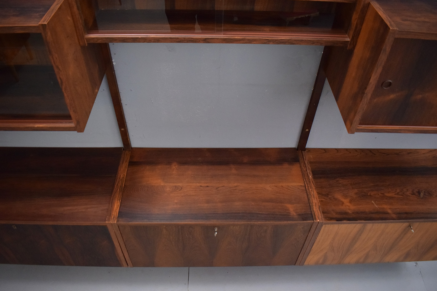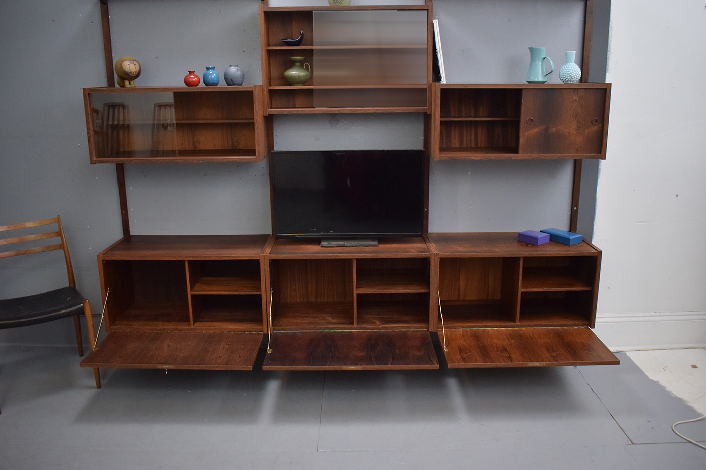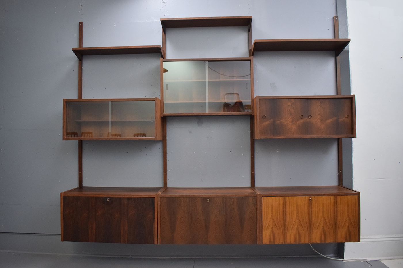 3 Bay vintage rosewood modular shelving system designed 1949 by Prebend Sorensen and produced by Randers mobelfabrik.