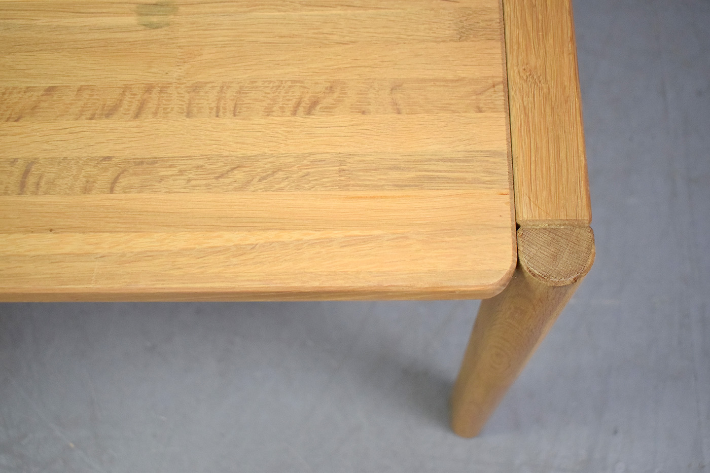 The dining table features a soaped oak finish, which has a soft feel and natural appearance.