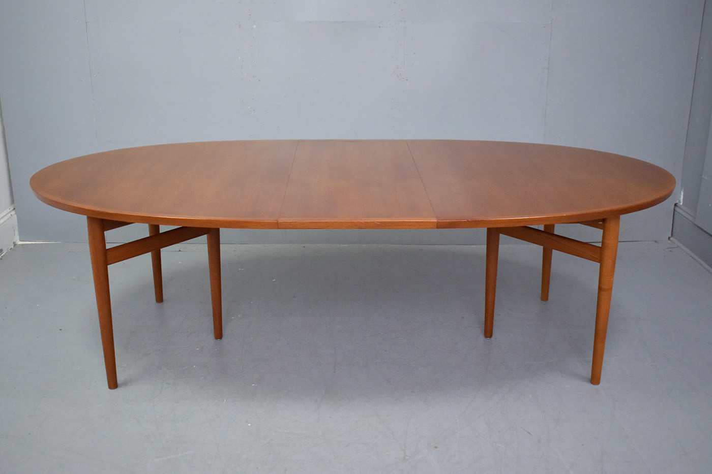 Arne Vodder design extending oval dining table in vintage teak standing on tri-pod legs, model 212 produced 1961 by P Olesen Sibast