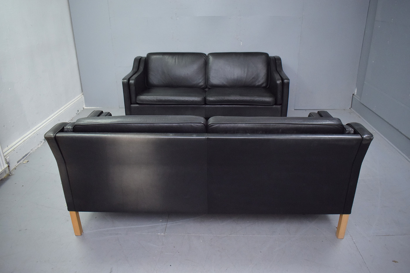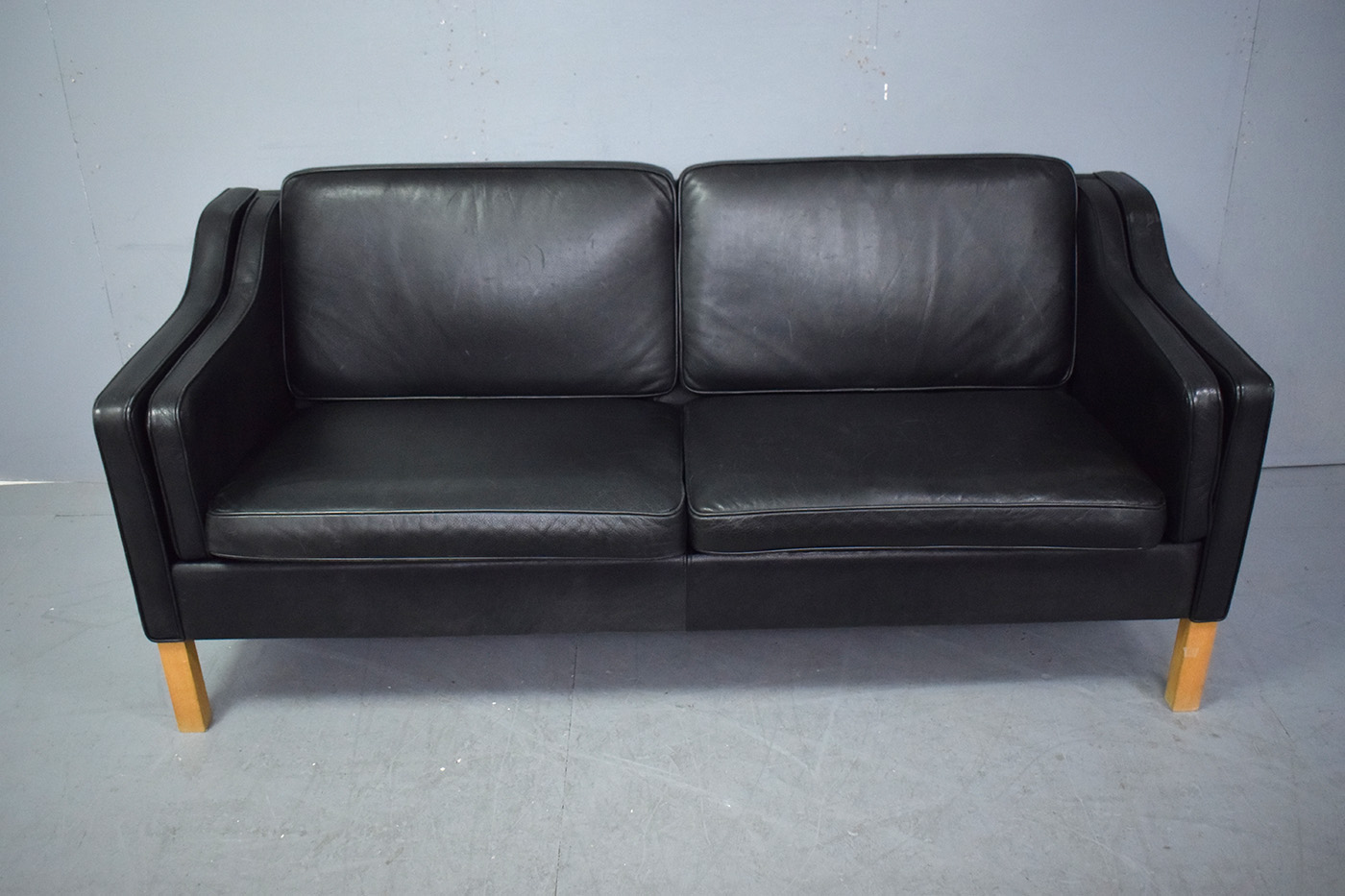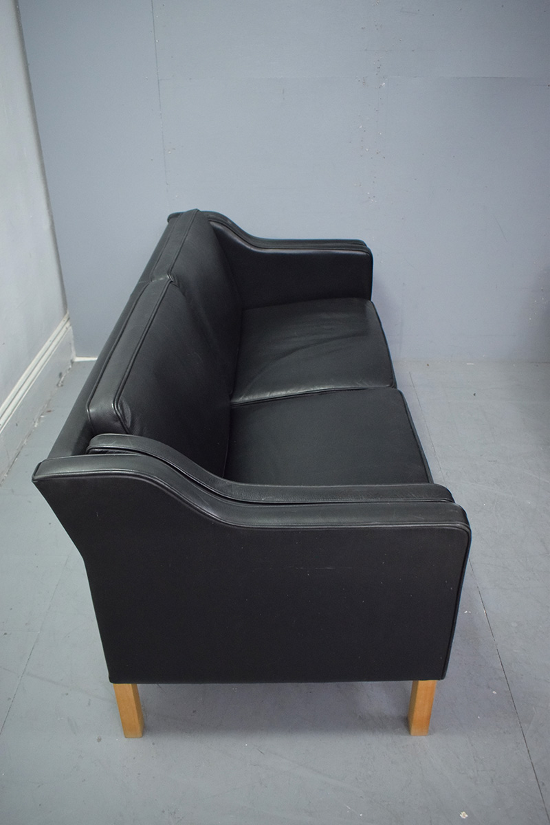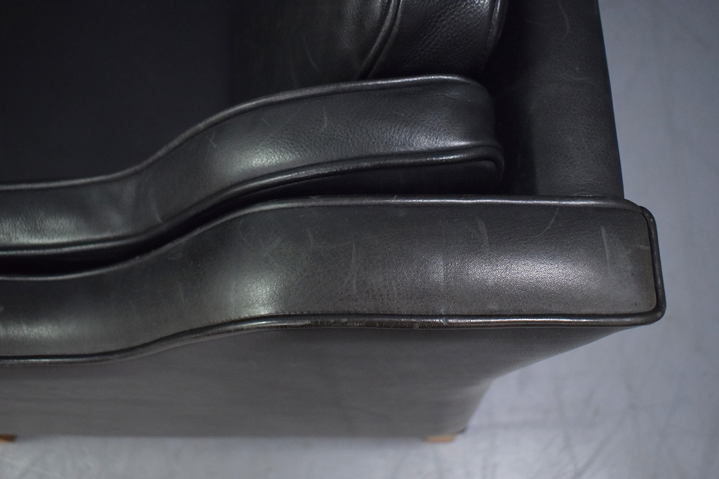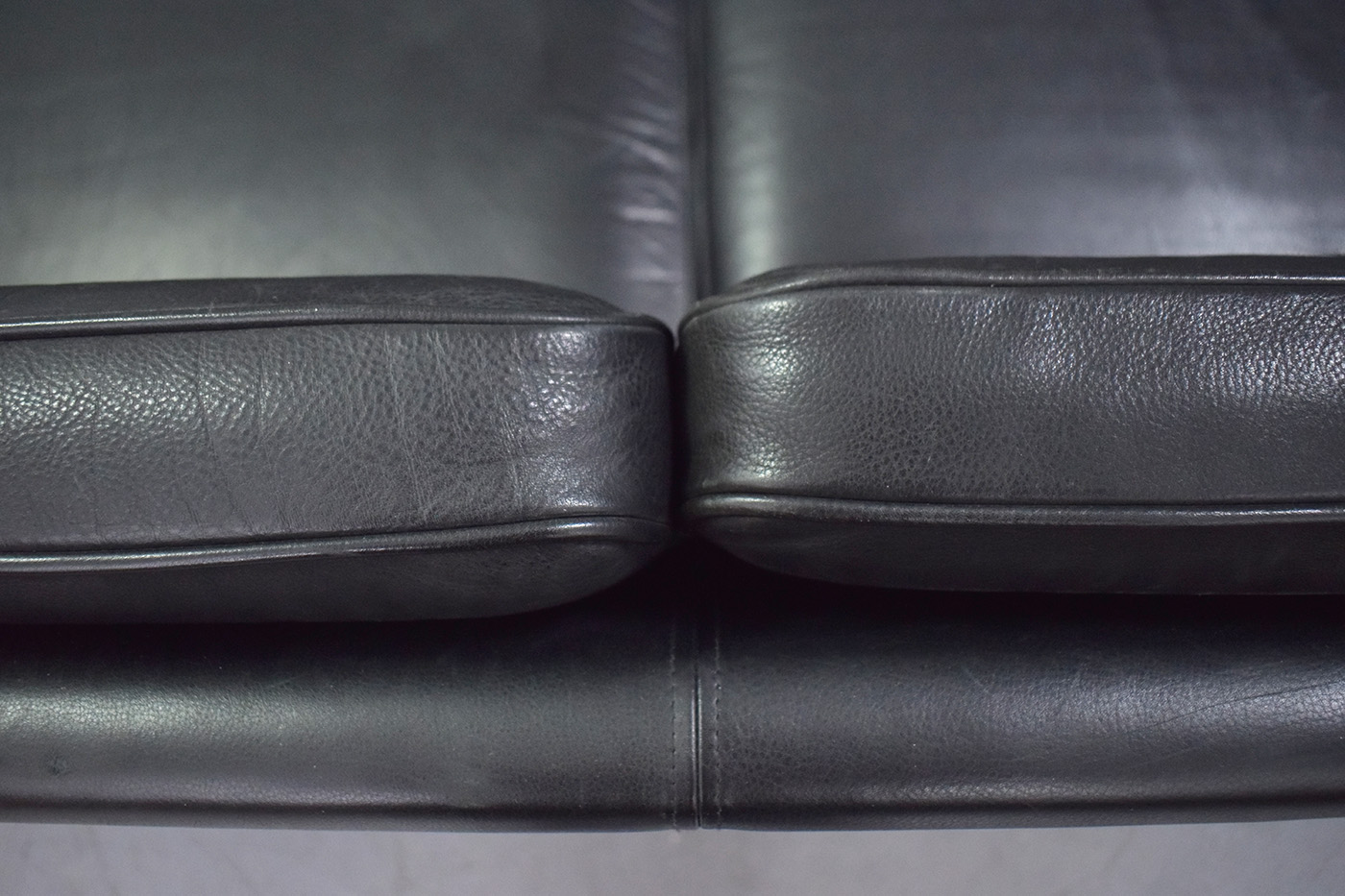 Stylish 2 seat (over-size) modern sofa with all black colour OX leather upholstery and feather filled back cushions. Designed & produced by Mogens Hansen