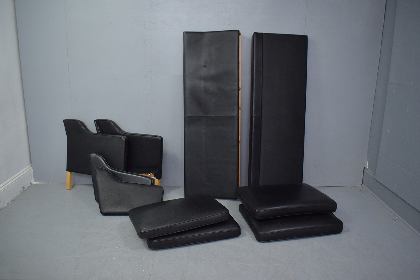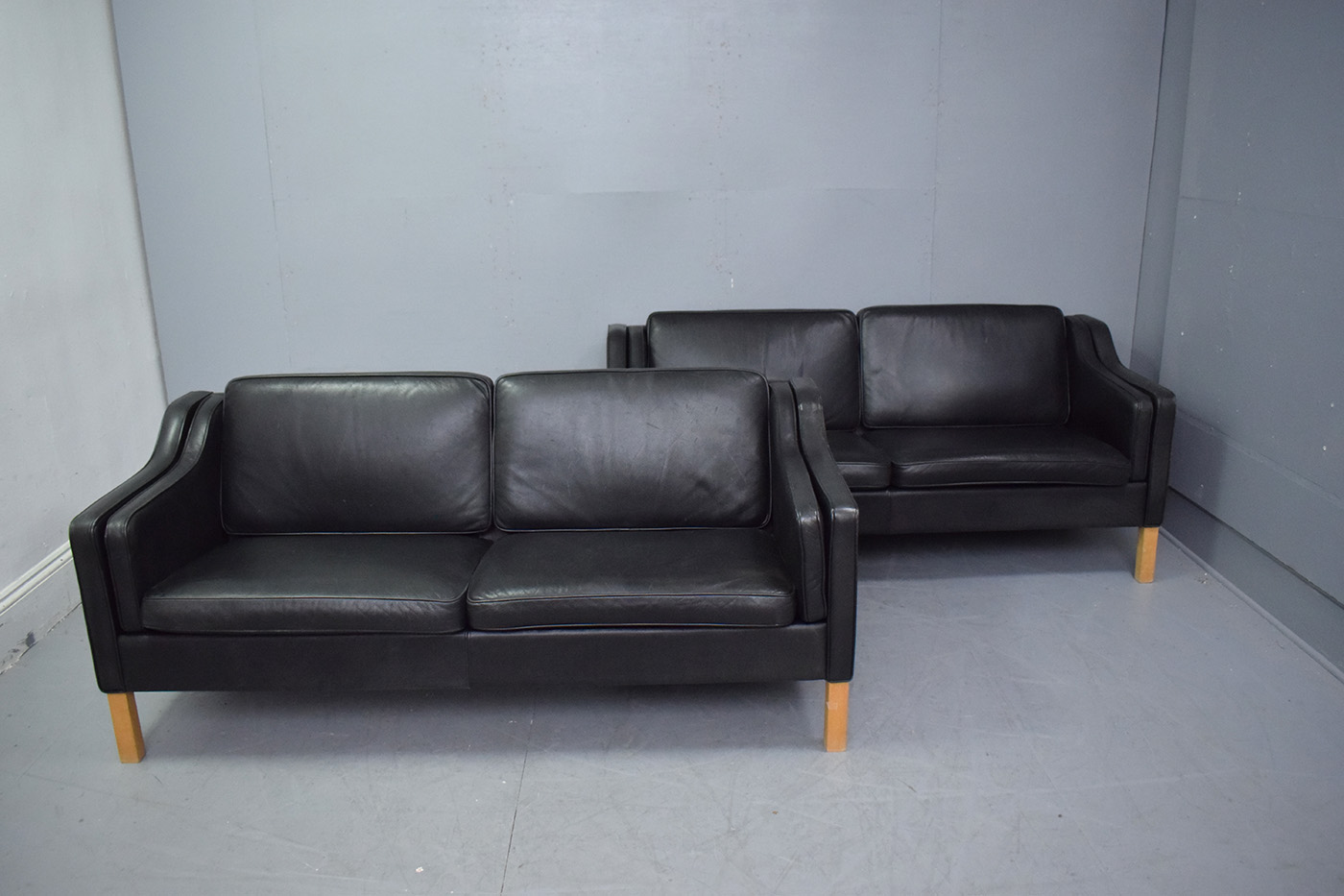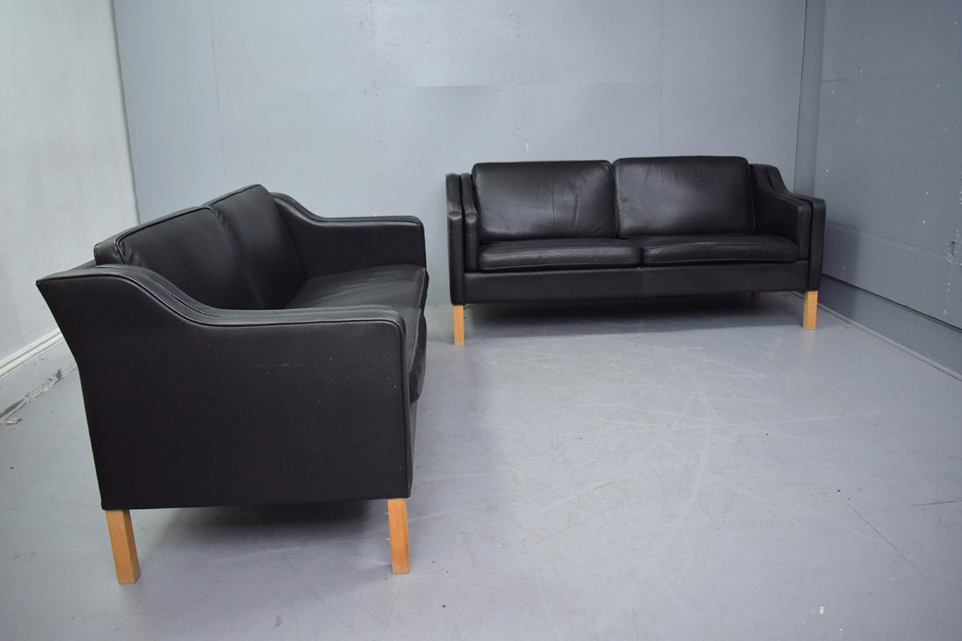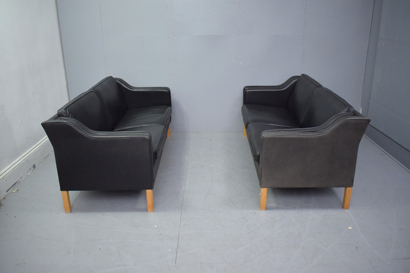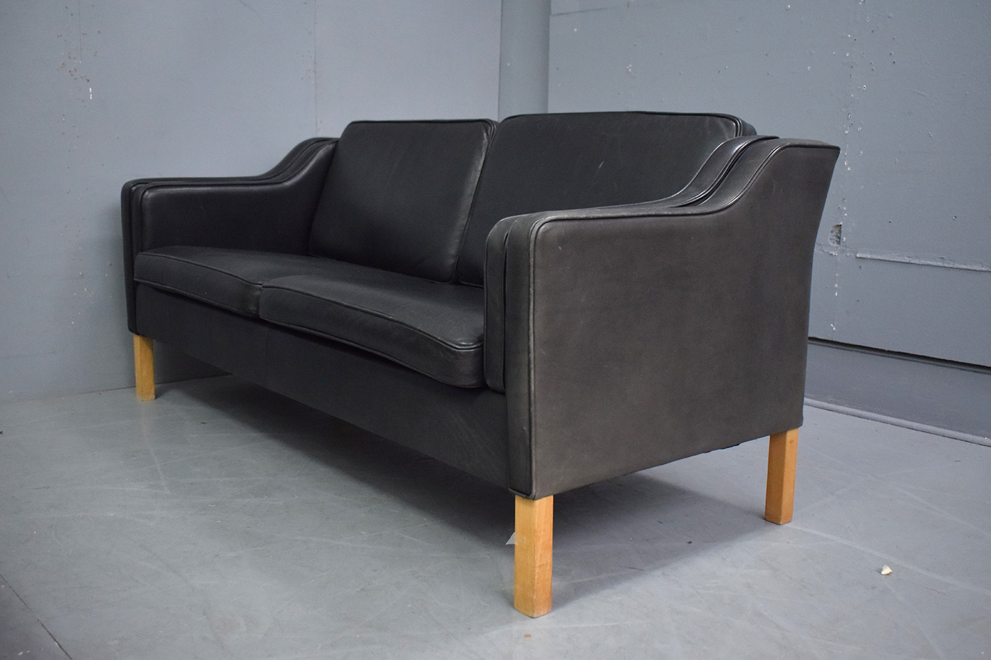 Stylish 2 seat (over-size) modern sofa with all black colour OX leather upholstery and feather filled back cushions. Designed & produced by Mogens Hansen