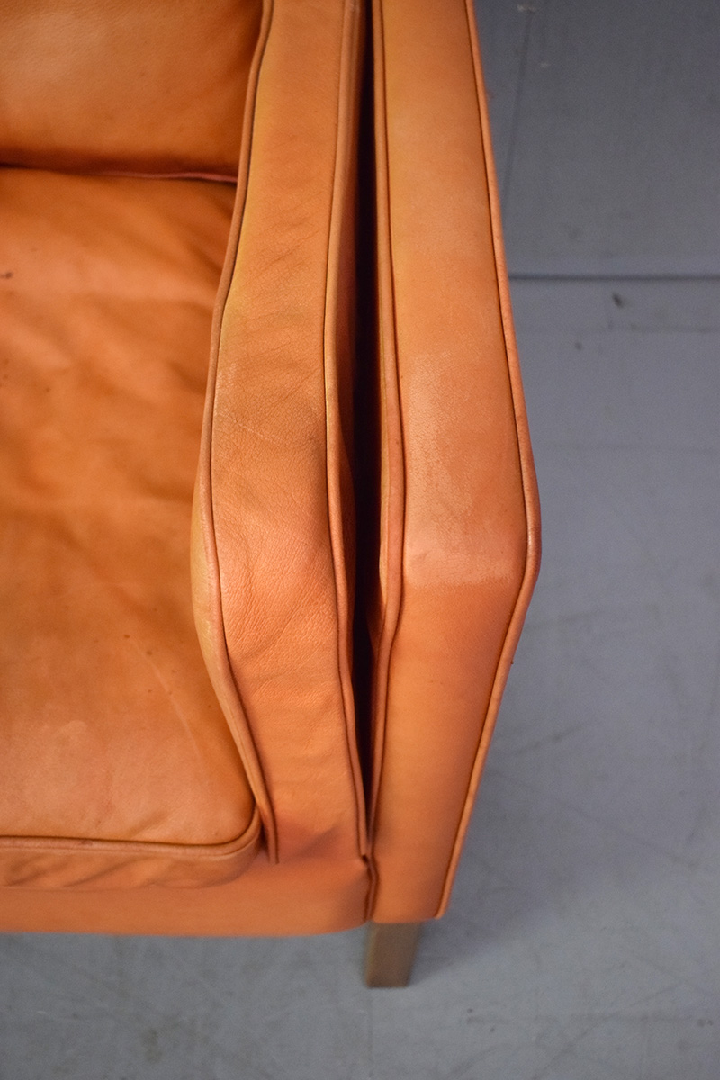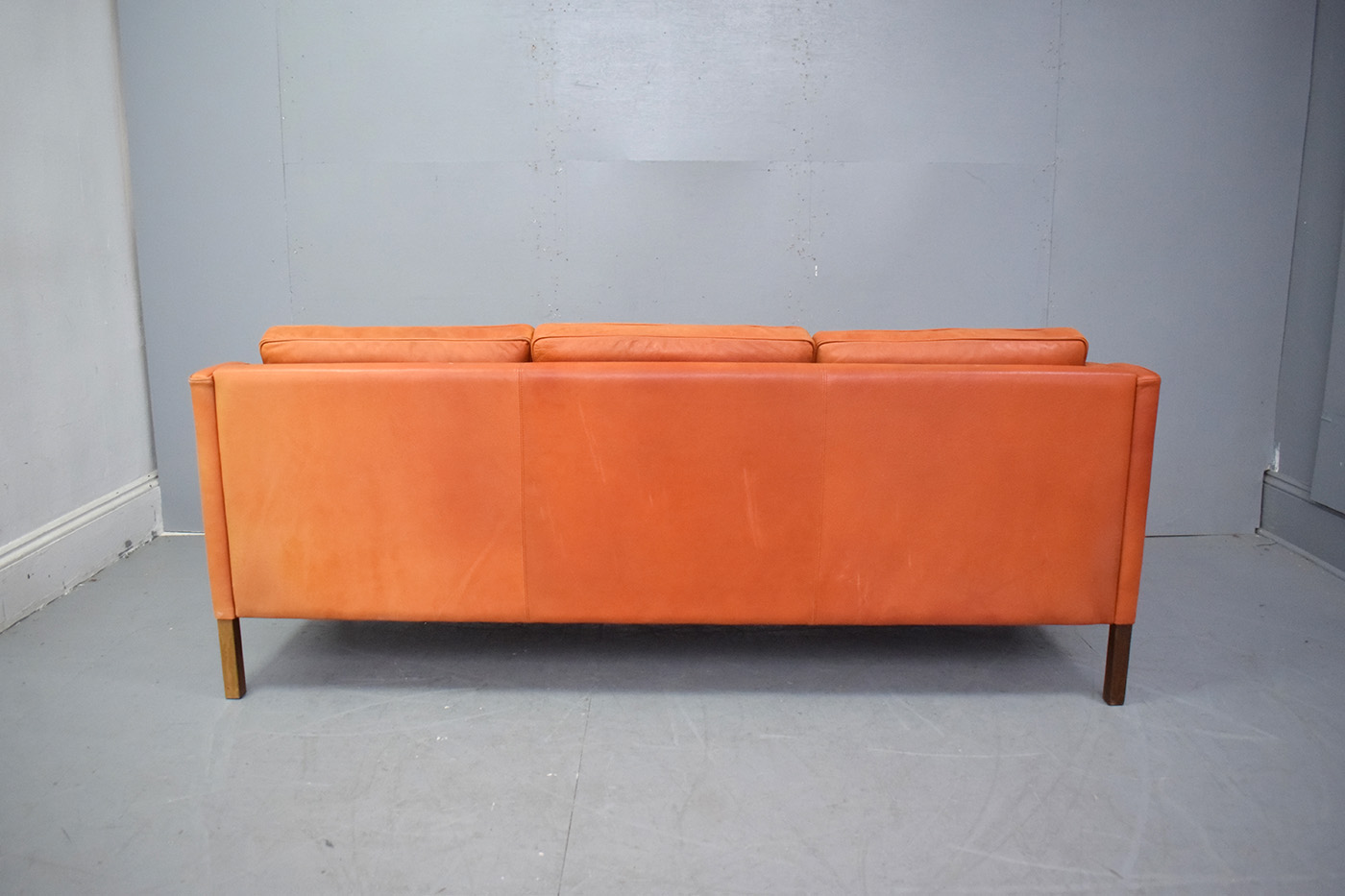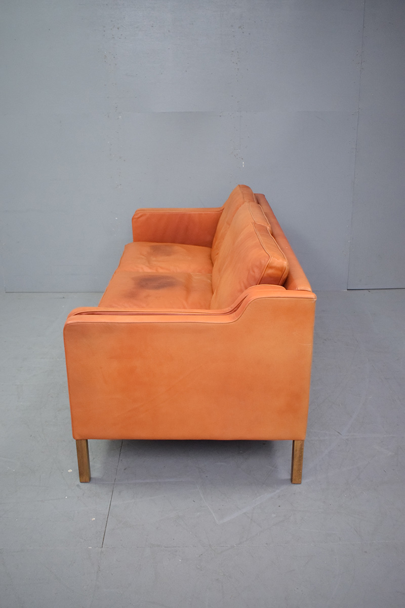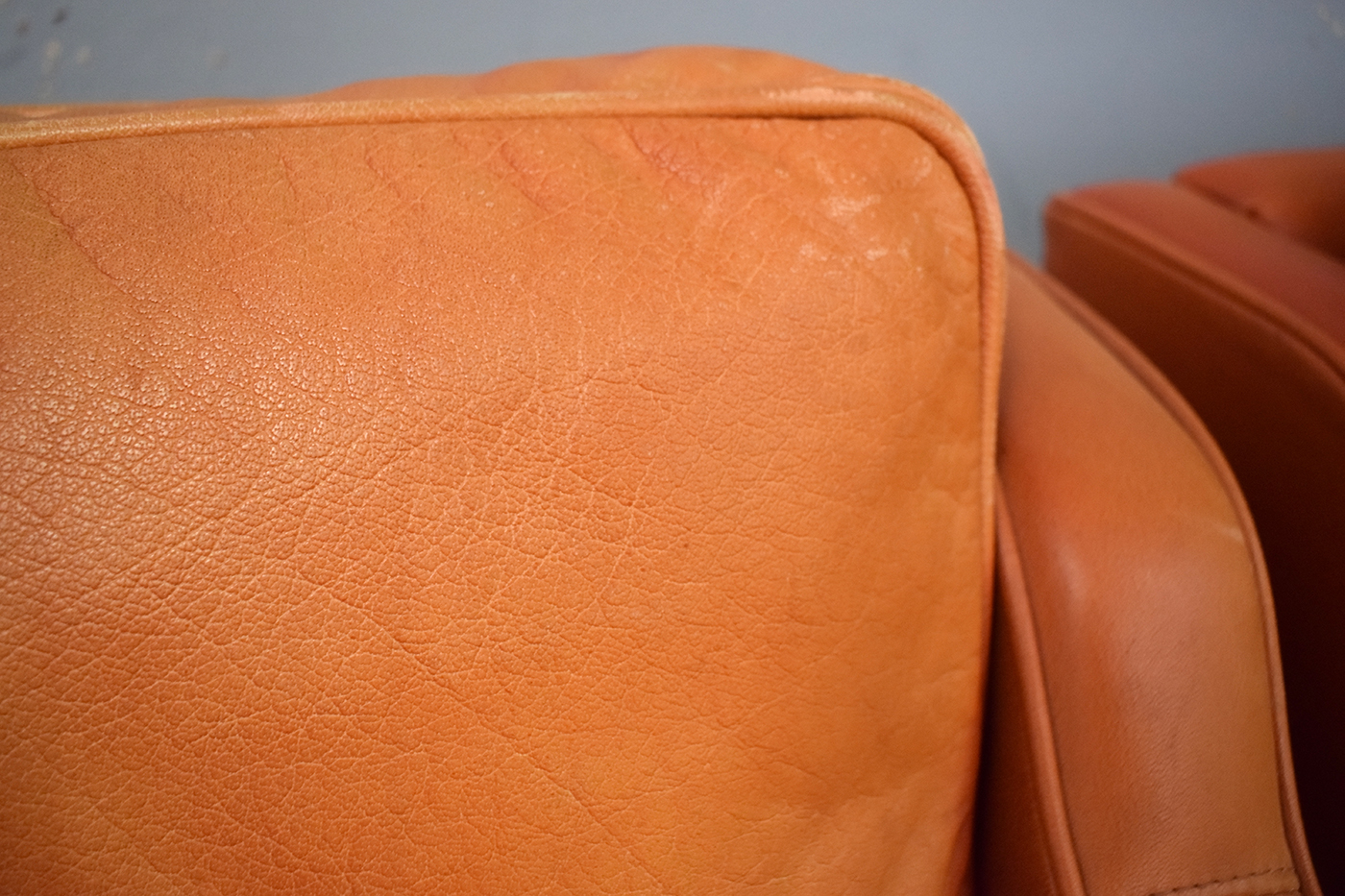 The sofa is upholstered throughout in a lovely premium ox-leather which has a unique natural grained pattern and is thicker than standard leathers making it more durable and it has aged wonderfully from a deep red to a burnt orange. Leather only gets better with age and builds patina the more it is used.