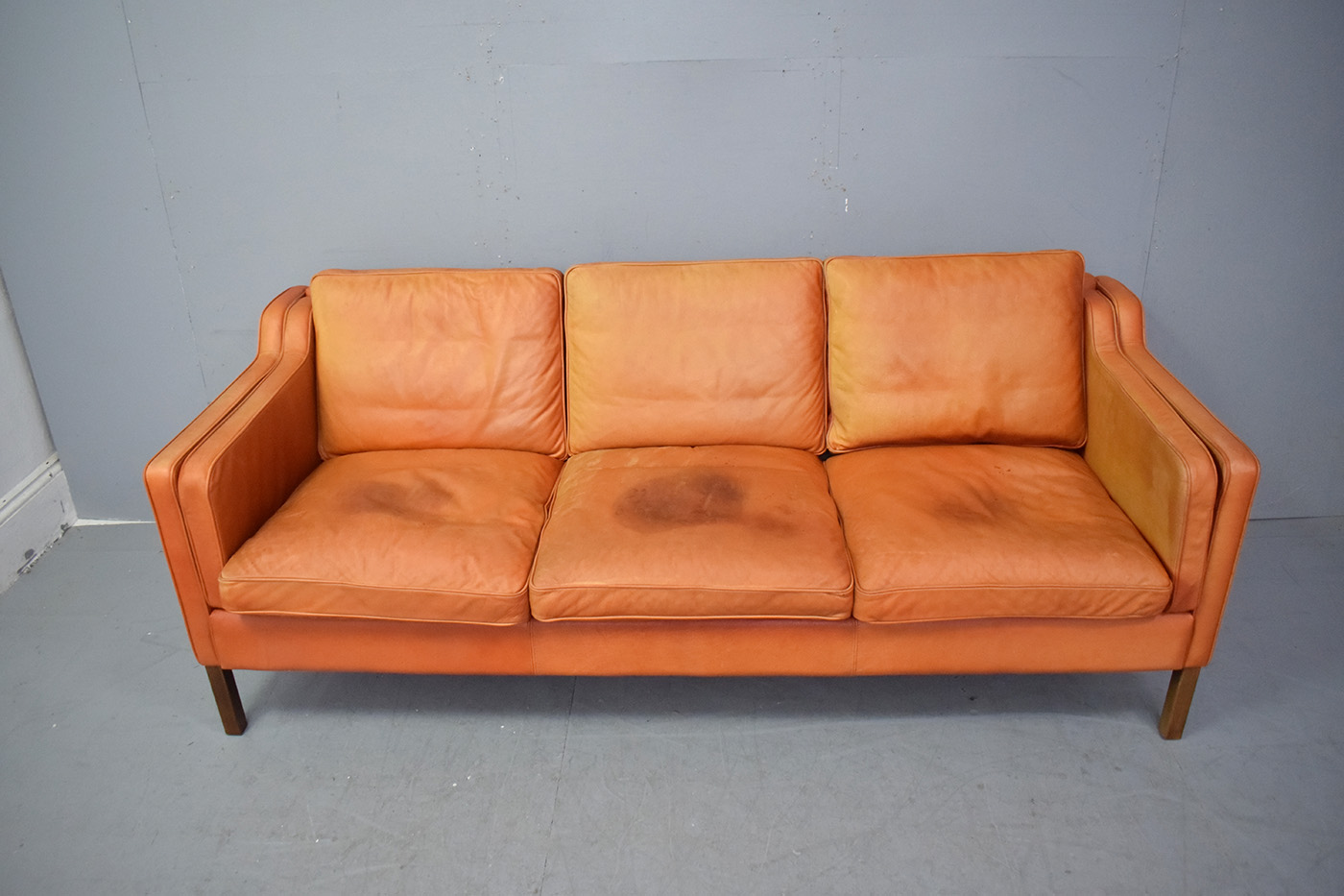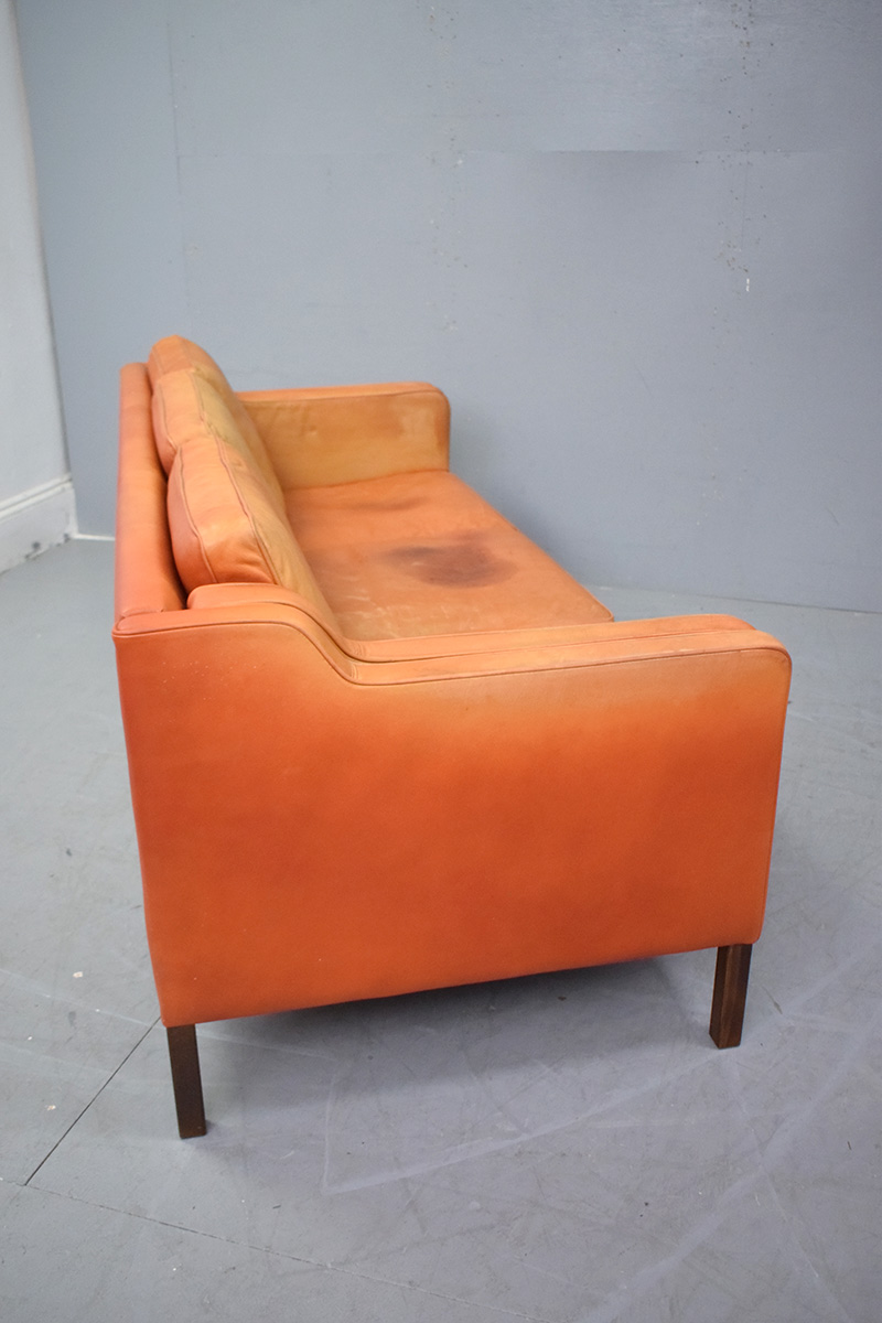 Vintage leather 3 seater box frame EVA sofa upholstered in ox-leather which has uniquely faded from red to orange and luxurious feather filled cushions produced by Stouby, Denmark