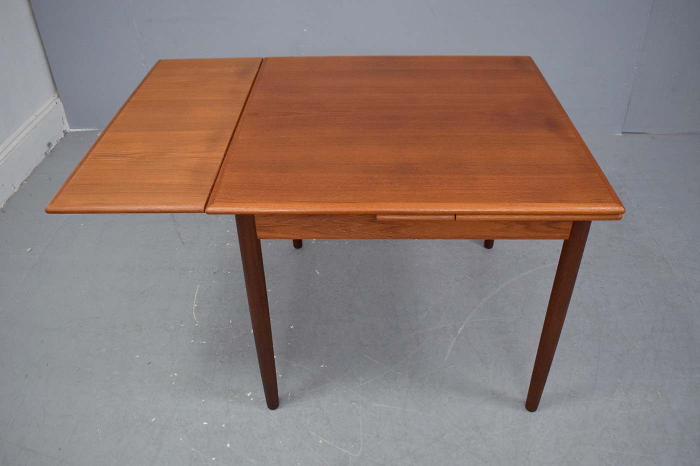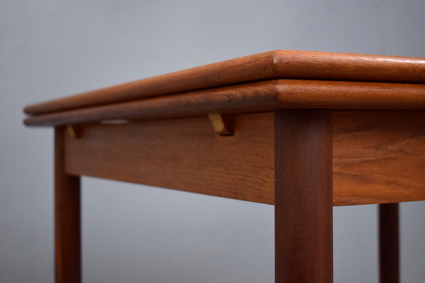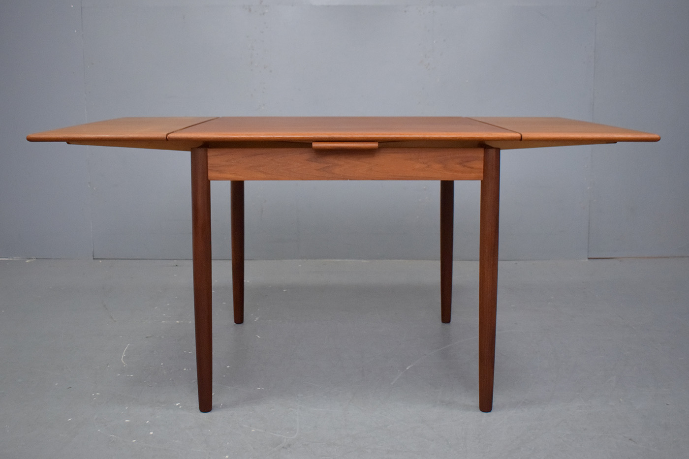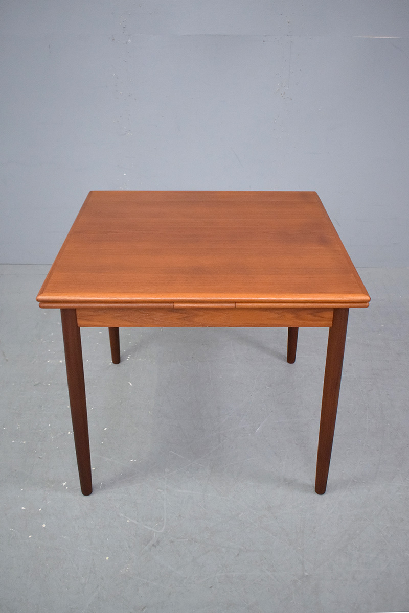 Classic vintage square-top dining table in teak featuring 2 pull out leaves made by Danish Mobelfabrik, 1960s.