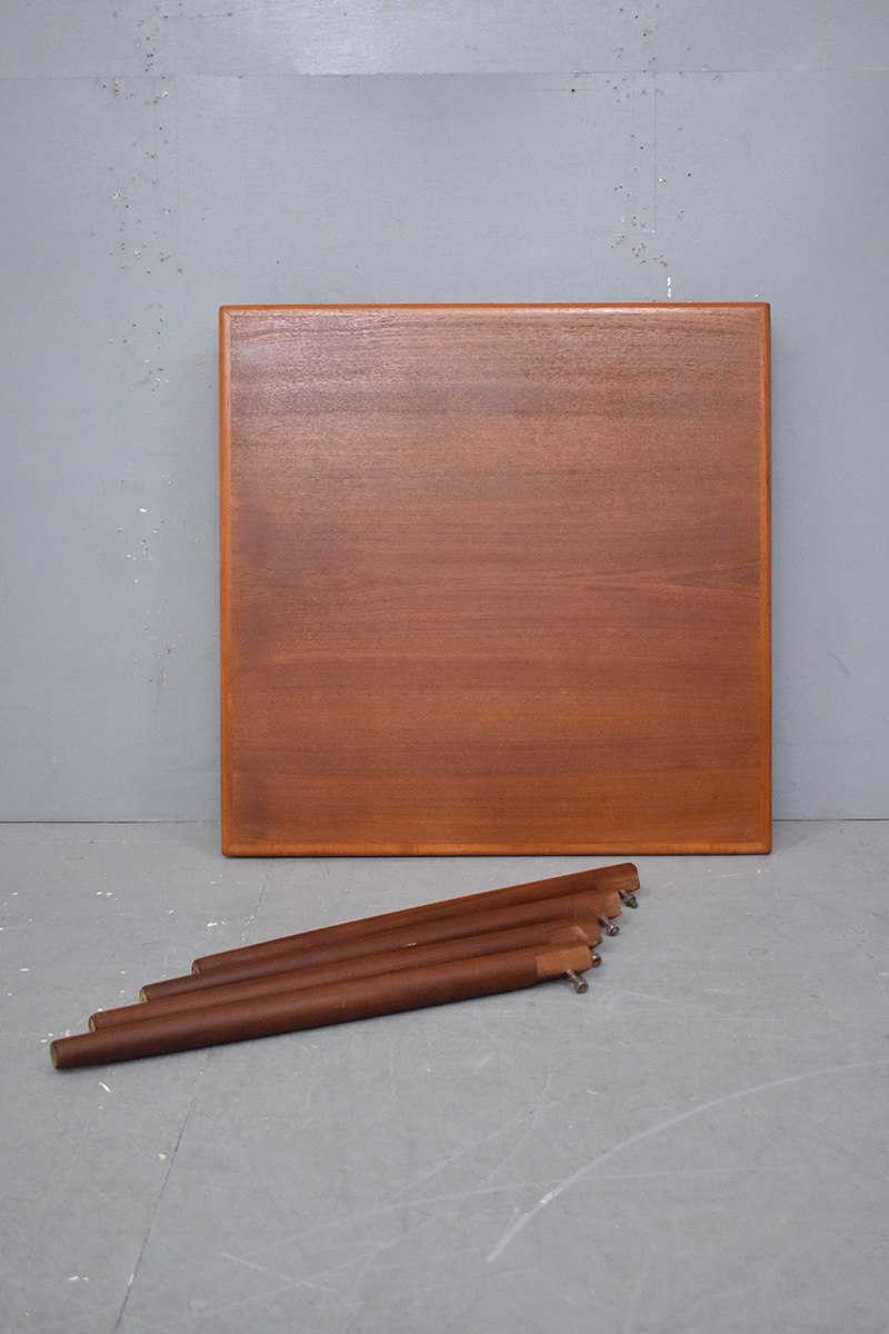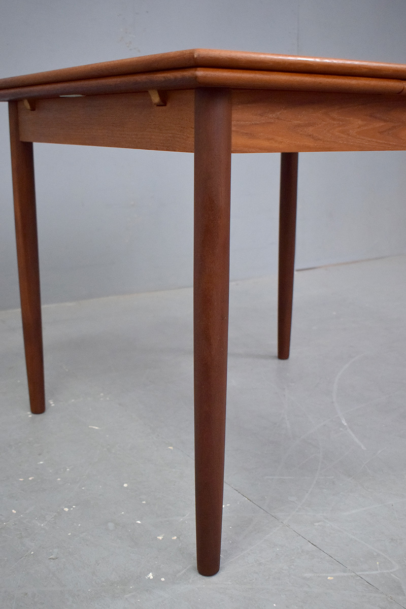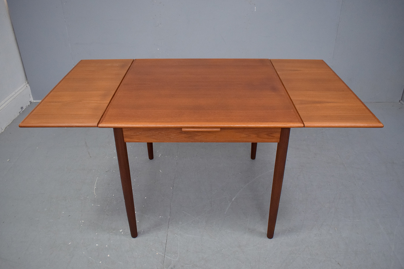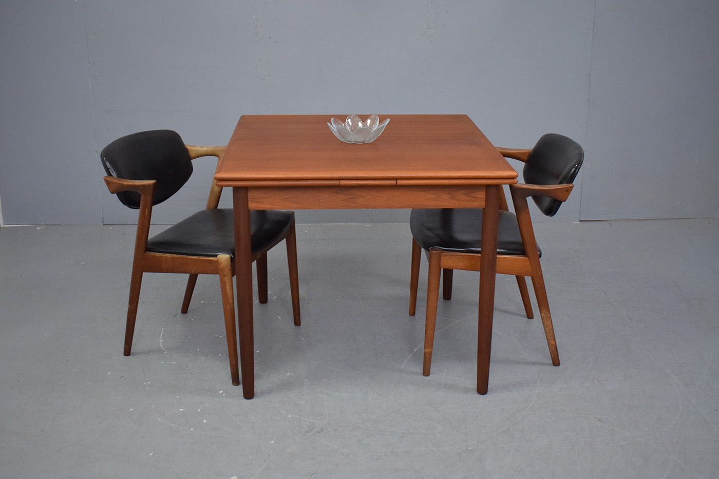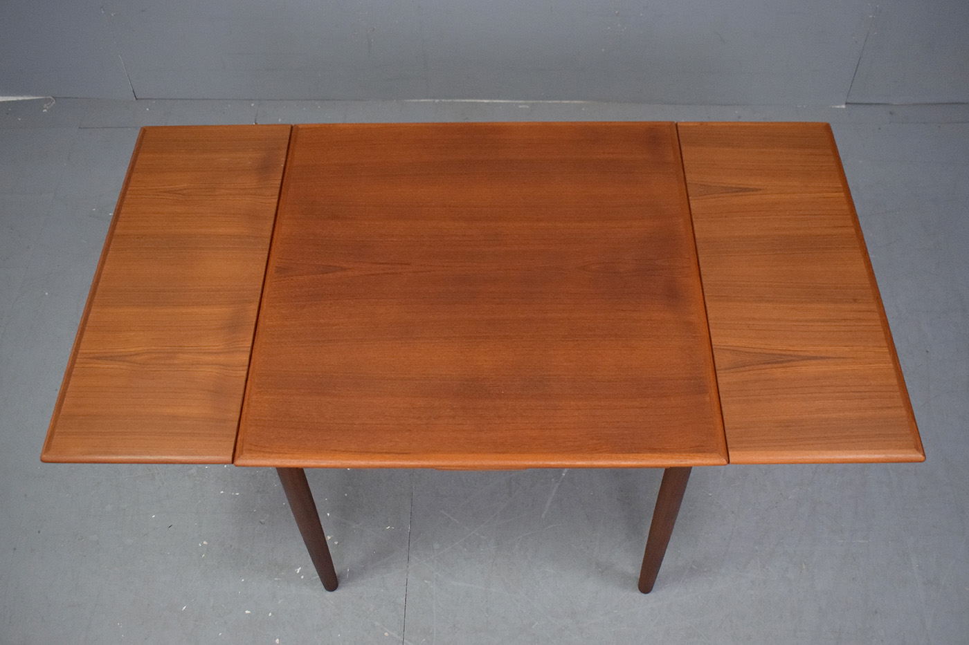 Classic vintage square-top dining table in teak featuring 2 pull out leaves made by Danish Mobelfabrik, 1960s.