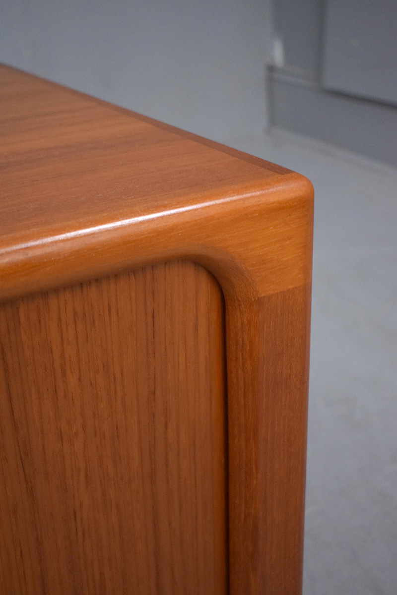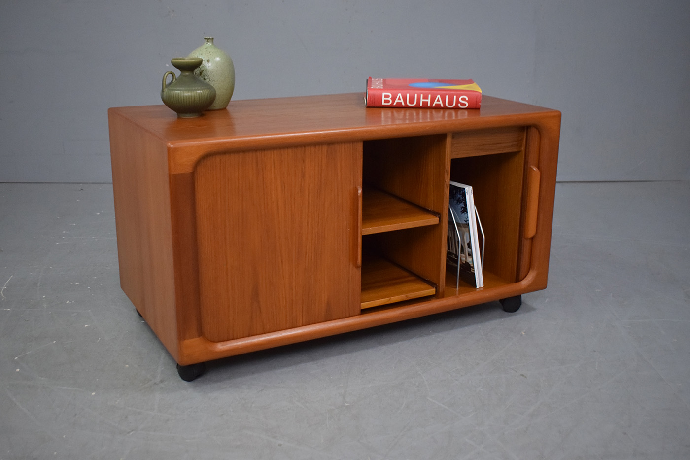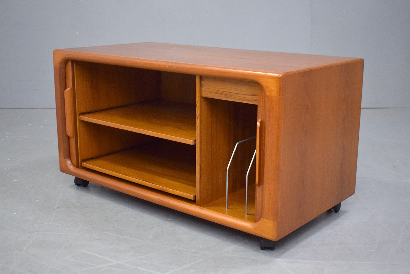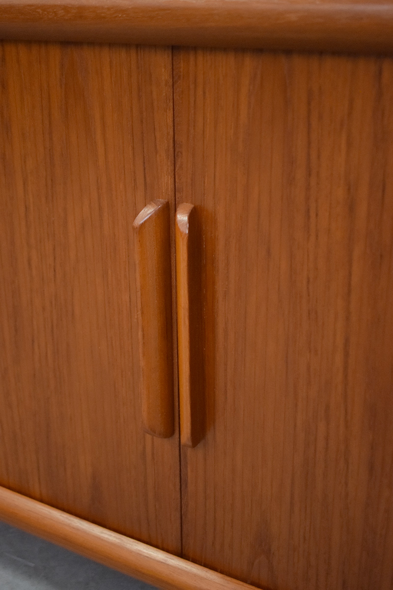 Compact vintage teak media cabinet with sliding tambour doors produced by Dyrlund Smith, 1970s.
