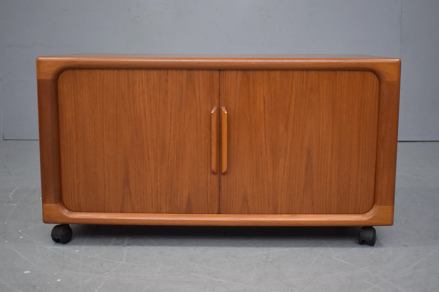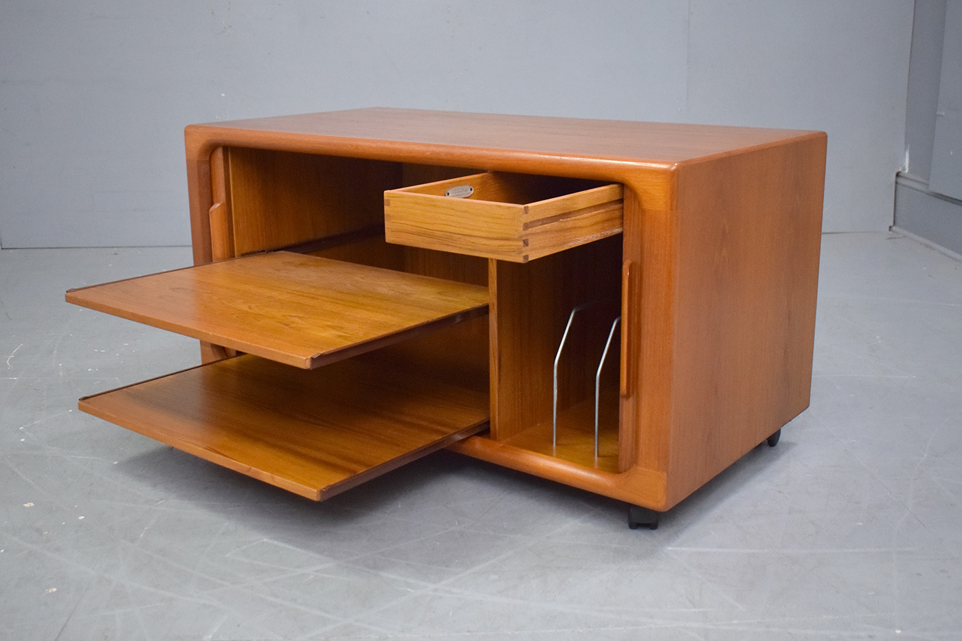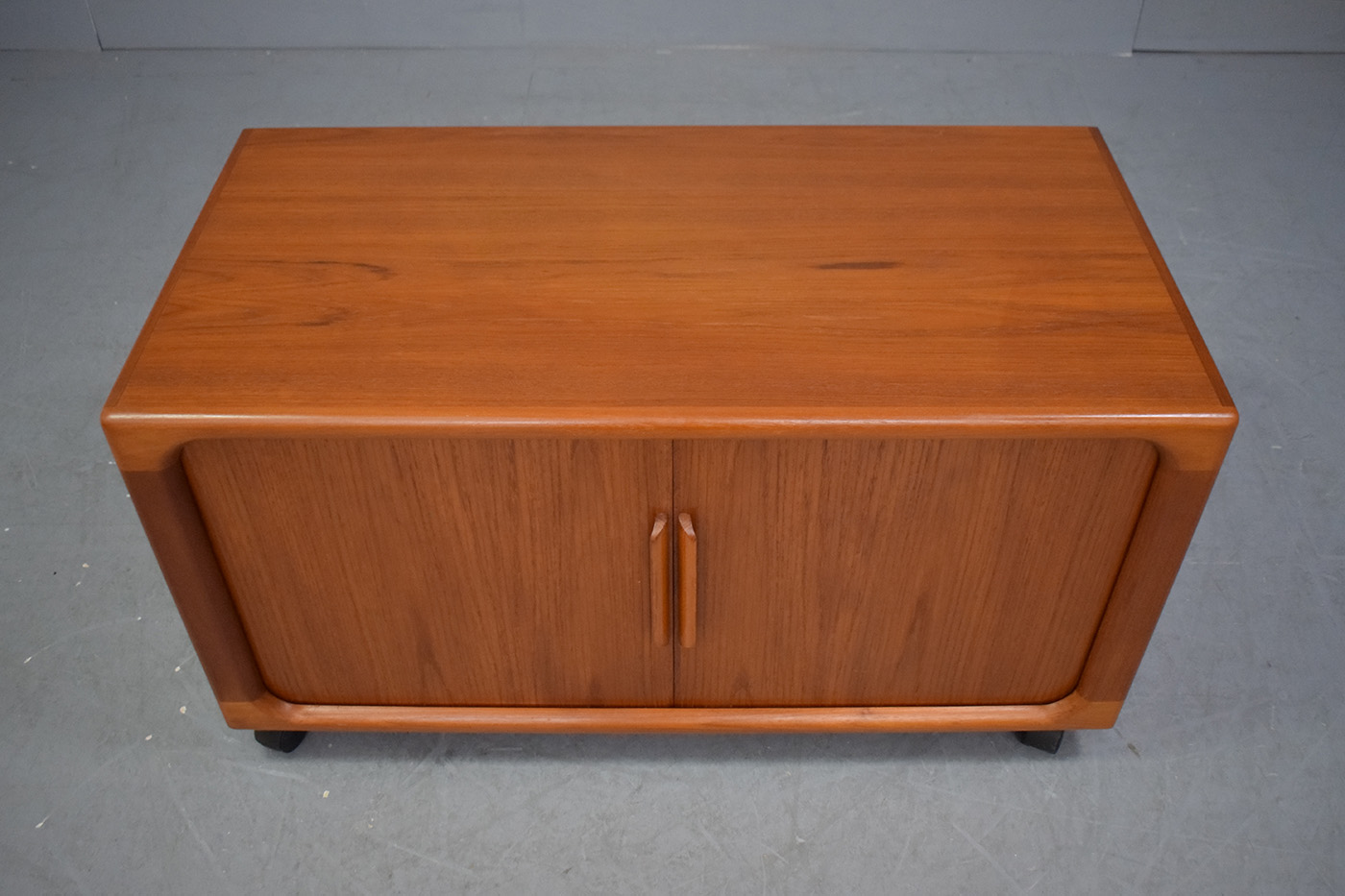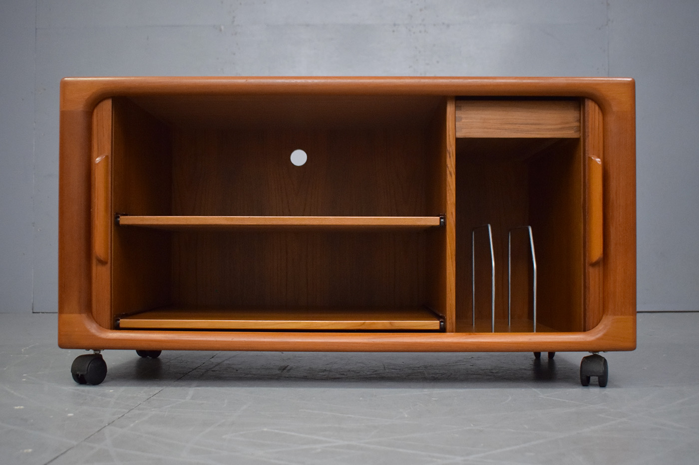 Compact vintage teak media cabinet with sliding tambour doors produced by Dyrlund Smith, 1970s.