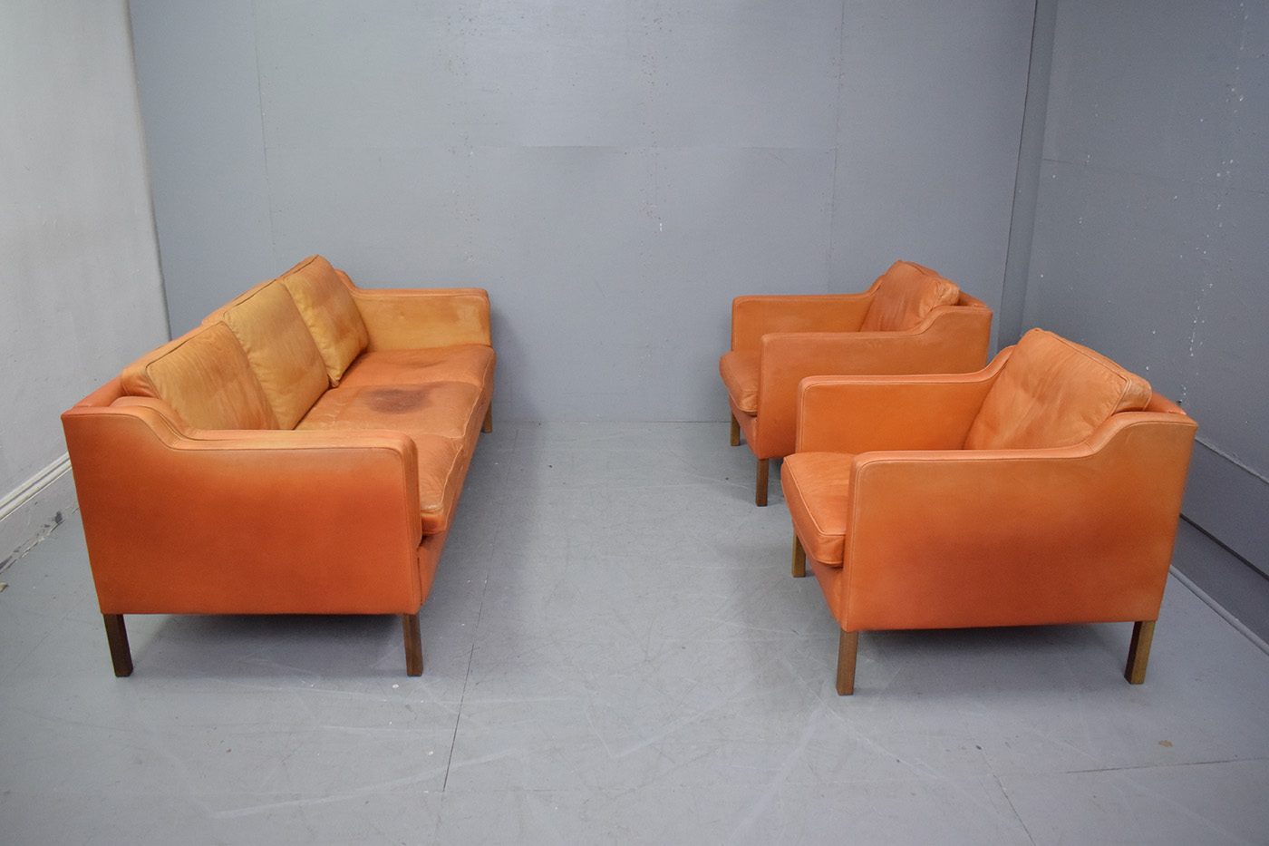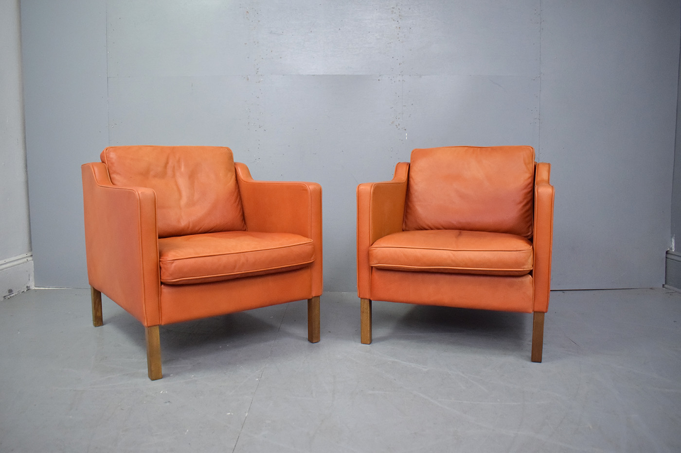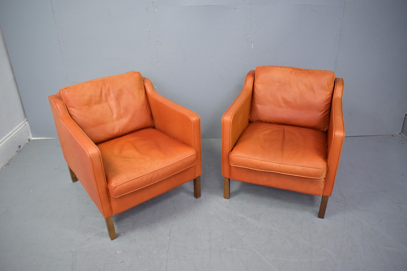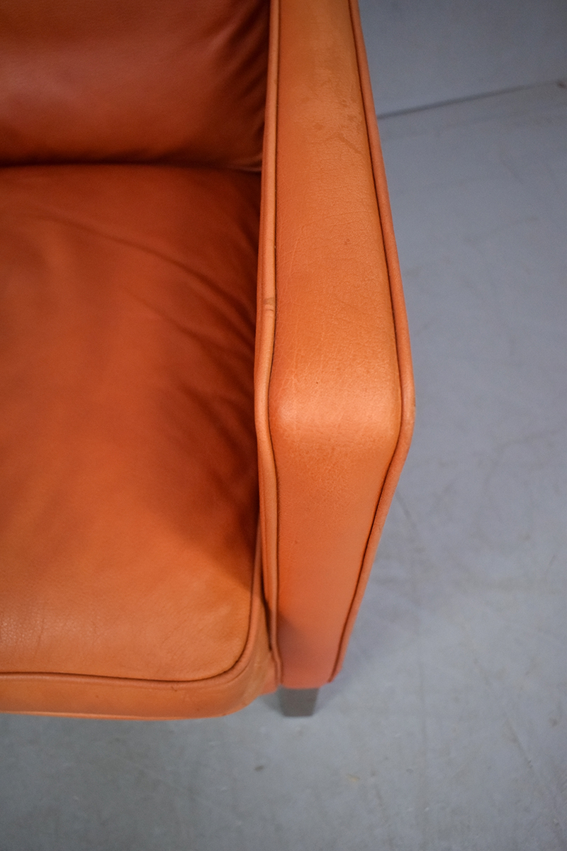 The armchair is upholstered throughout in a lovely premium ox-leather which has a unique natural grained pattern and is thicker than standard leathers making it more durable and it has aged wonderfully from a deep red to a burnt orange. Leather only gets better with age and builds patina the more it is used.