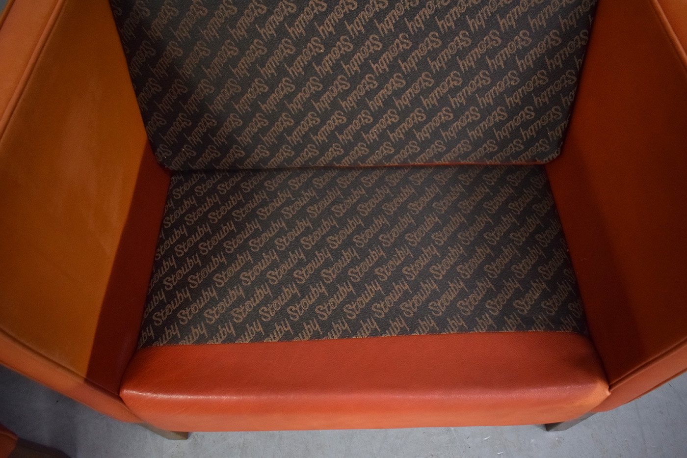 Vintage leather box frame EVA armchair upholstered in ox-leather which has uniquely faded from red to orange and luxurious feather filled cushions produced by Stouby, Denmark