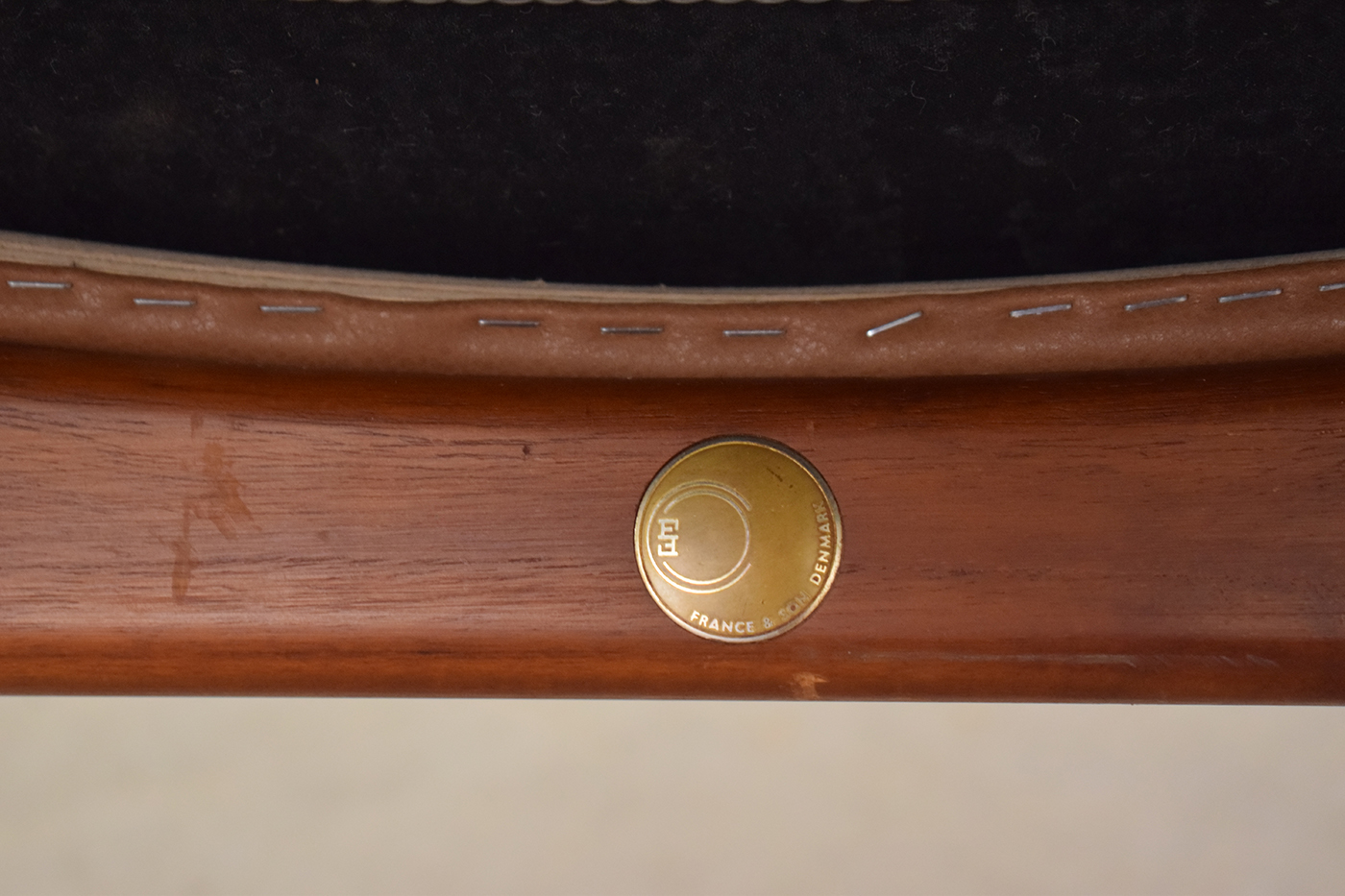 The tan colour leather upholstery is new and compliments the rich teak frame well.