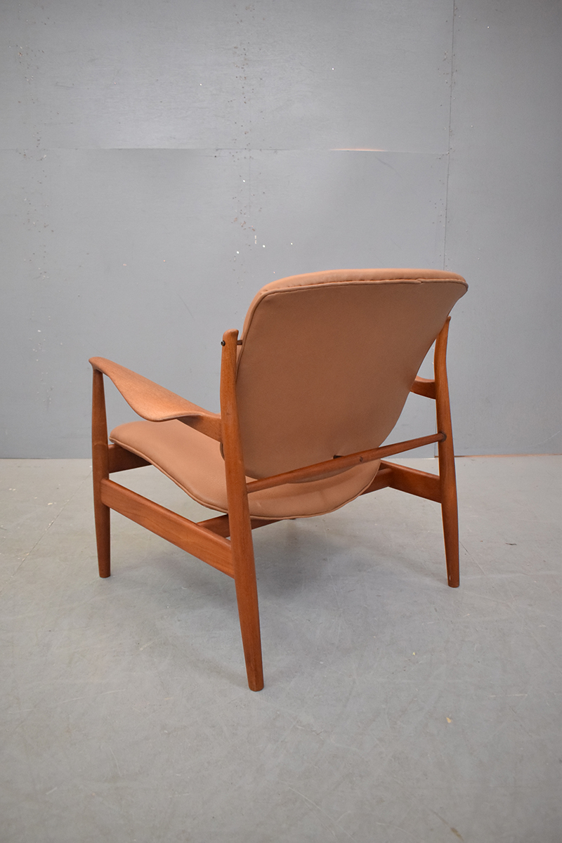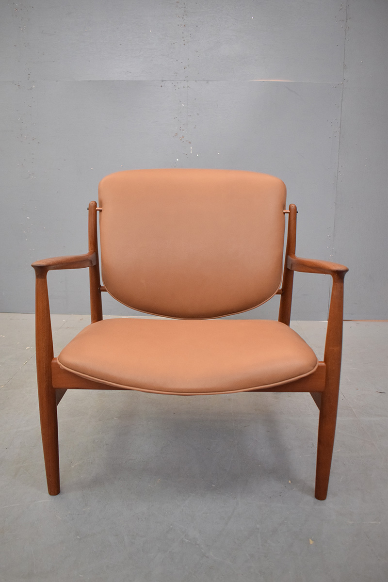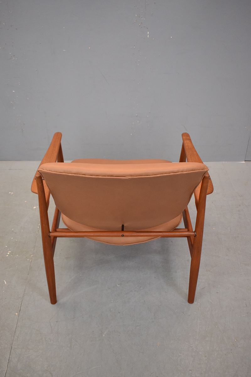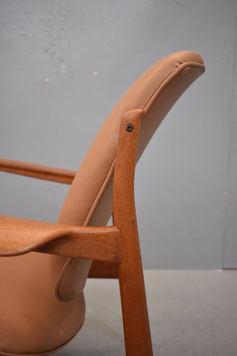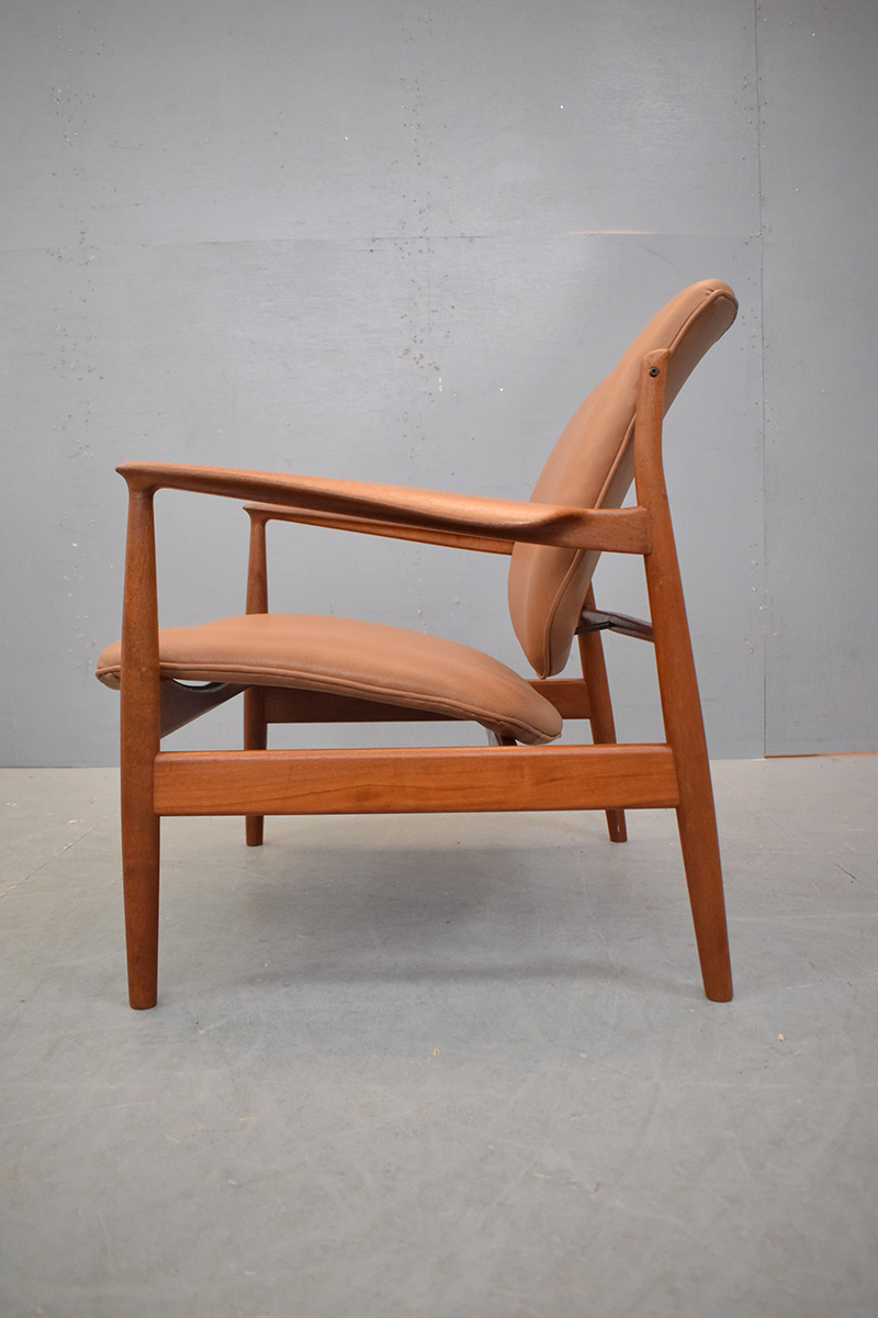 Vintage teak frame armchair with new tan leather upholstery designed by Finn Juhl 1956 and produced by France & son model FD136