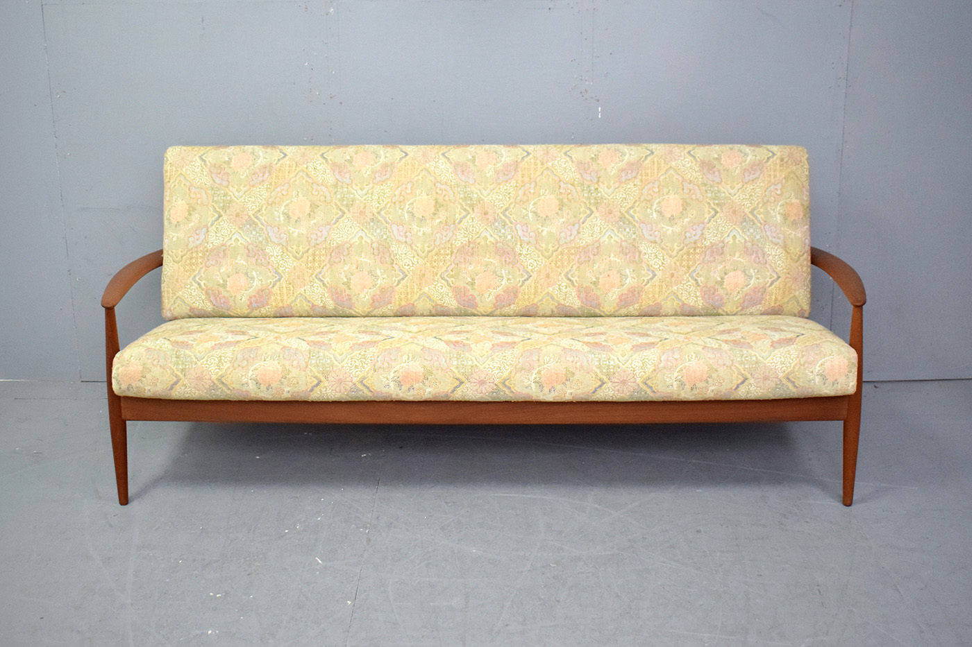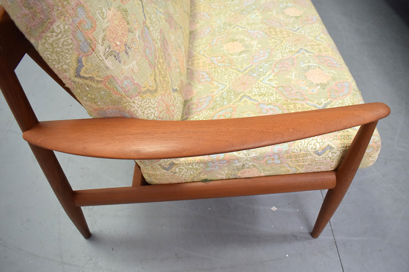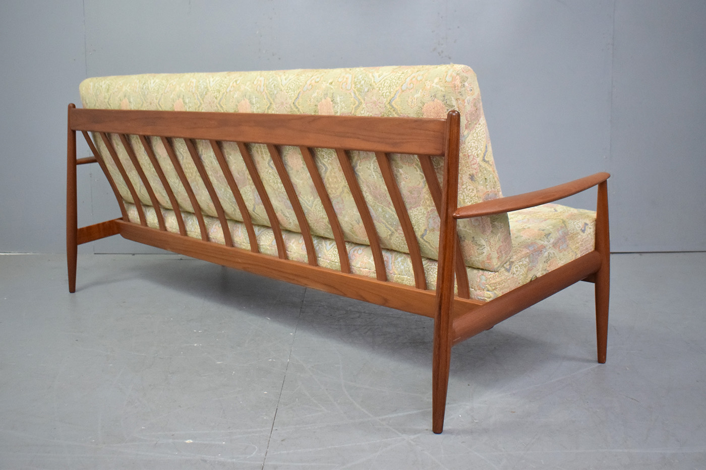 Vintage Grete Jalk designed teak frame 3 seat sofa with new upholsterd sprung single cushions produced by France & Daverkosen 1961