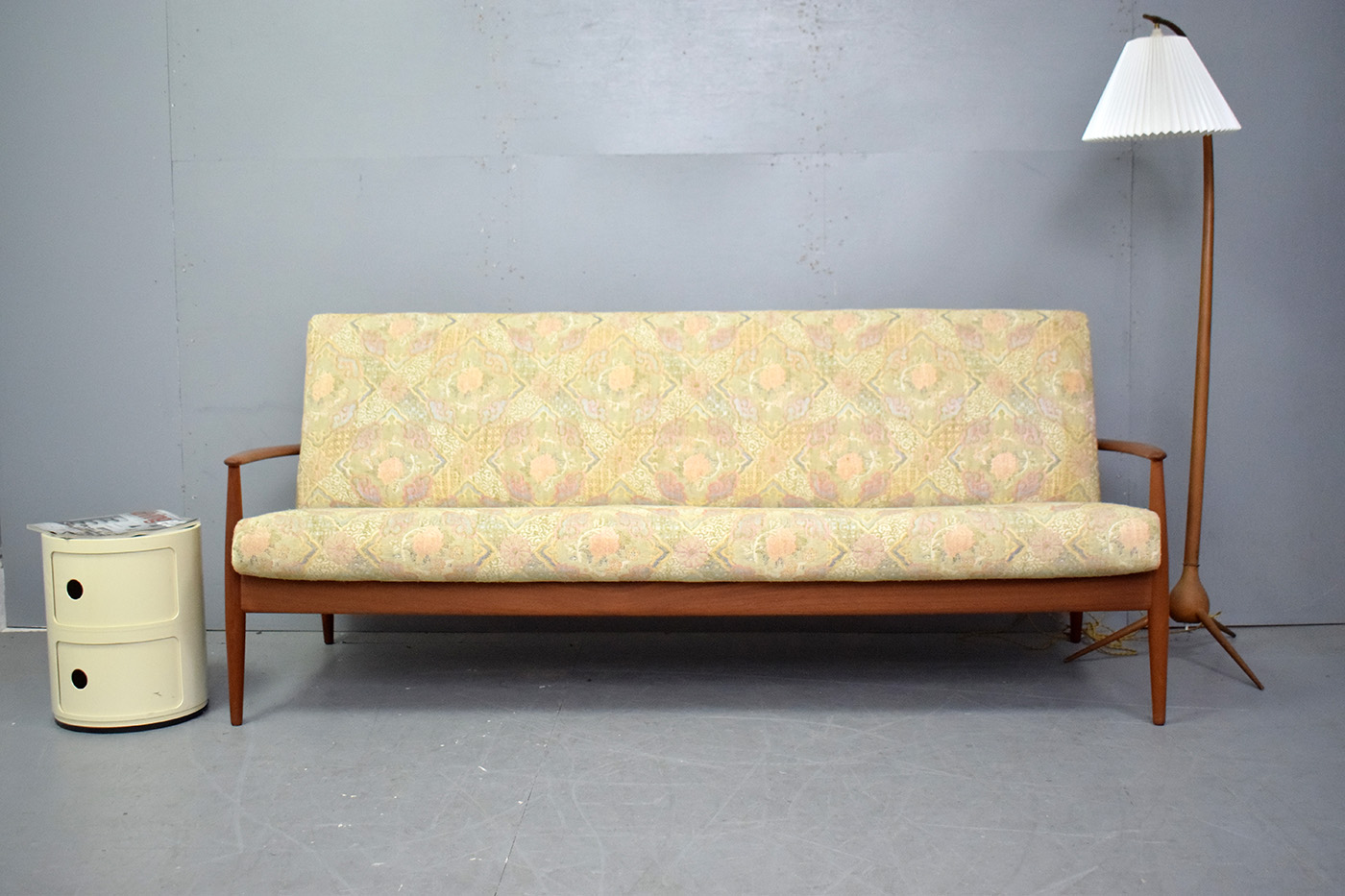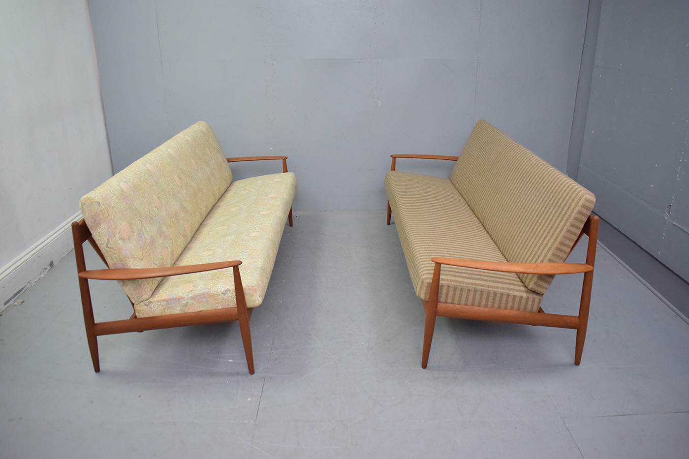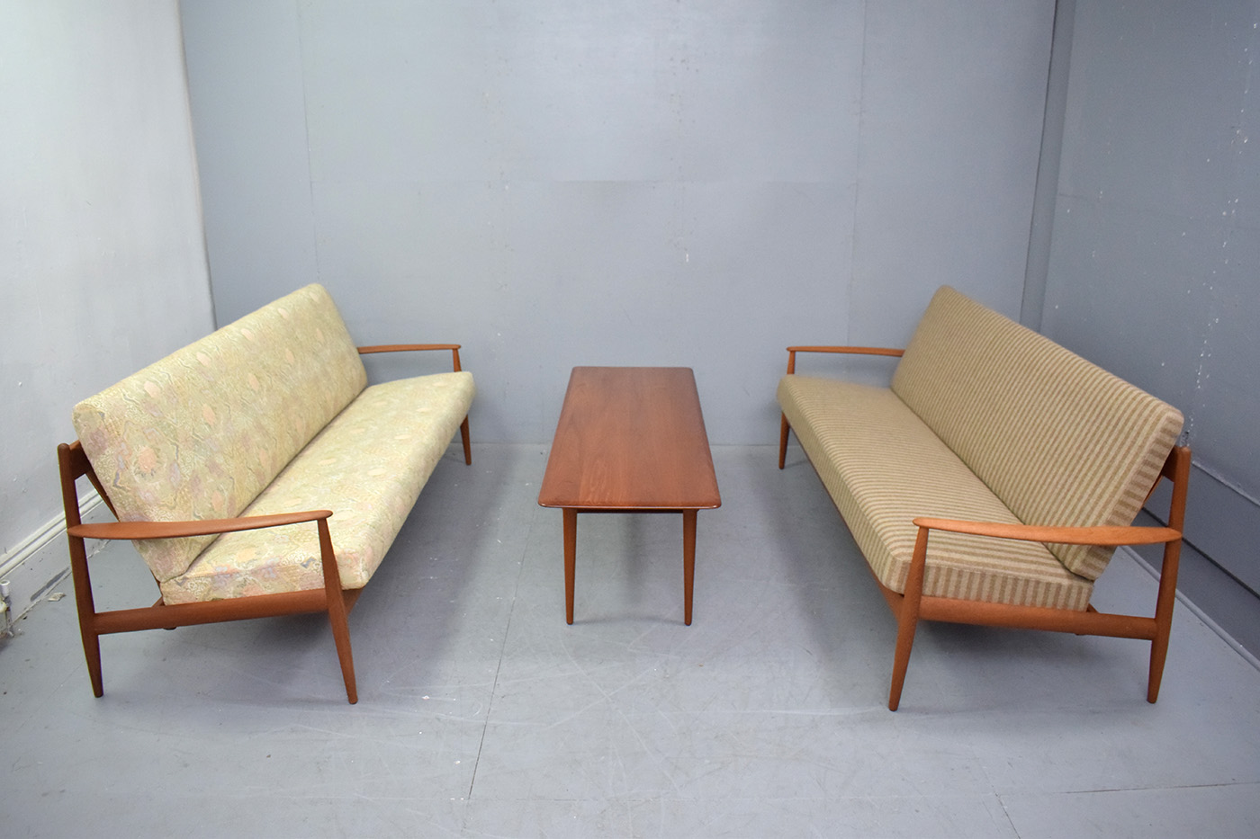 Vintage Grete Jalk designed teak frame 3 seat sofa with new upholsterd sprung single cushions produced by France & Daverkosen 1961