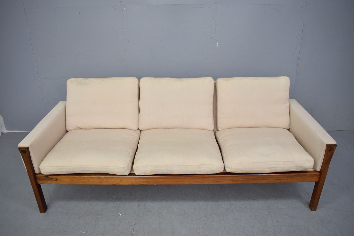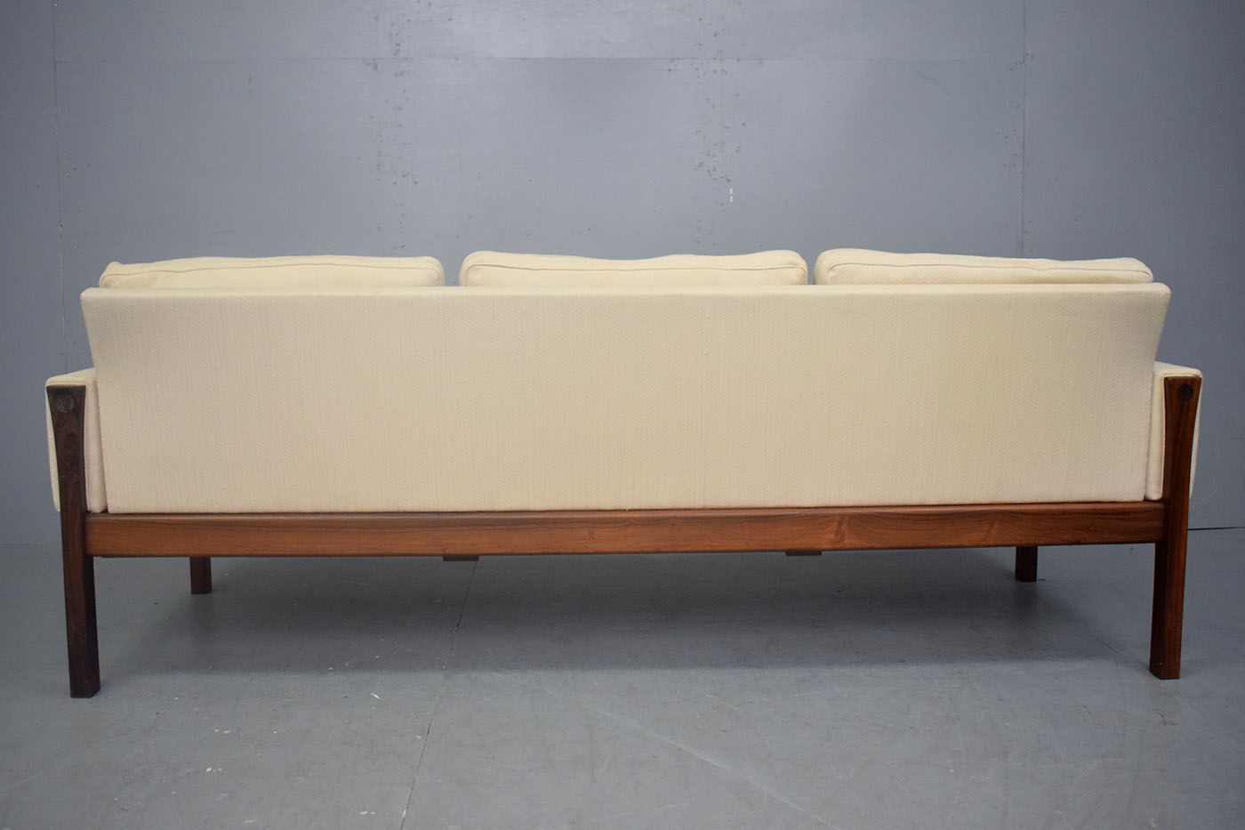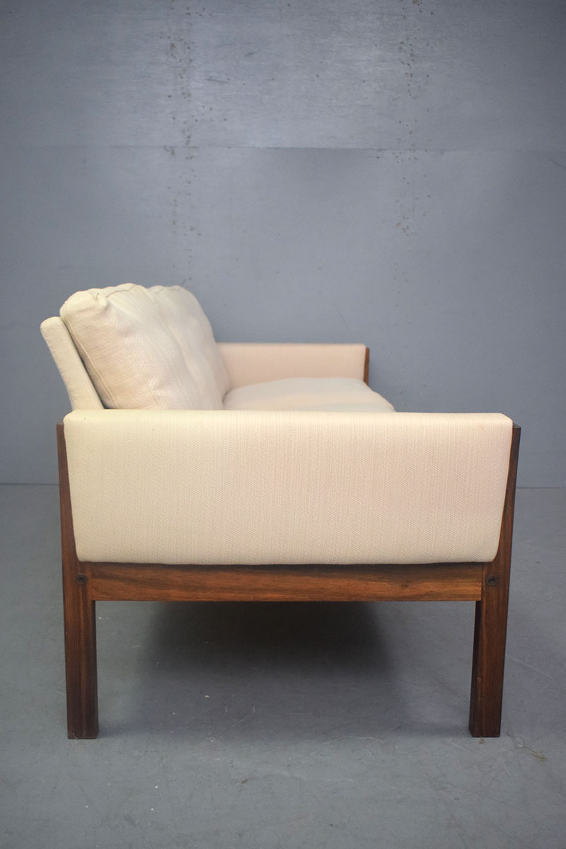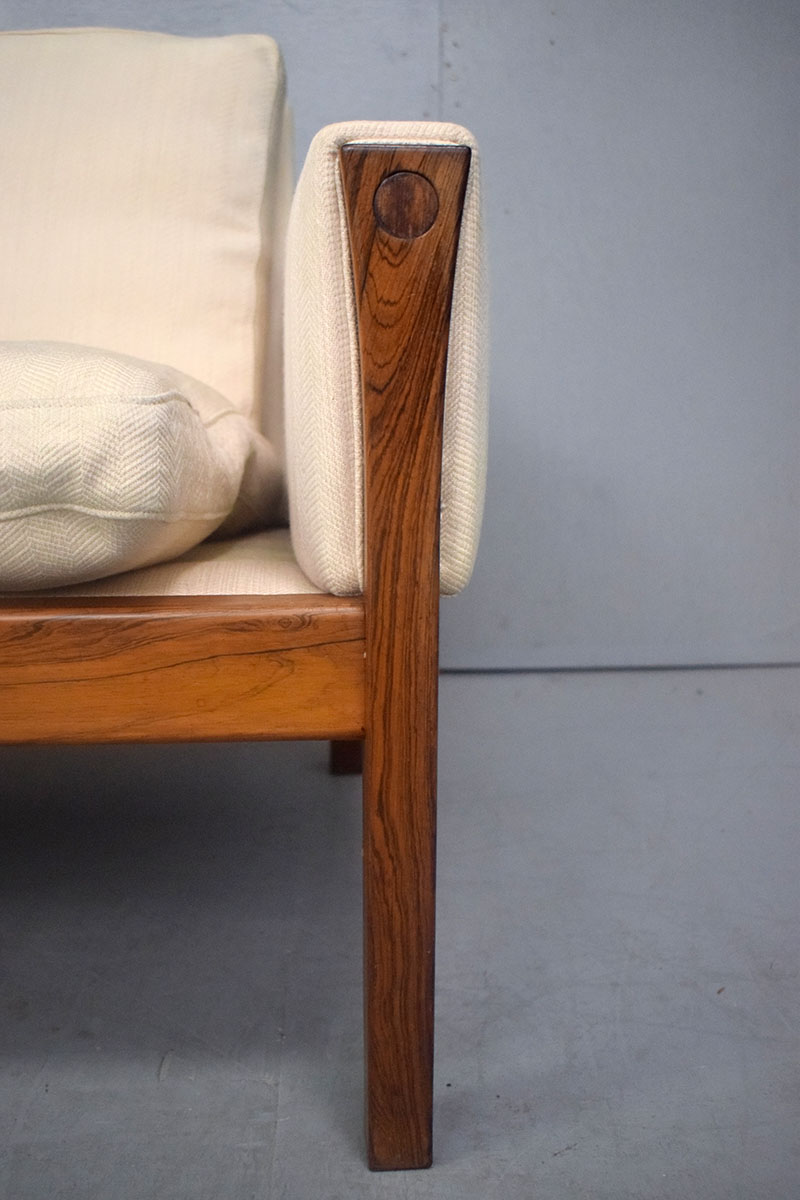 The sofa is upholstered in a cream wool which contrasts the dark rosewood superbly, letting the rich grain of the timber really stand out.
