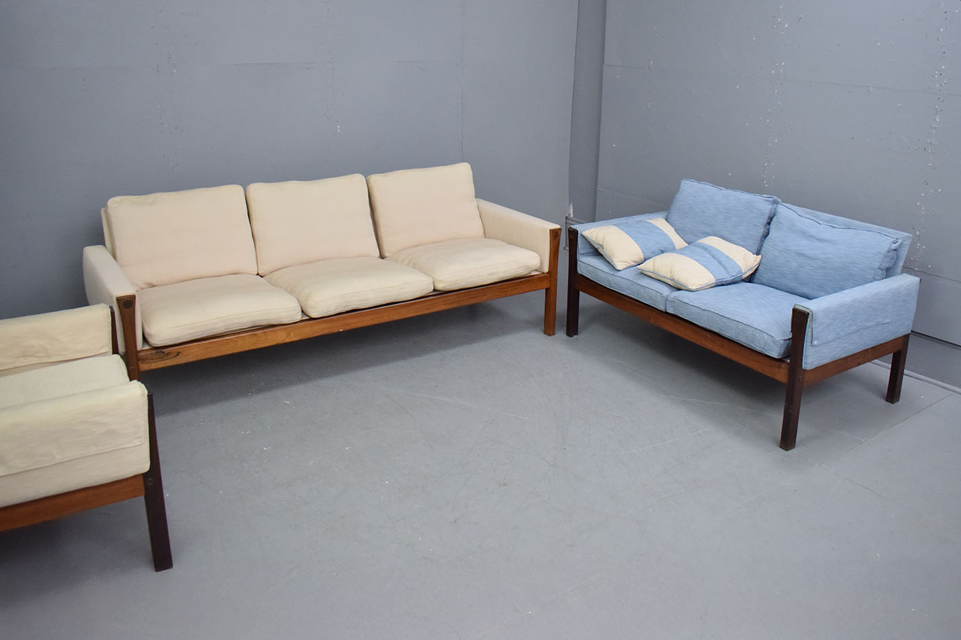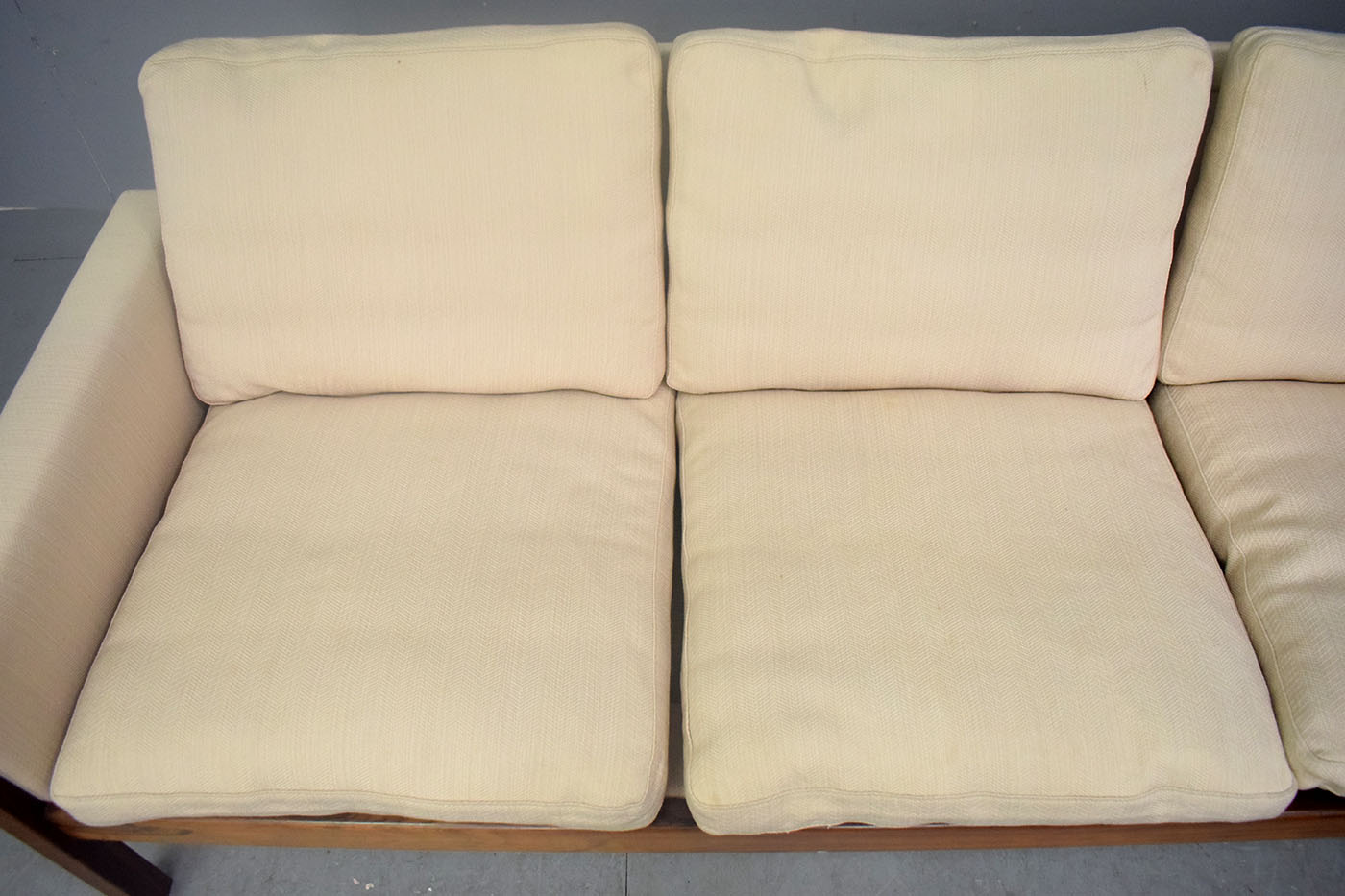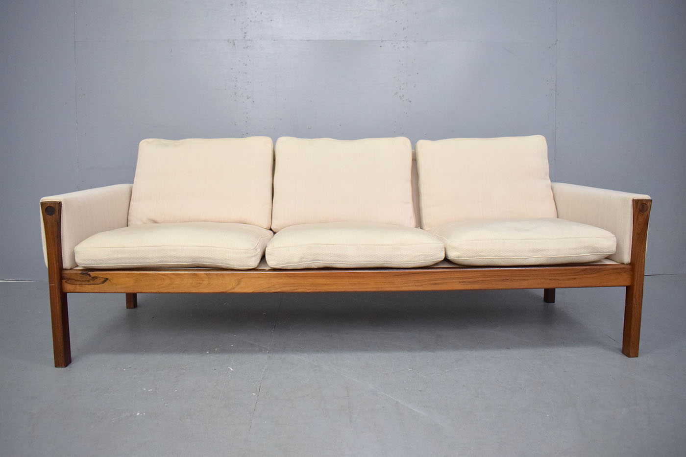 The sofa is upholstered in a cream wool which contrasts the dark rosewood superbly, letting the rich grain of the timber really stand out.