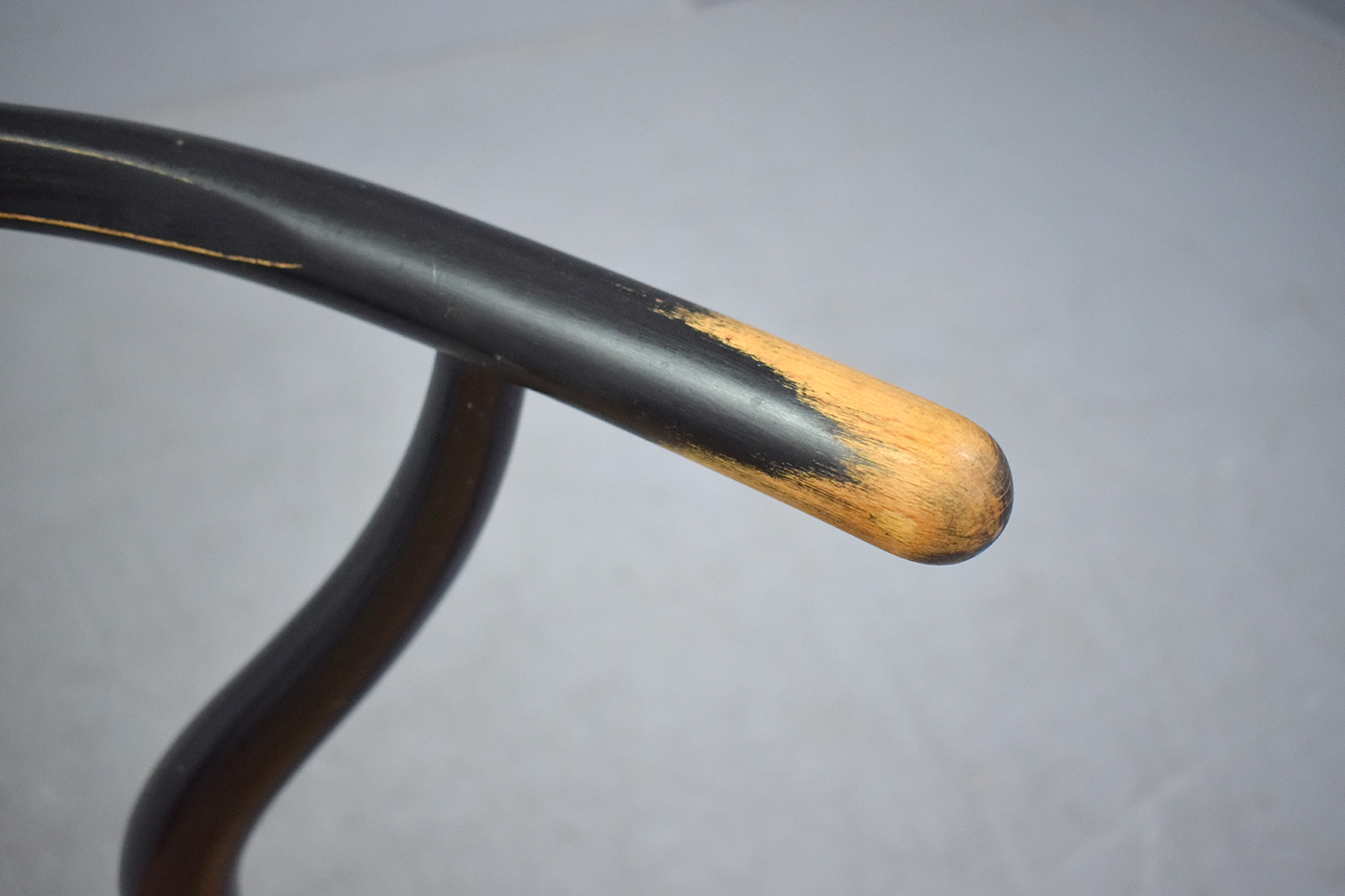 The black paint has started to wear on the arms of the chair, revealing the solid oak frame underneath.