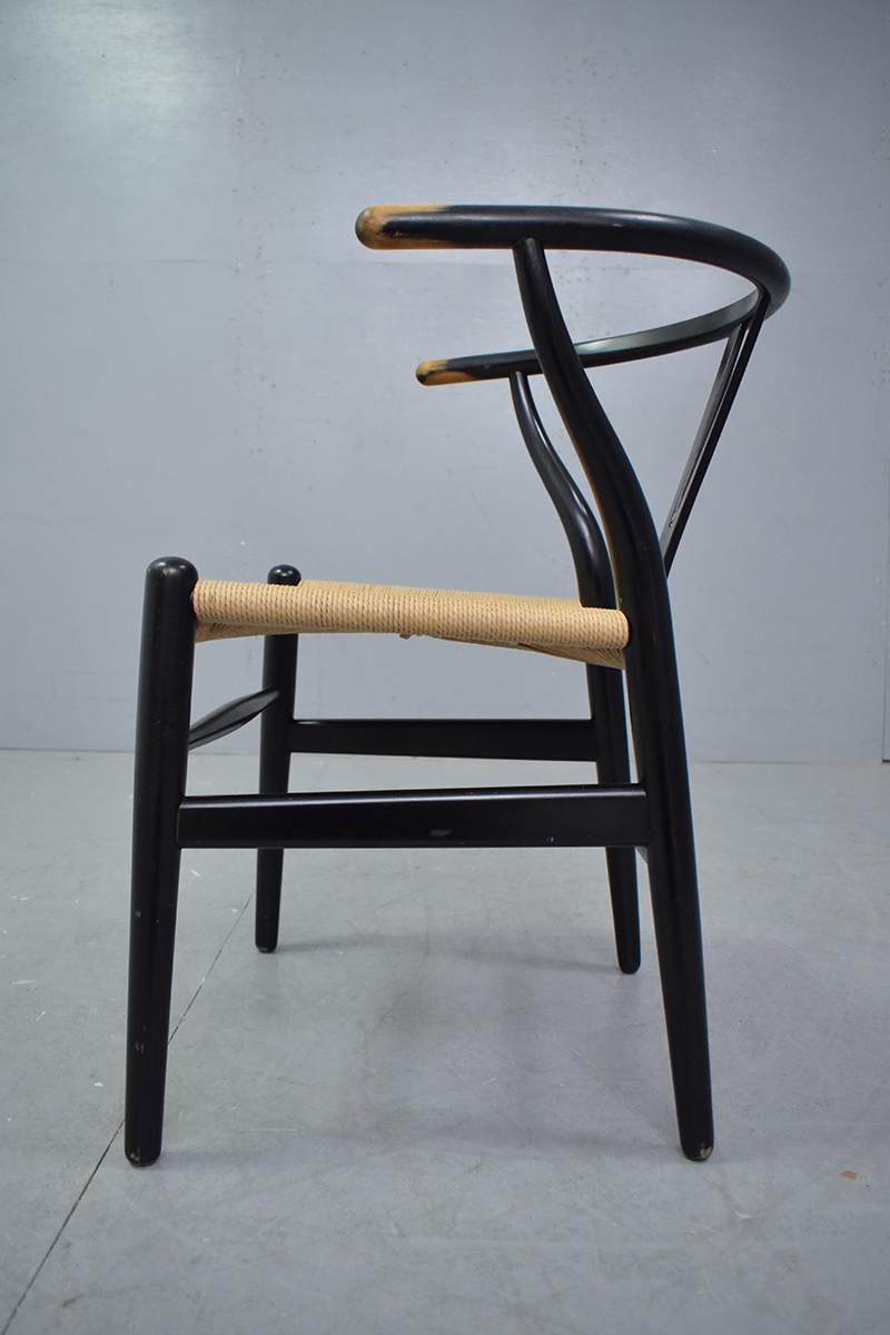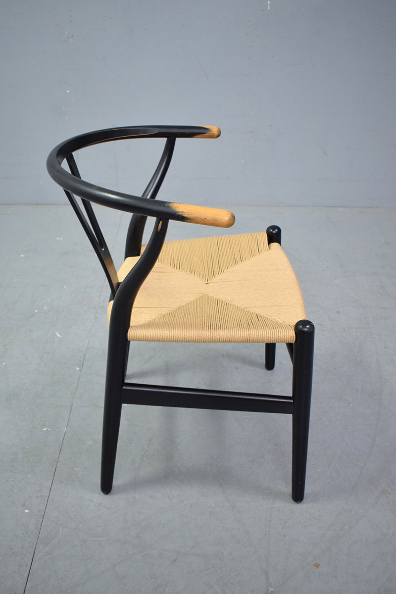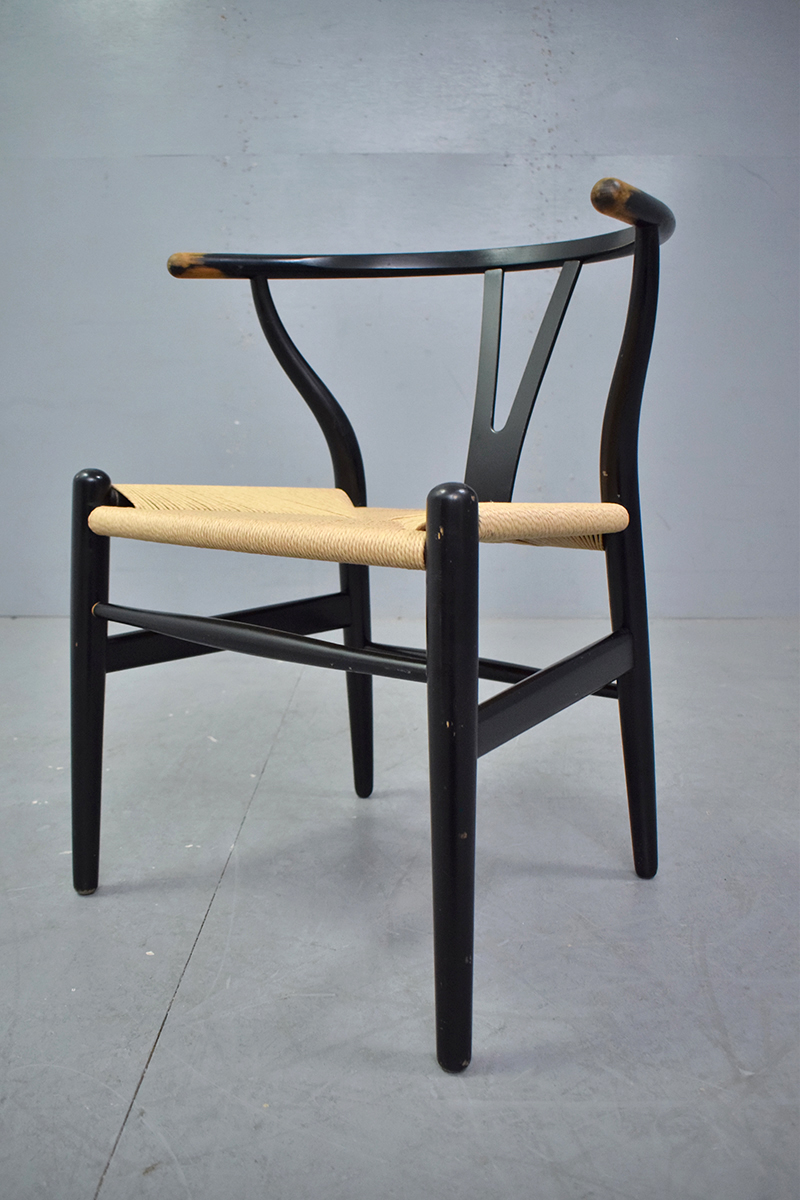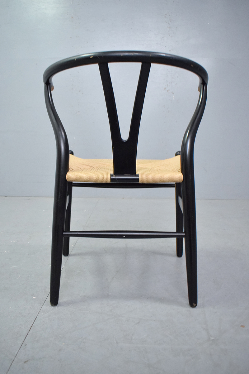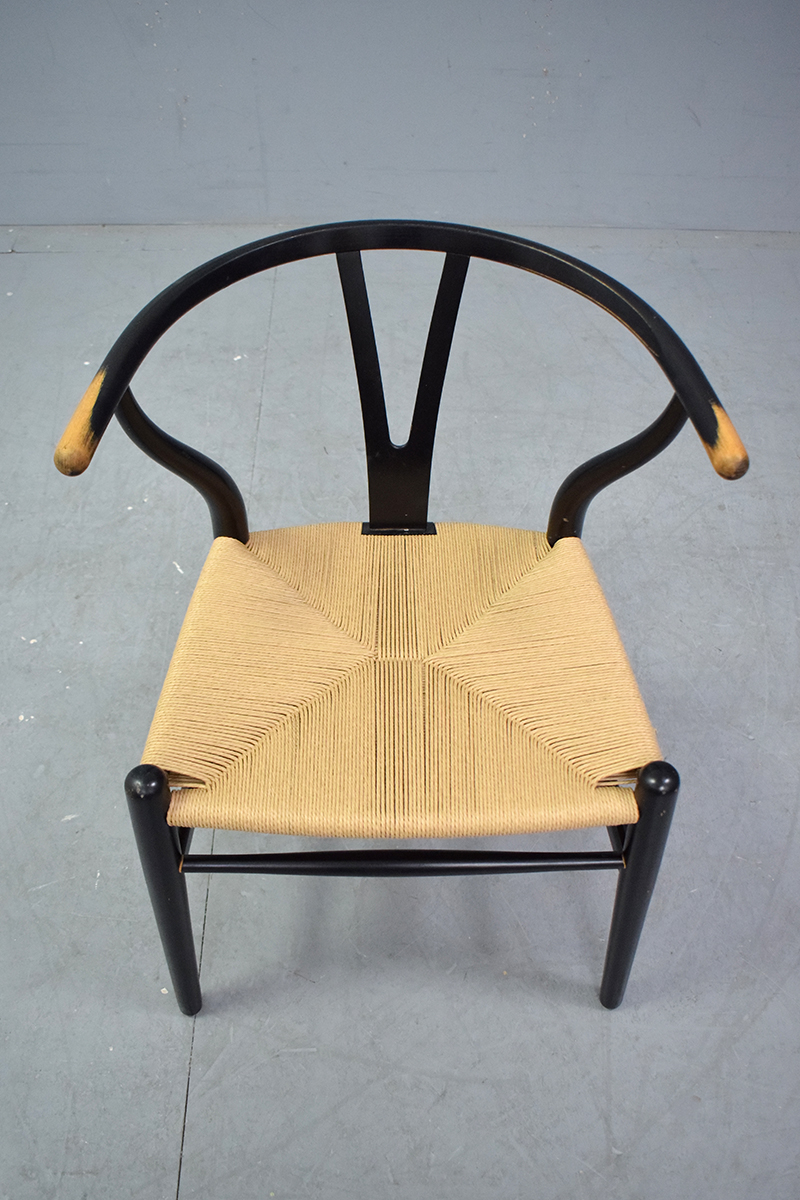 Vintage 'wishbone' chair, also know as the CH24 chair, in solid oak and original black laquer finish with traditional woven papercord seats, designed by Hans Wegner in 1950 for Carl Hansen & Son.