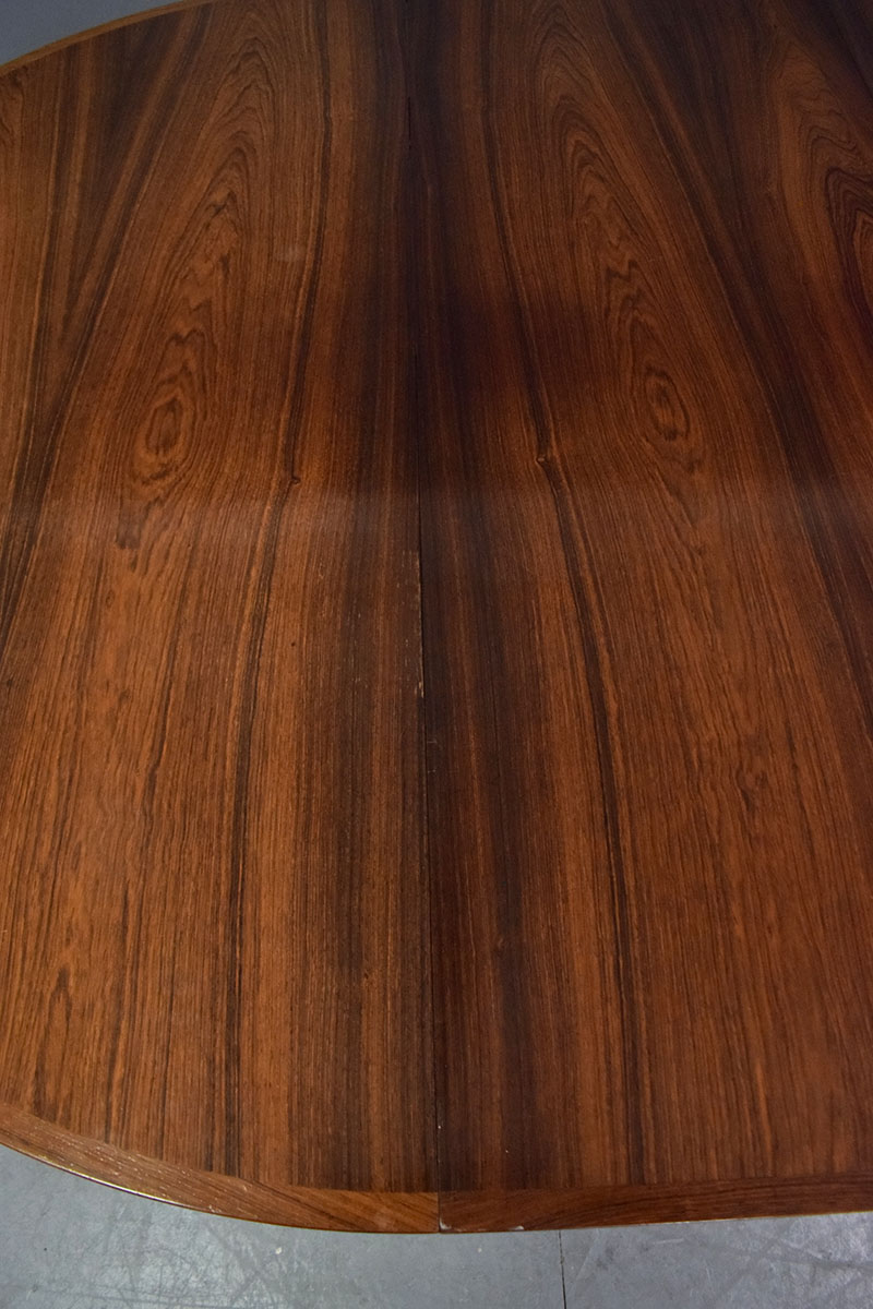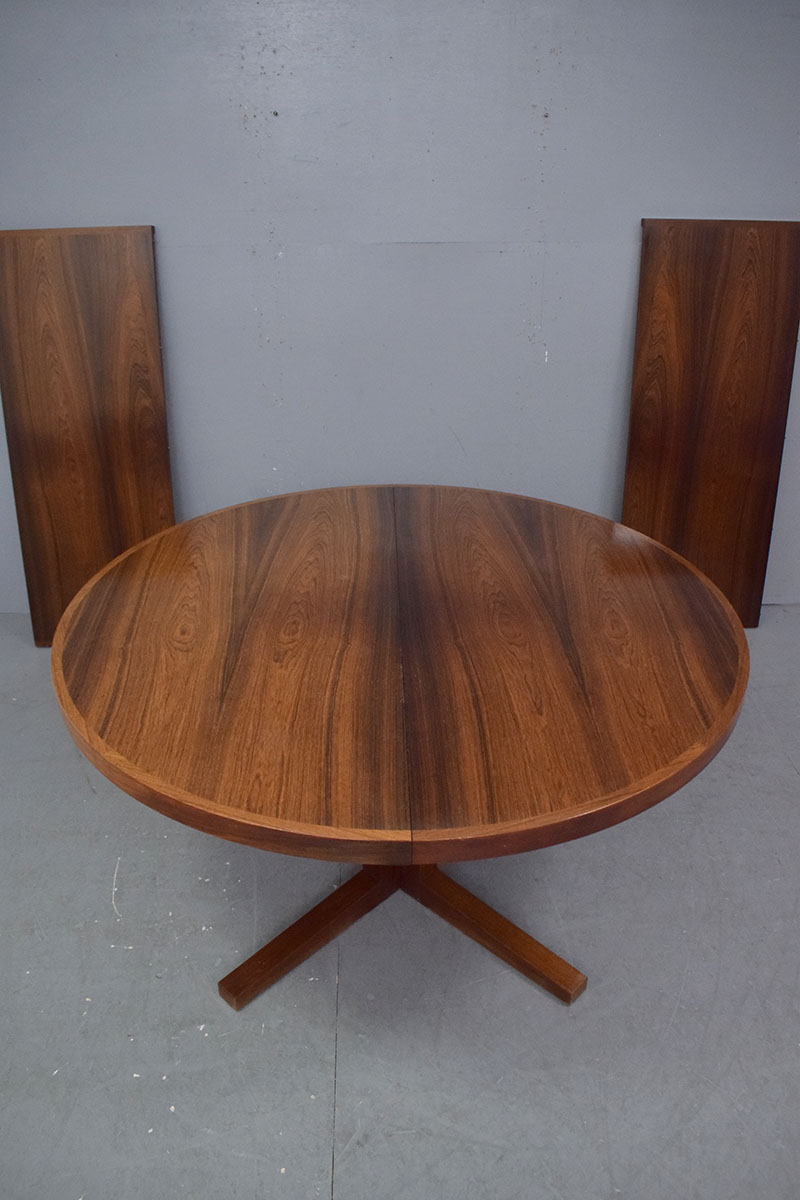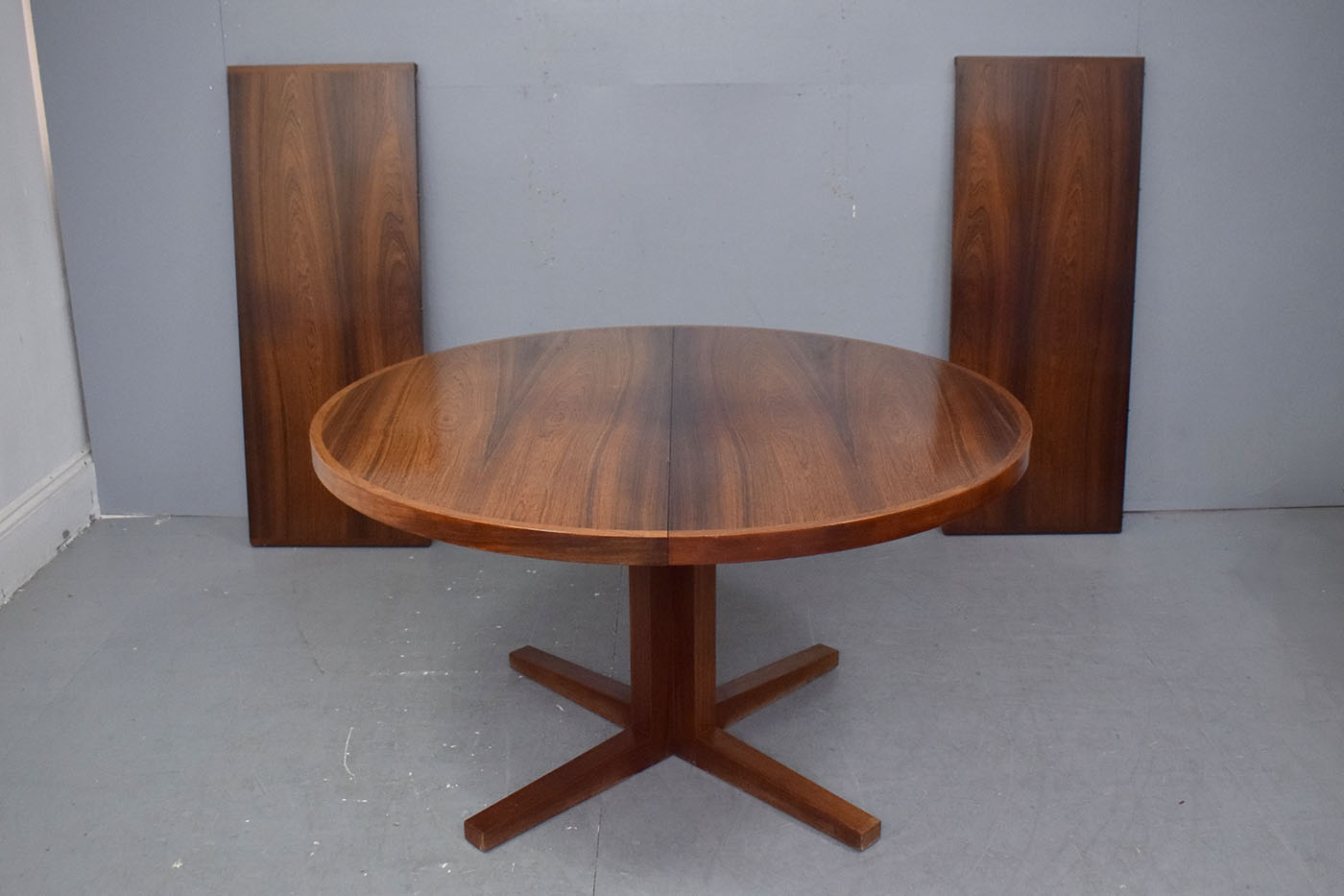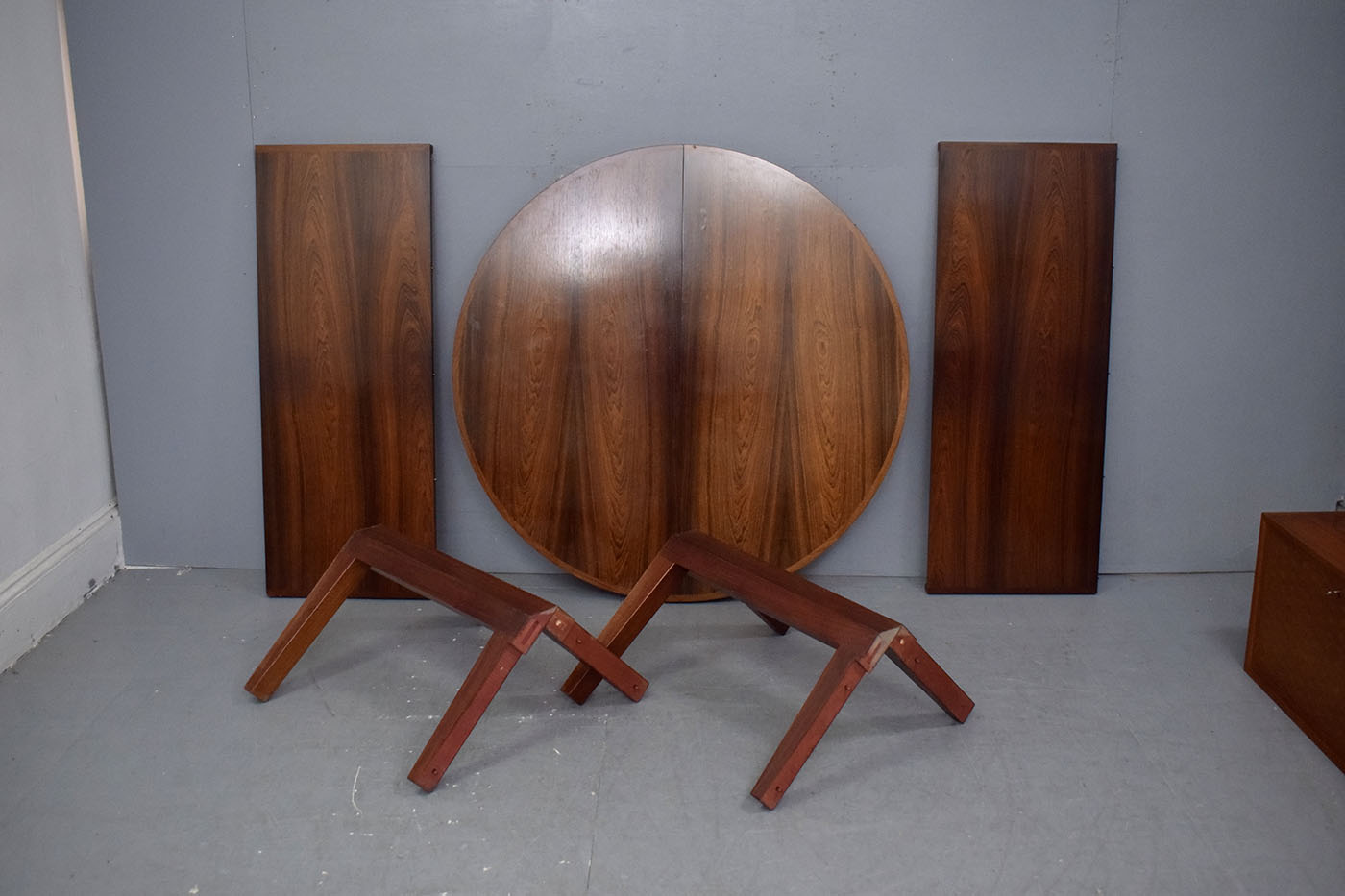 Vintage rosewood circular dining table on pedestal legs, model HM19, extending with 2 extra leaves designed by John Mortensen and produced 963 by Heltborg Mobler.
