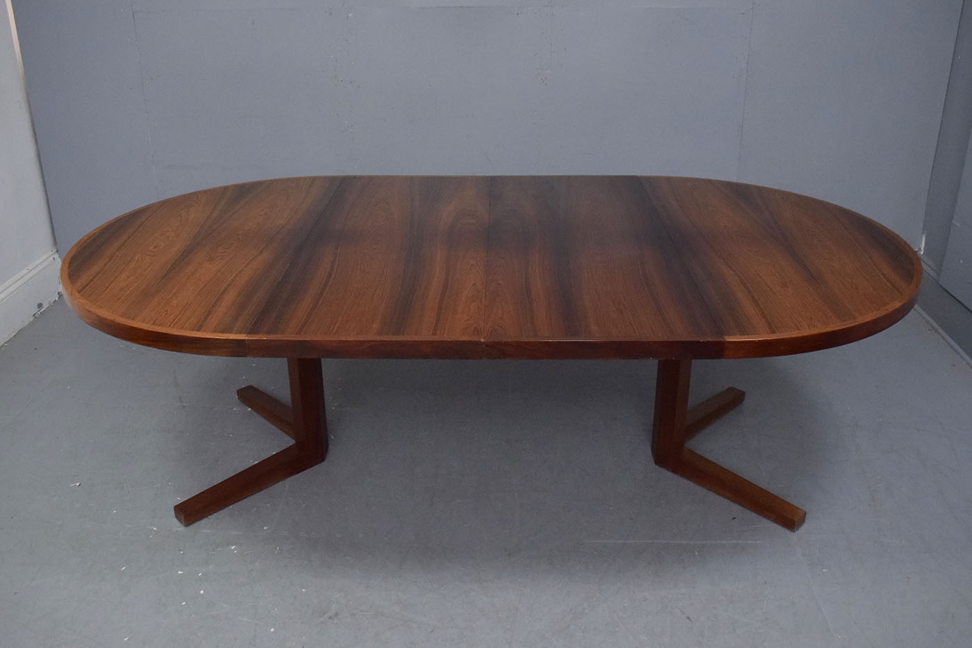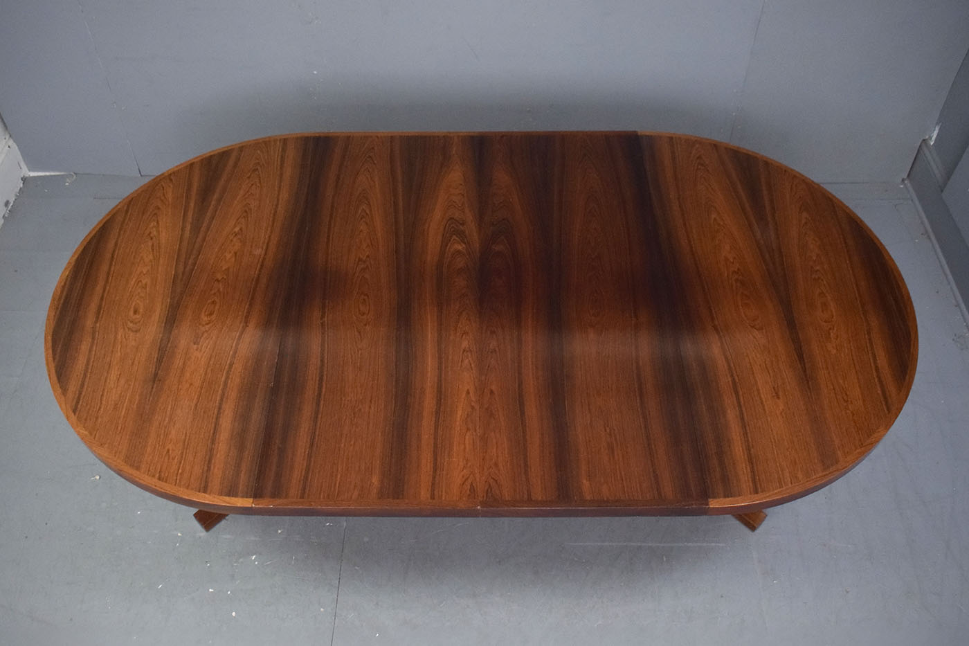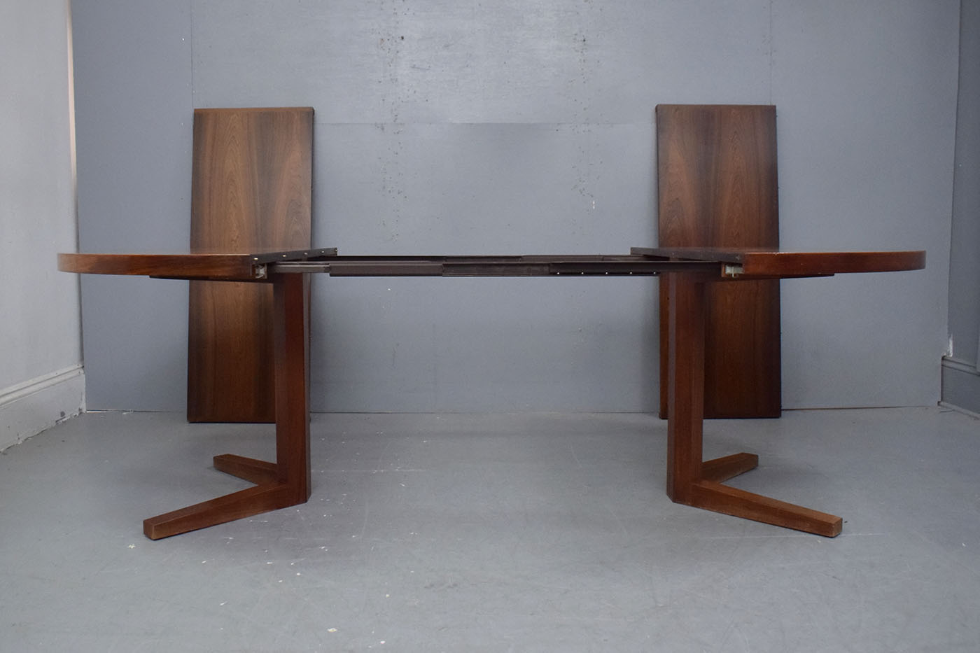 Vintage rosewood circular dining table on pedestal legs, model HM19, extending with 2 extra leaves designed by John Mortensen and produced 963 by Heltborg Mobler.