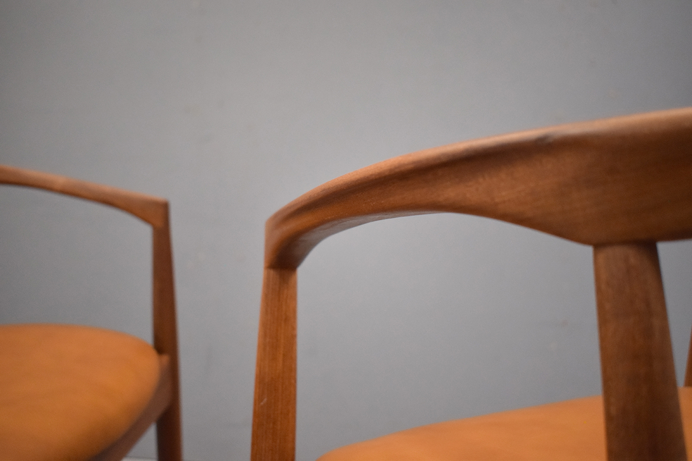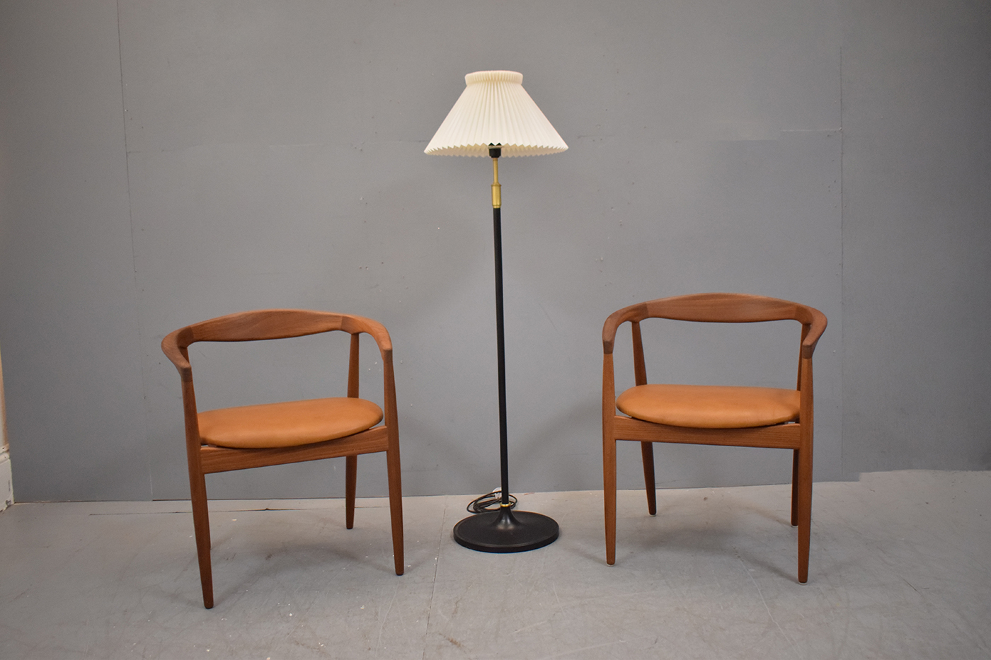 Midcentury teak armchair model TROJA with tan leather upholstery designed by Kai Kristiansen 1959 produced in Denmark for IKEA