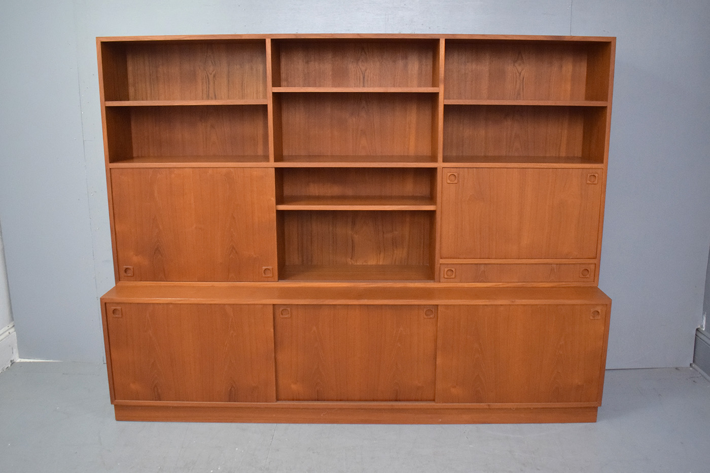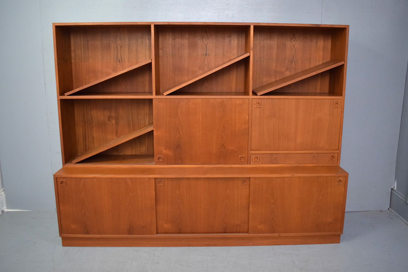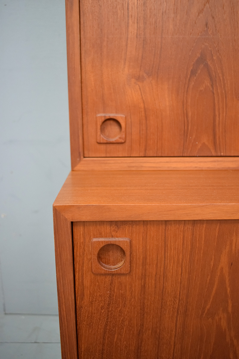 Large 2-piece vintage teak cabinet with bookcase top produced 1960s by Danish Mobelfabrik.