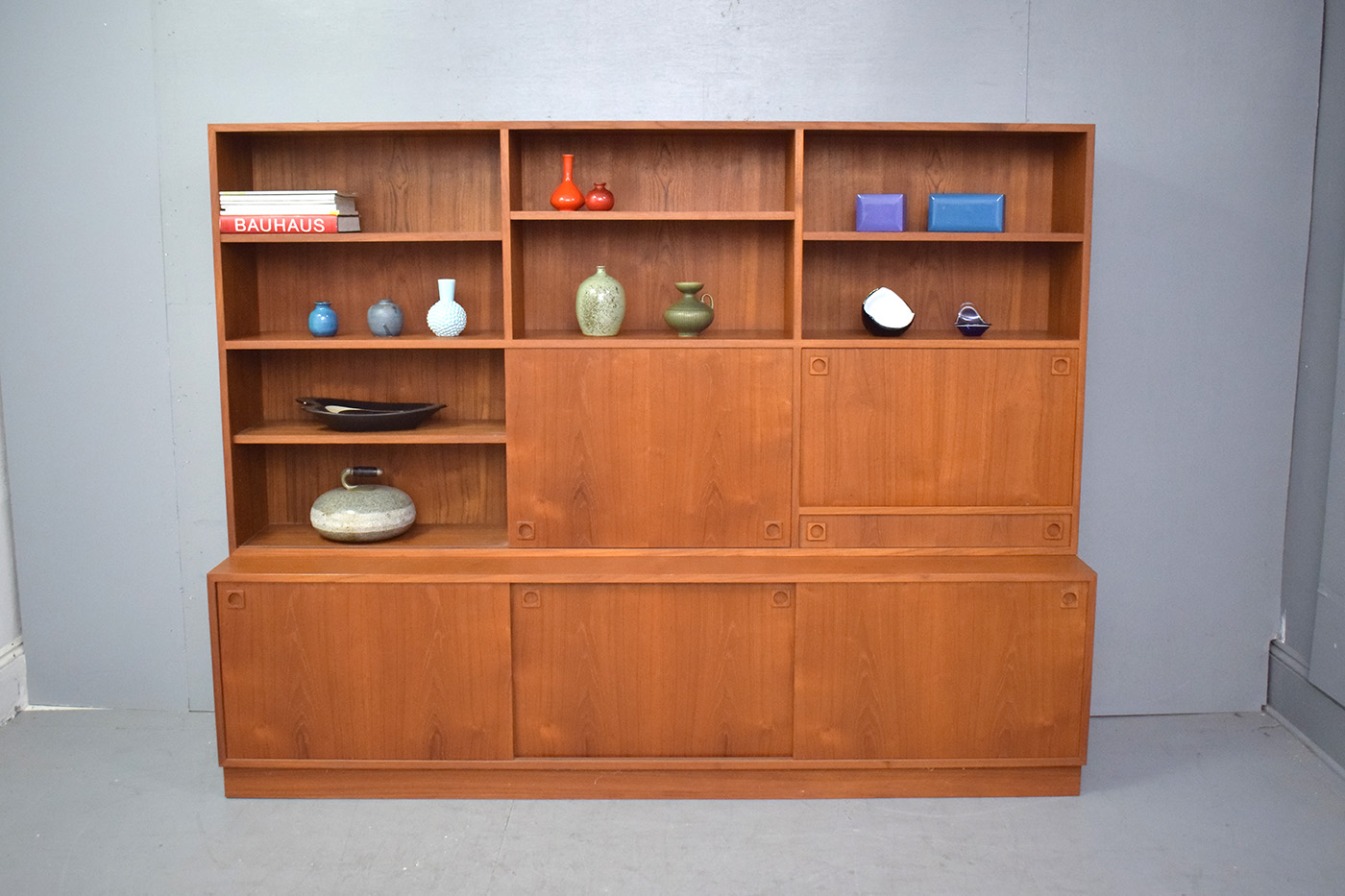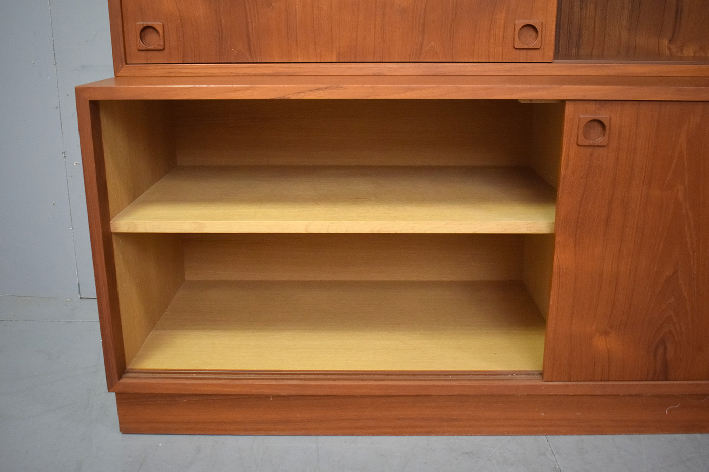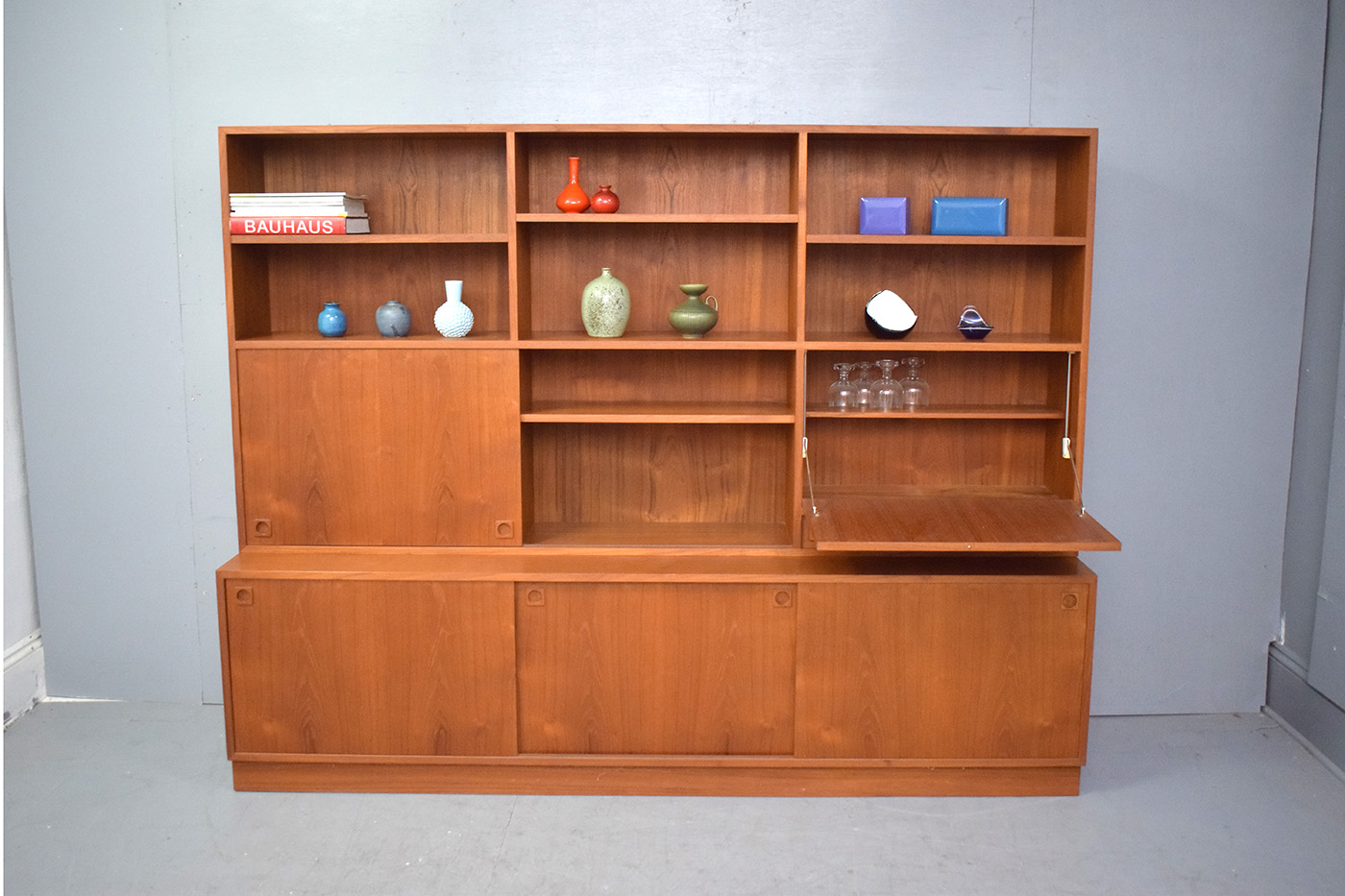 Large 2-piece vintage teak cabinet with bookcase top produced 1960s by Danish Mobelfabrik.