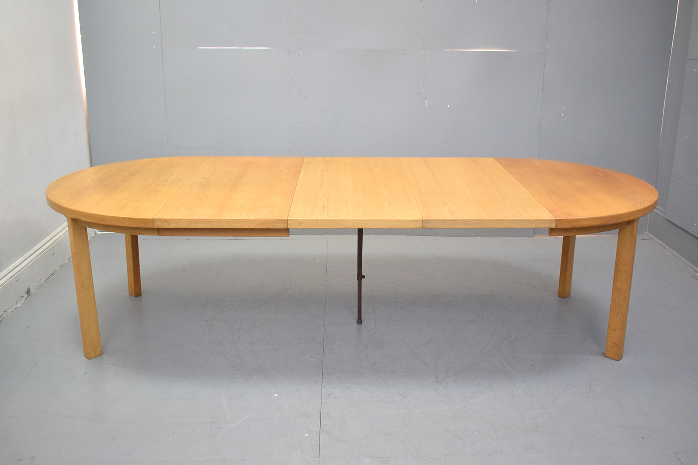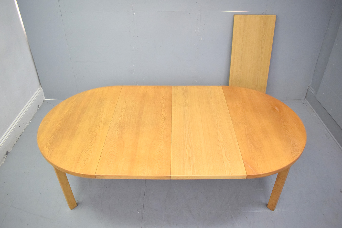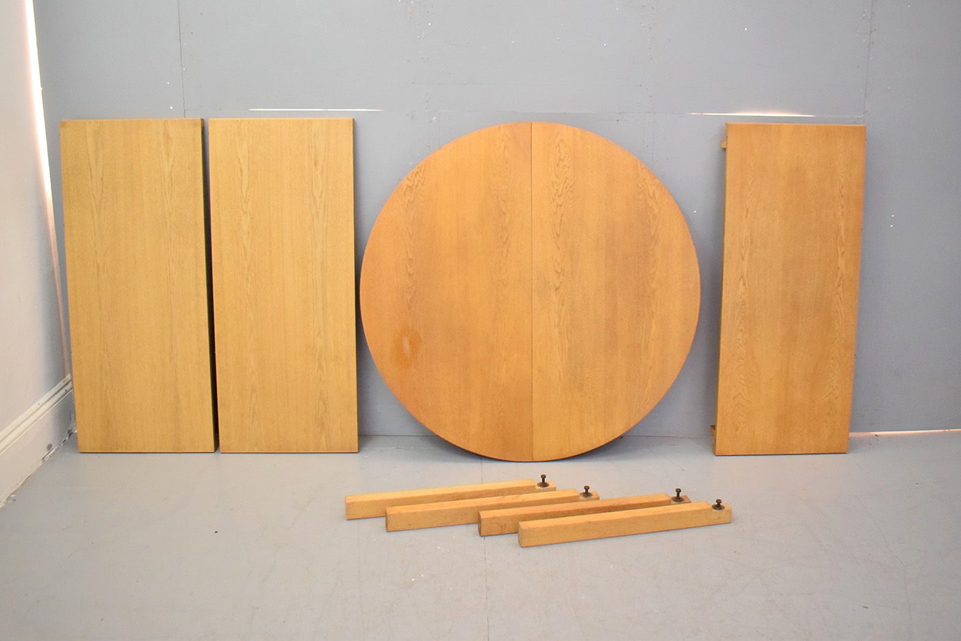 Vintage oak dining table with round top, extending with 3 extra leaves produced by Omann Junior Mobelfabrik, 1975.