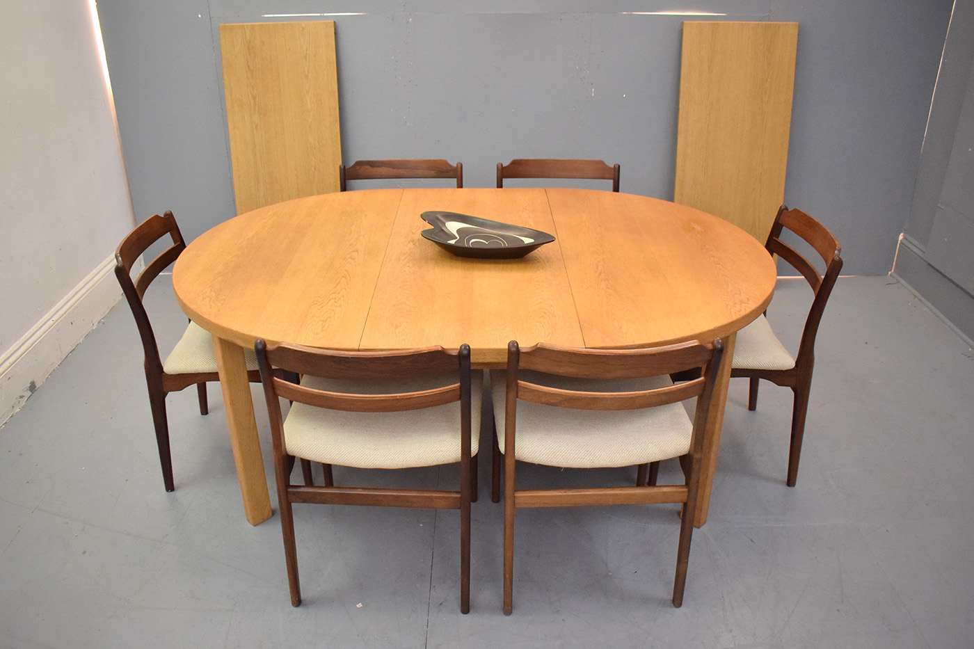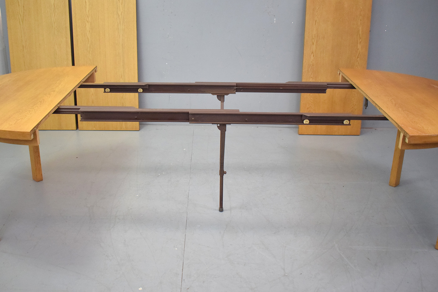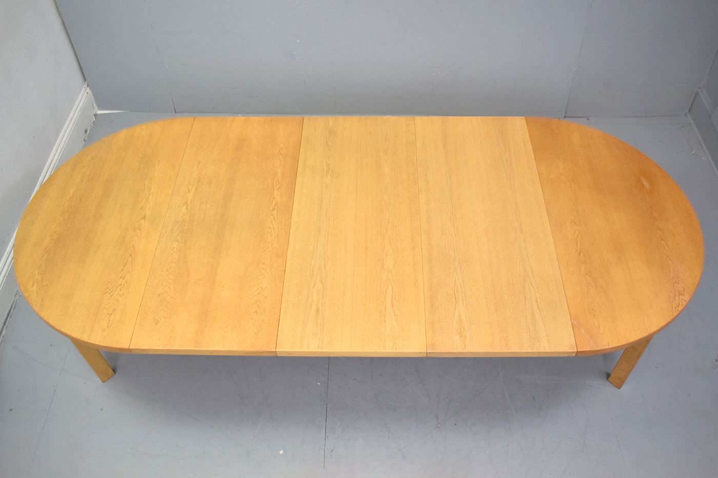 Vintage oak dining table with round top, extending with 3 extra leaves produced by Omann Junior Mobelfabrik, 1975.