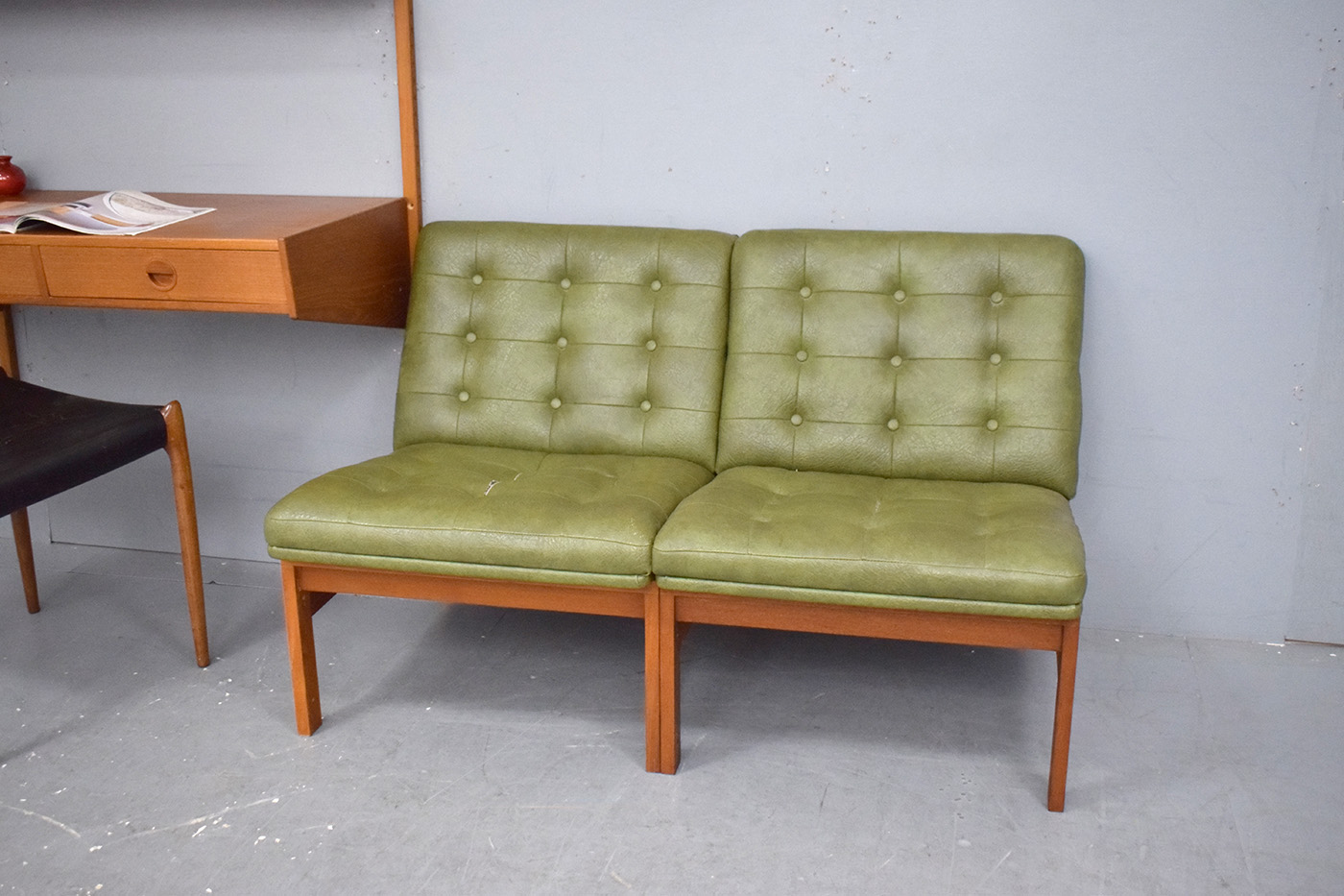 Vintage teak 2 seater MODULINE sofa with original green vinyl upholstery, designed in 1963 by Torben Lind & Ole Gjerlov Knudsen and produced by France & Son.