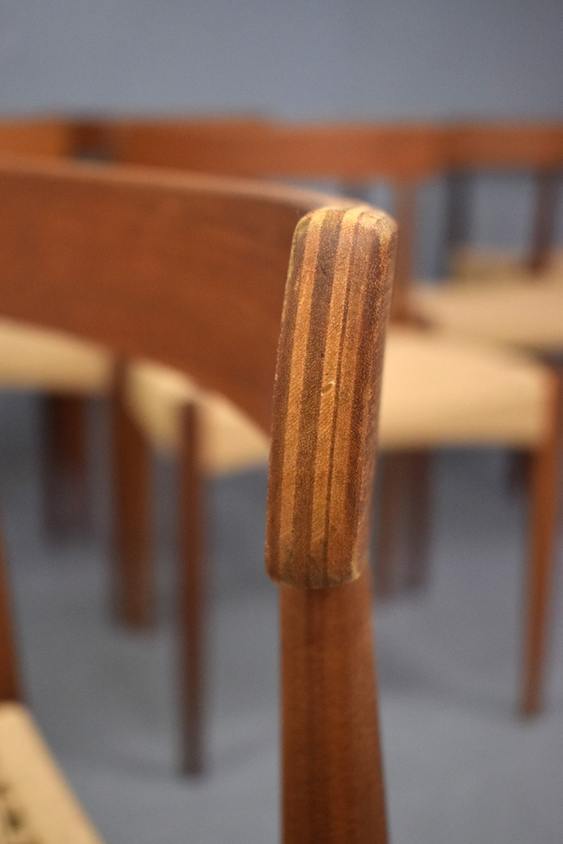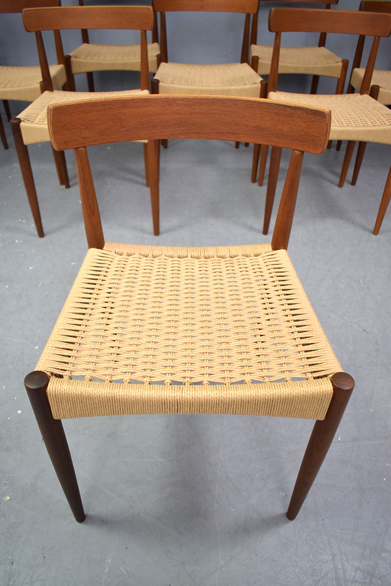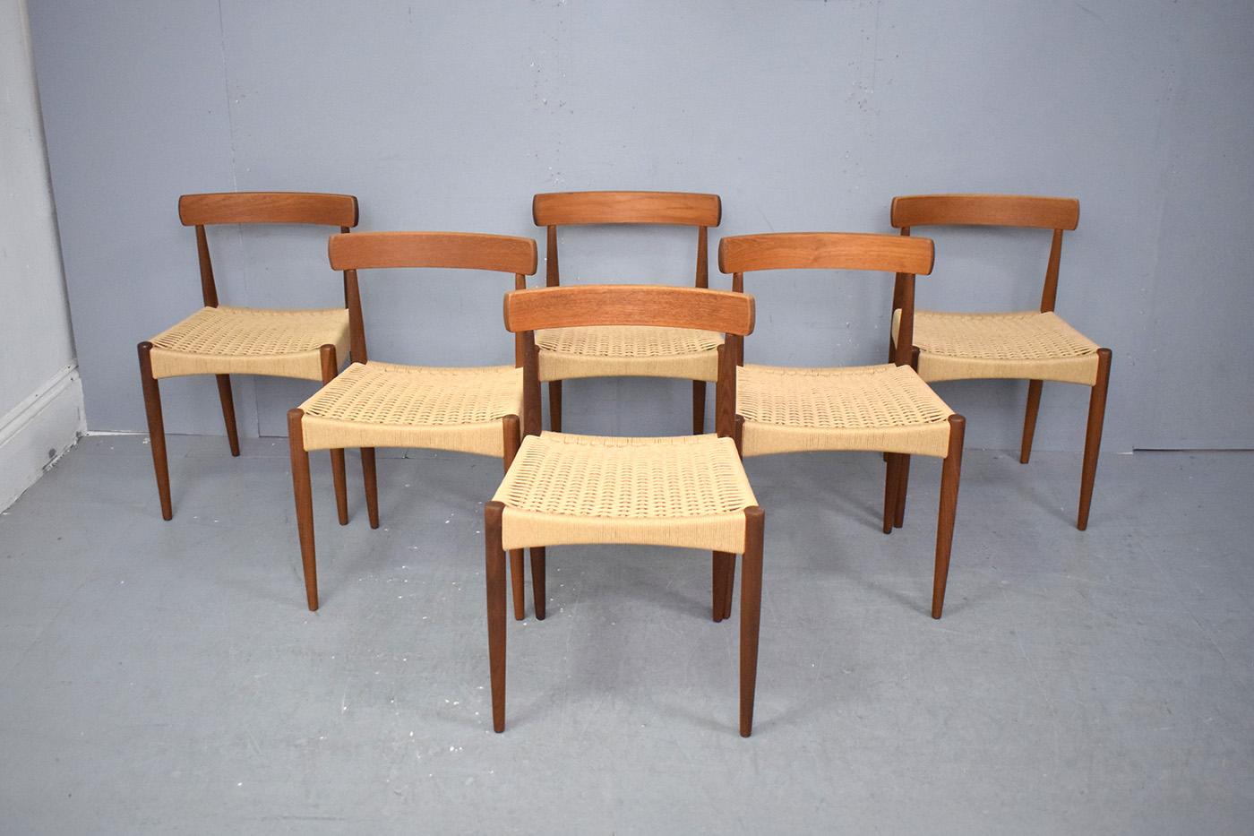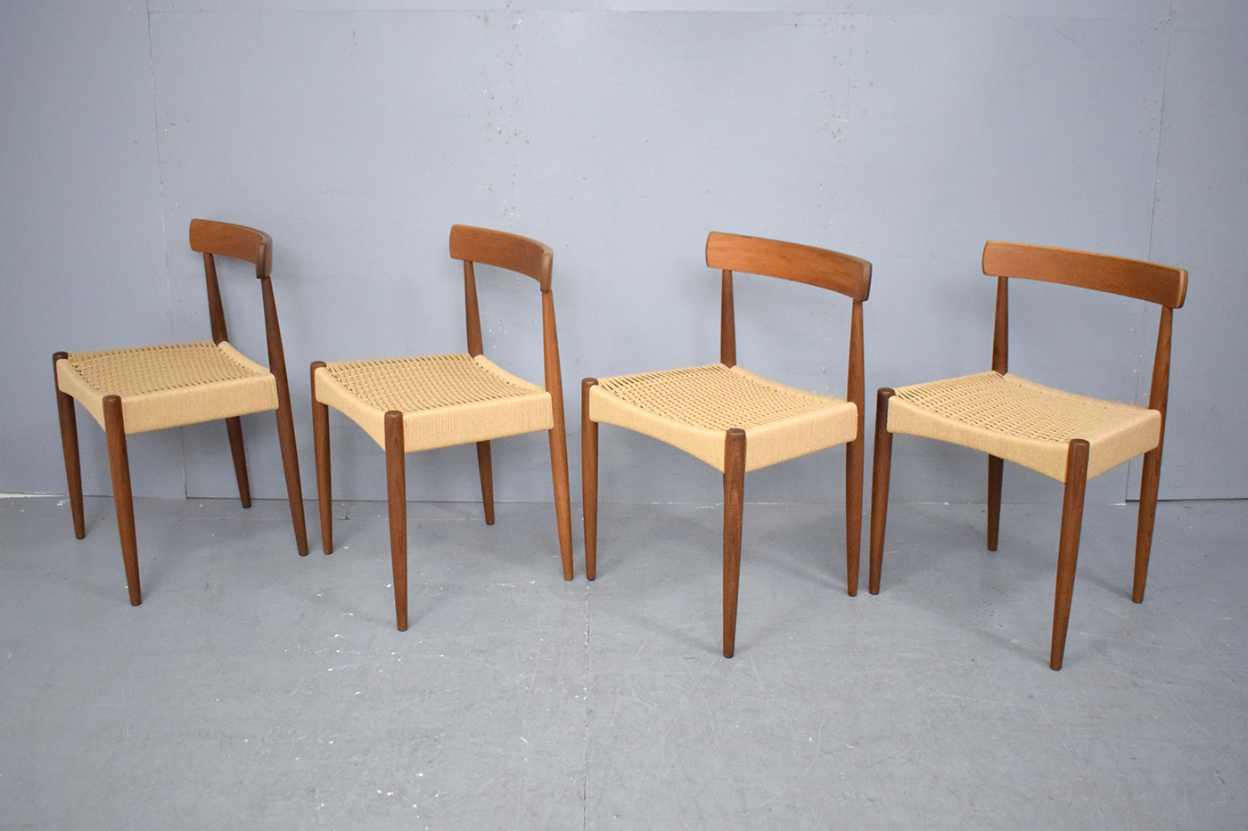 These slender and stylish dining chairs by Arne Hovmand Olsen feature vintage teak frames with gently curved backrests and woven papercord seats. The frames have been gently cleaned, restored and finished with a coat of teak oil which nourishes and protects the wood whilst maintaining the warm patina.