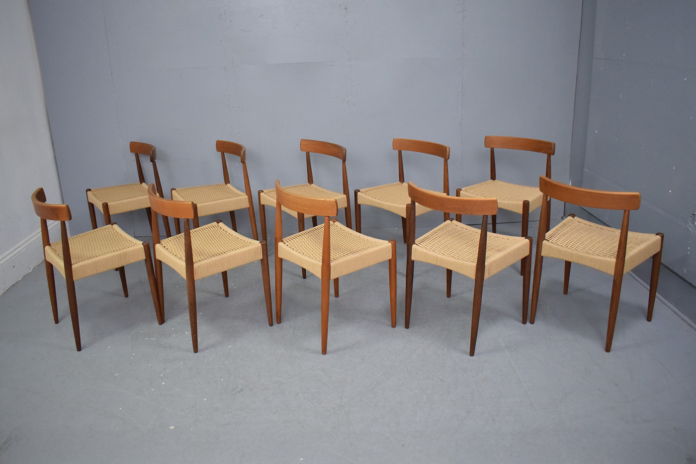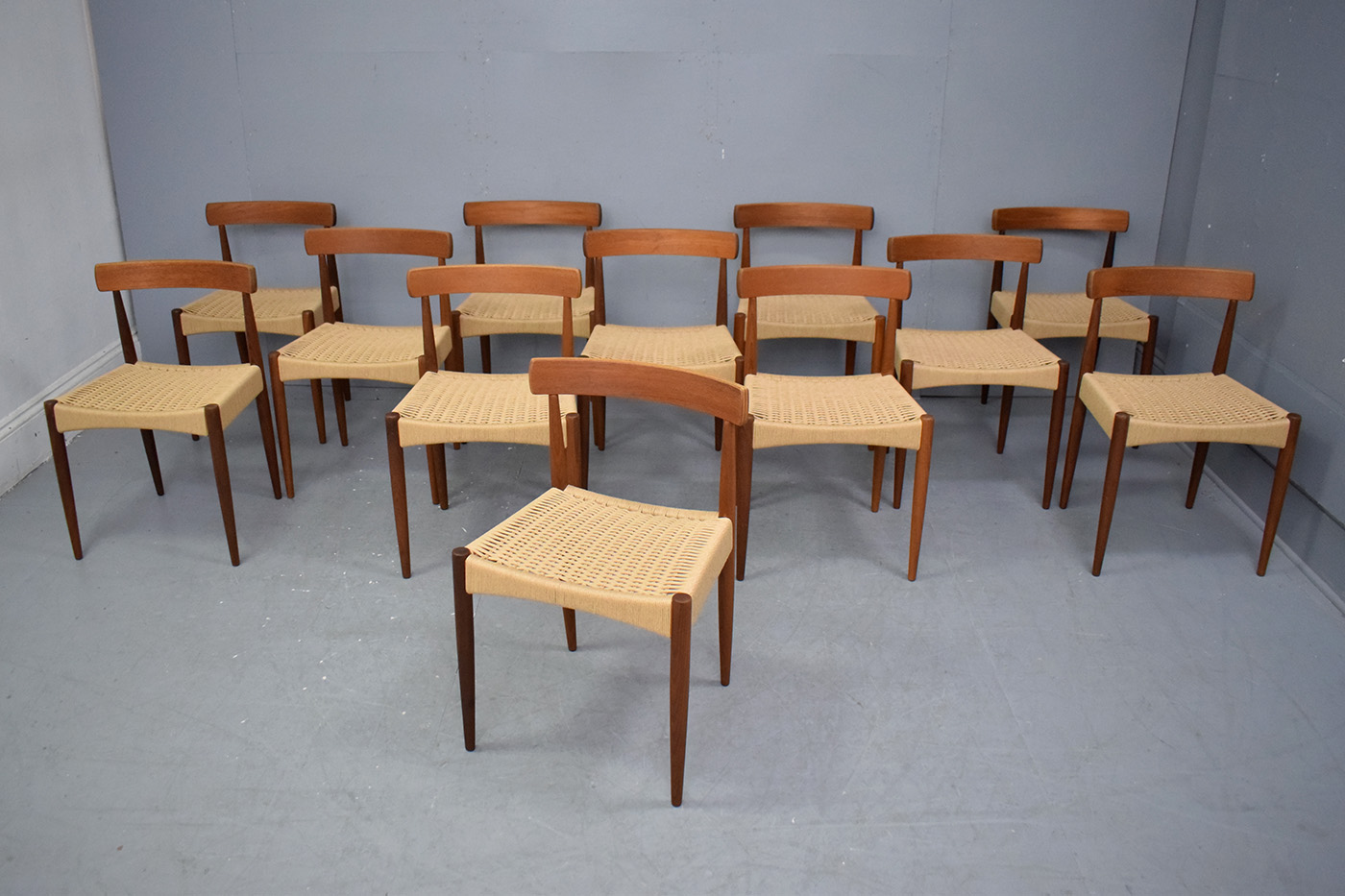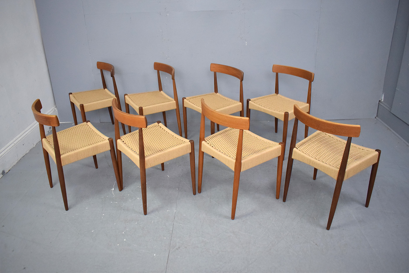 These slender and stylish dining chairs by Arne Hovmand Olsen feature vintage teak frames with gently curved backrests and woven papercord seats. The frames have been gently cleaned, restored and finished with a coat of teak oil which nourishes and protects the wood whilst maintaining the warm patina.