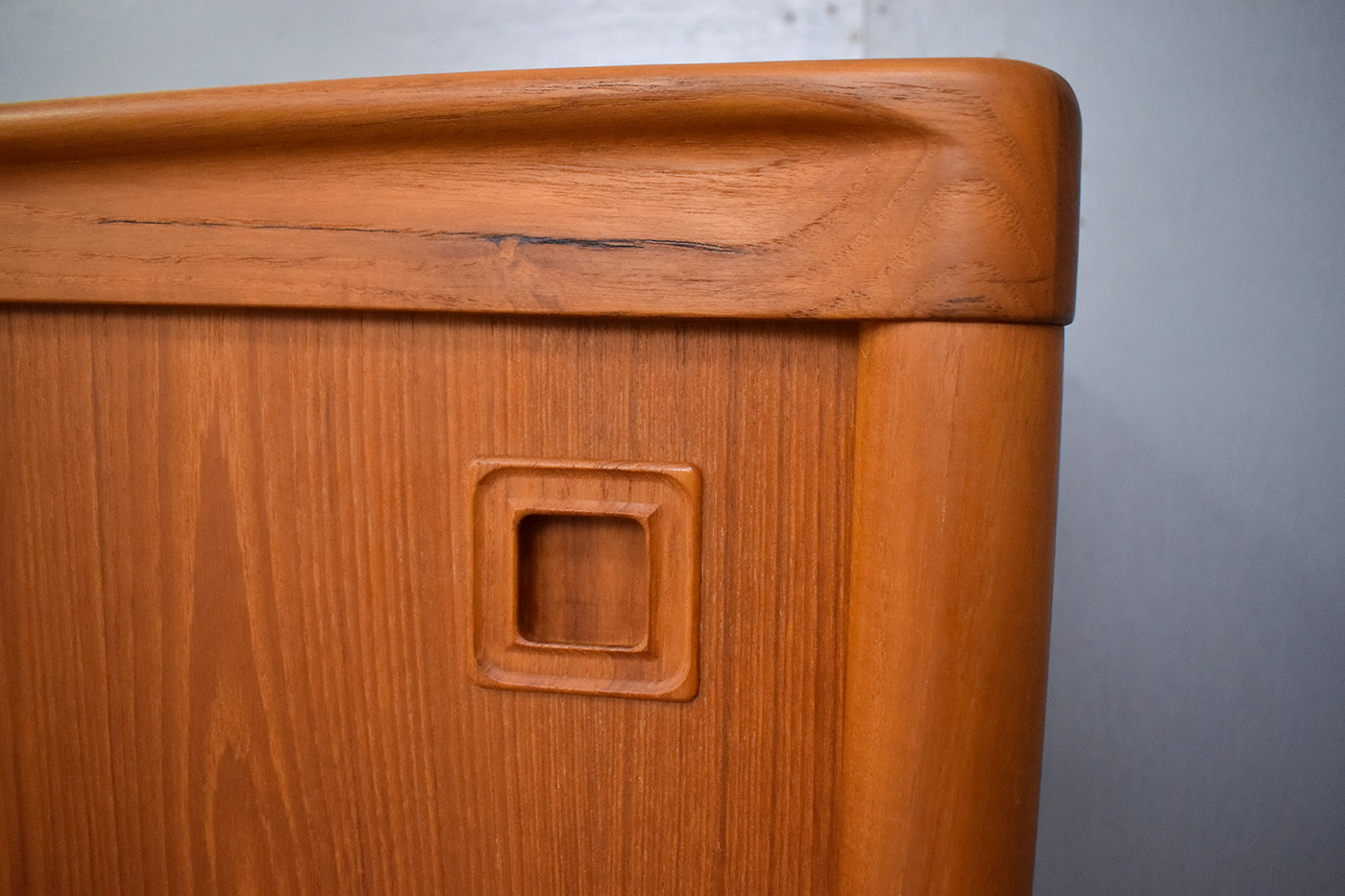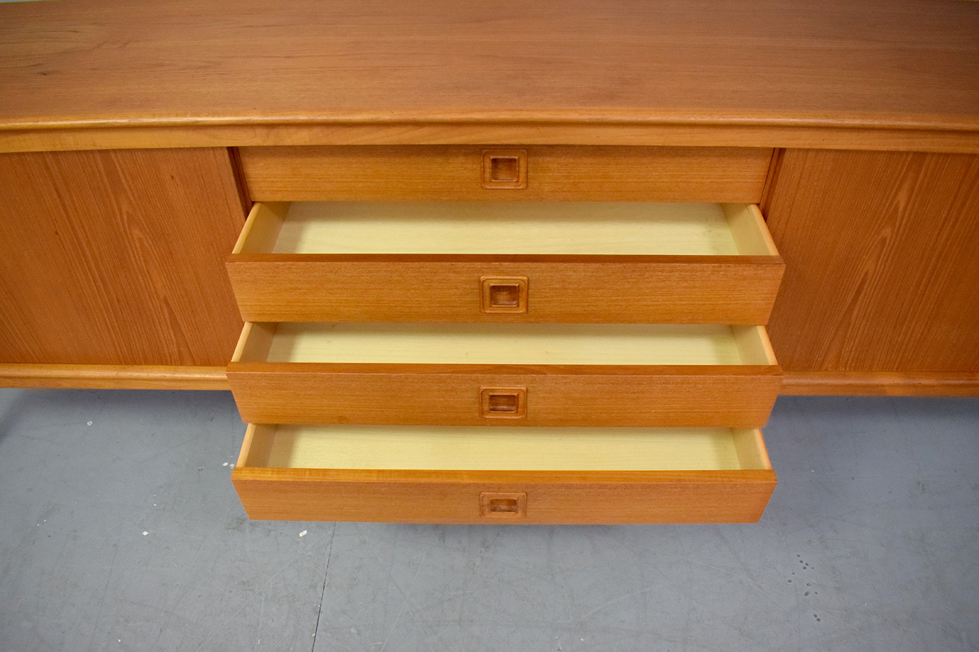 The sideboard stands firmly and well supported on tapering legs in solid teak.
