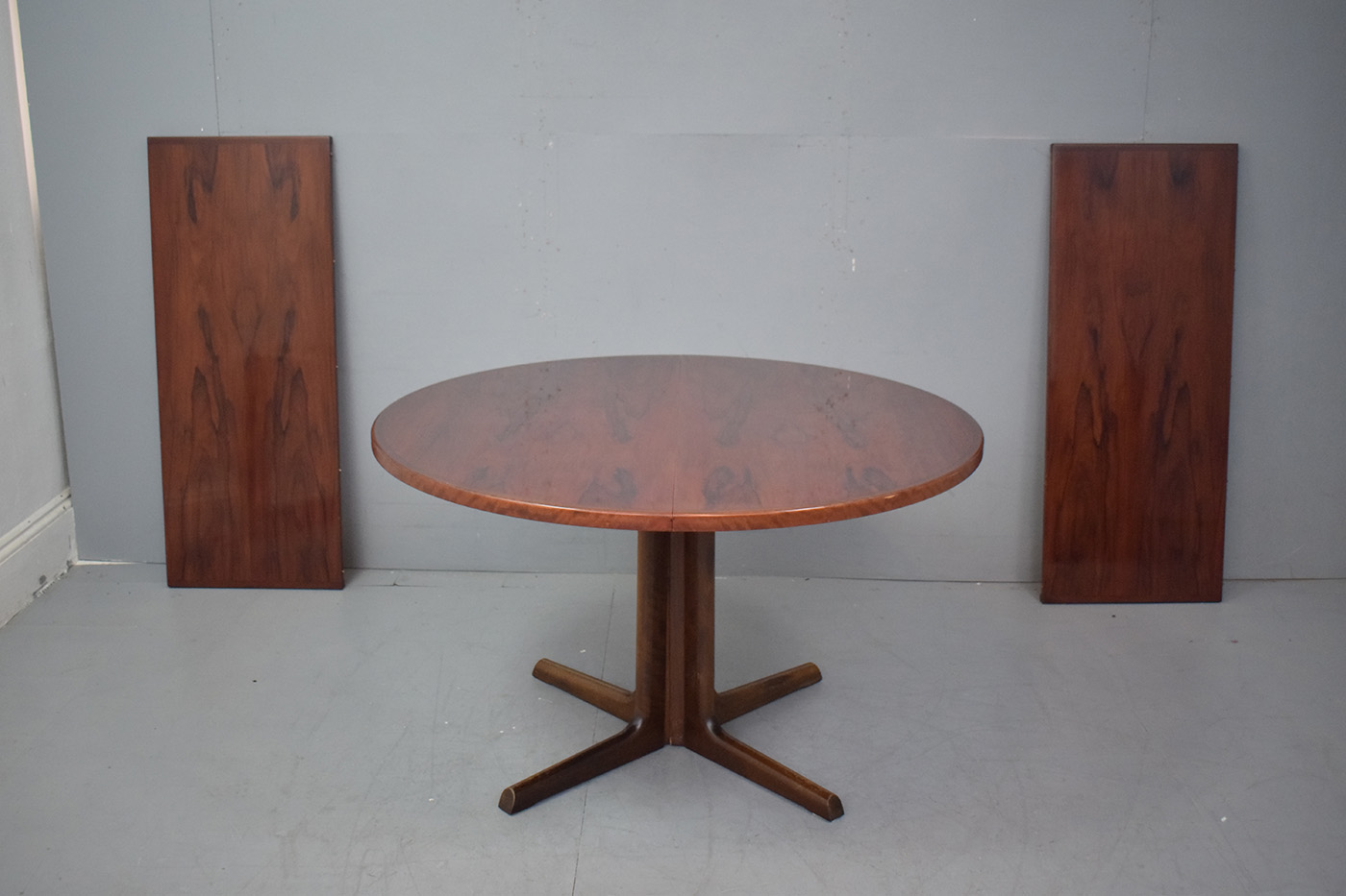 Vintage rosewood model 36 circular dining table on pedestal legs, extending with 2 extra leaves made by Gudme Mobelfabrik, Denmark in the 1970's.