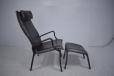 Elegant and light weight Danish armchair with high back rest, matching foot stool, head rest cushions and in all black leather upholstery.
