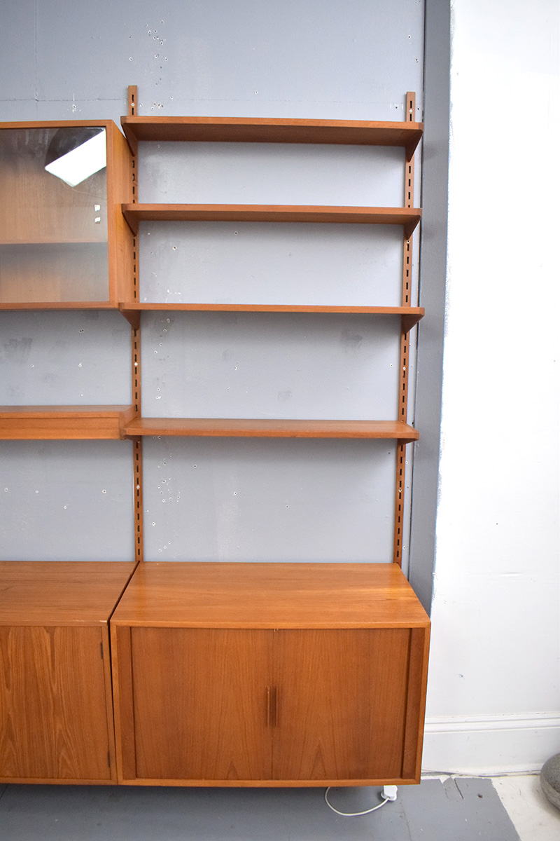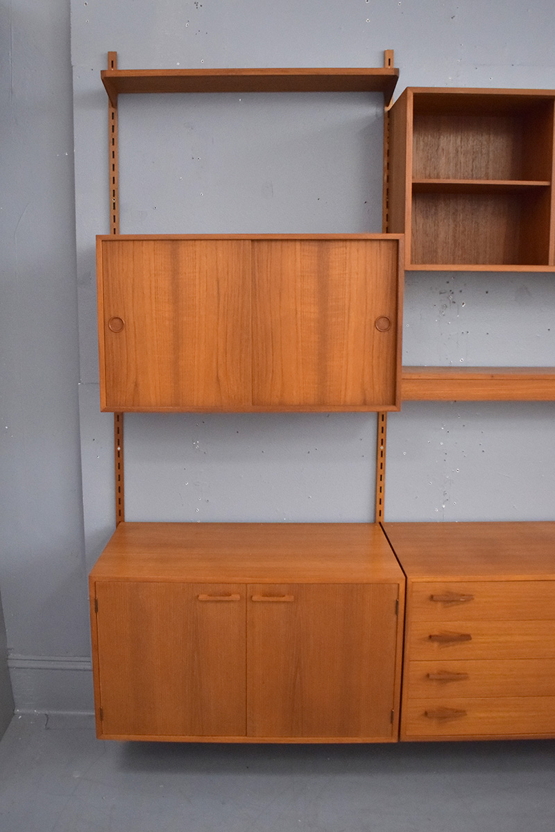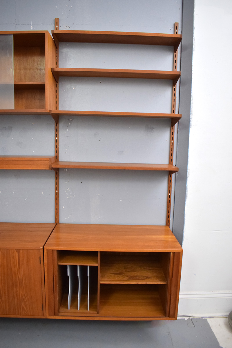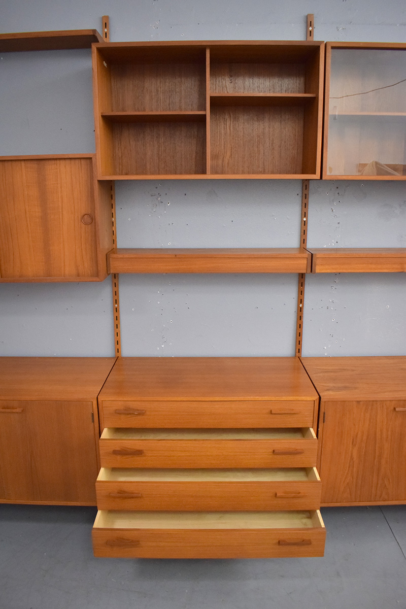 4 Bay vintage teak FM system designed in 1952 by Kai Kristiansen and produced by Feldeballes Mobelfabrik.