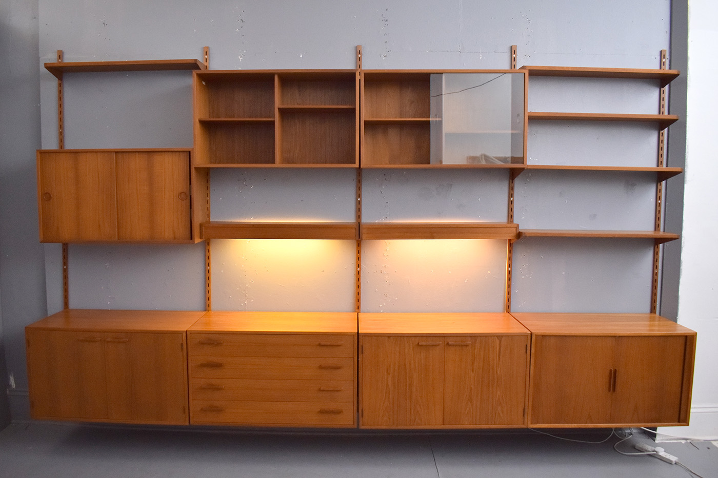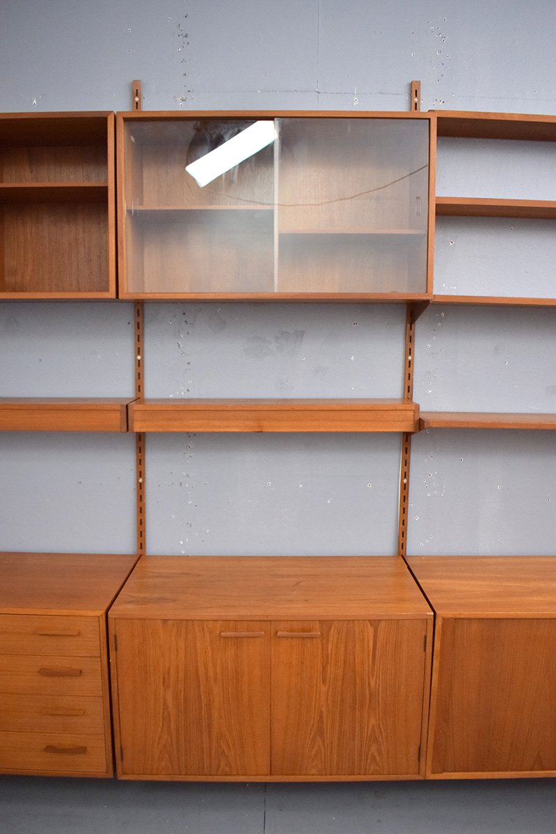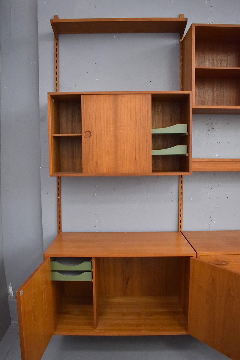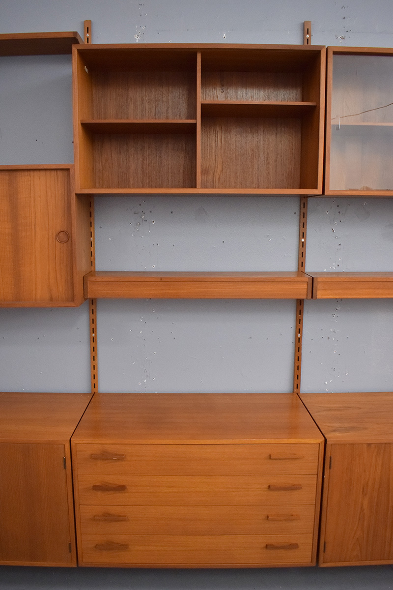 4 Bay vintage teak FM system designed in 1952 by Kai Kristiansen and produced by Feldeballes Mobelfabrik.