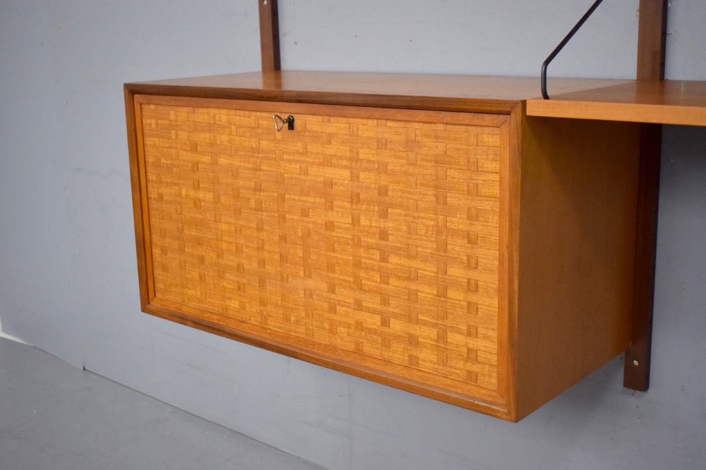 This system is ideal for a HI-FI system and record storage. The large lattice front base cabinet opens to reveal a large space with internal divisions, perfect for storing 12" records or magazines. The system also includes a shelf of equal depth, which is ideal for a turntable or even for use as a small writing desk.