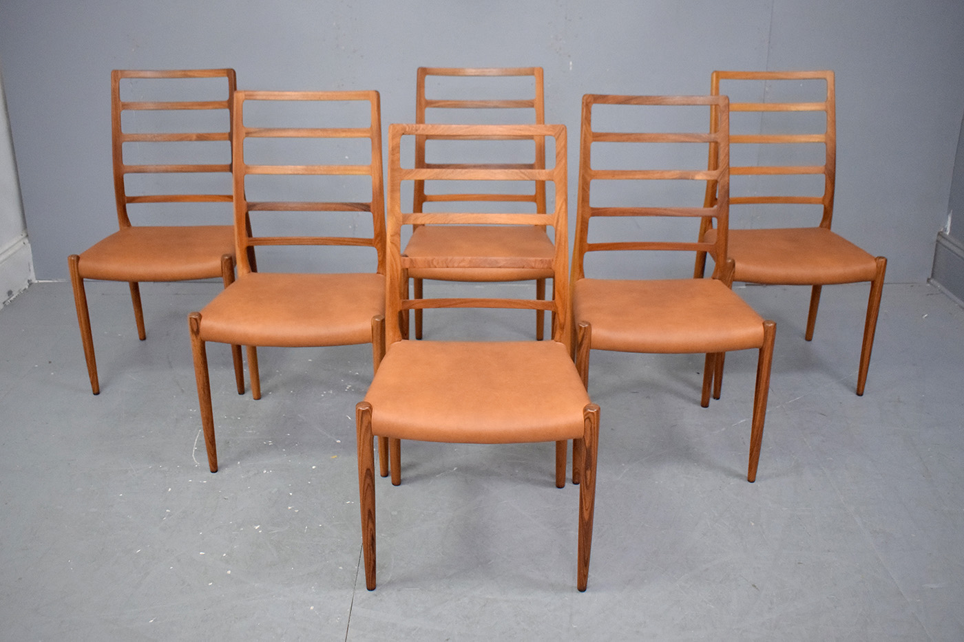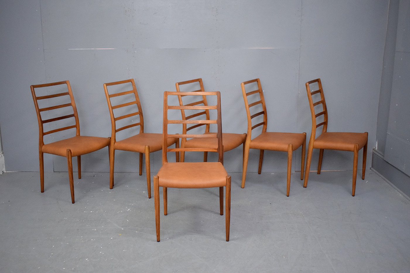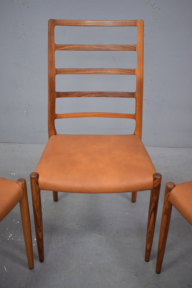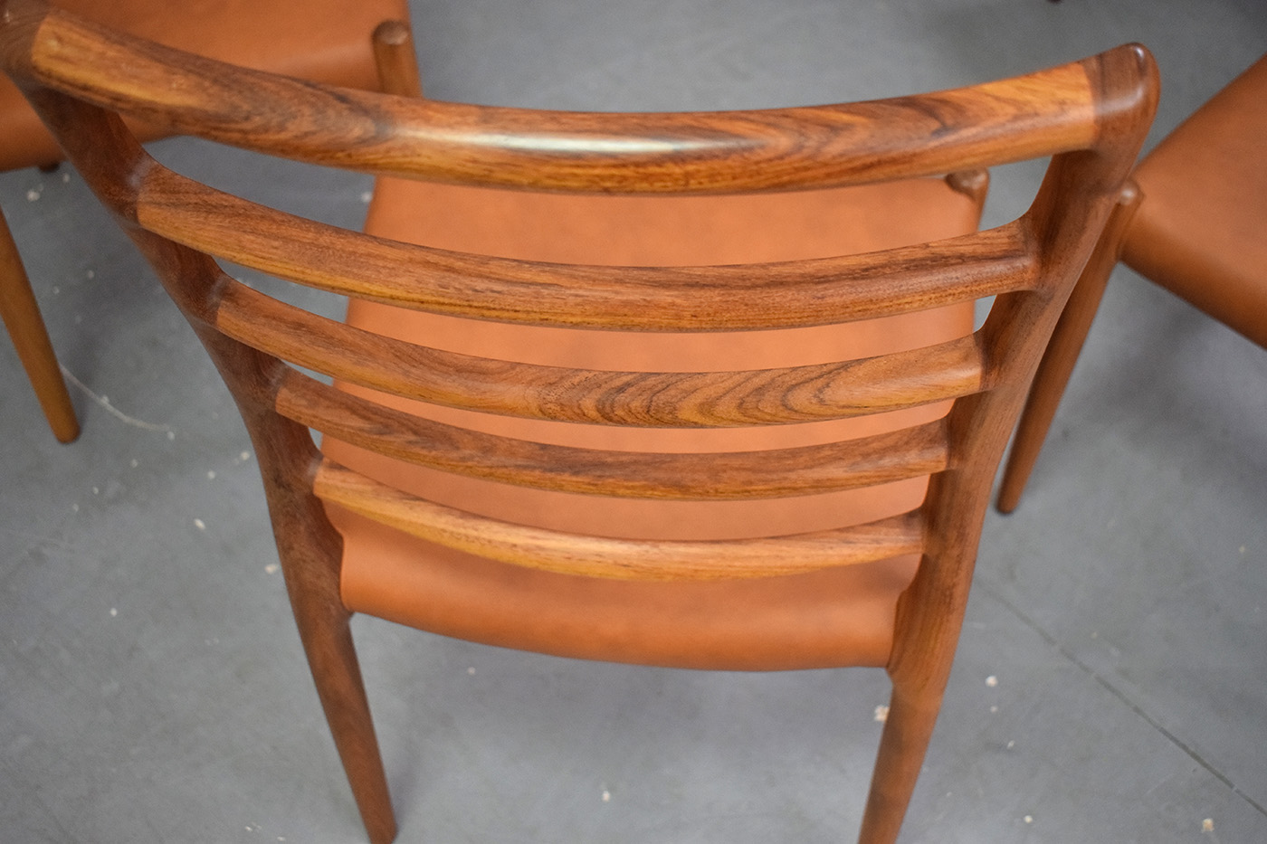 Set of 6 high-back dining chairs with vintage rosewood frames and new leather seats, designed by Niels O Moller and produced 1970 by J L Mollers Mobelfabrik.