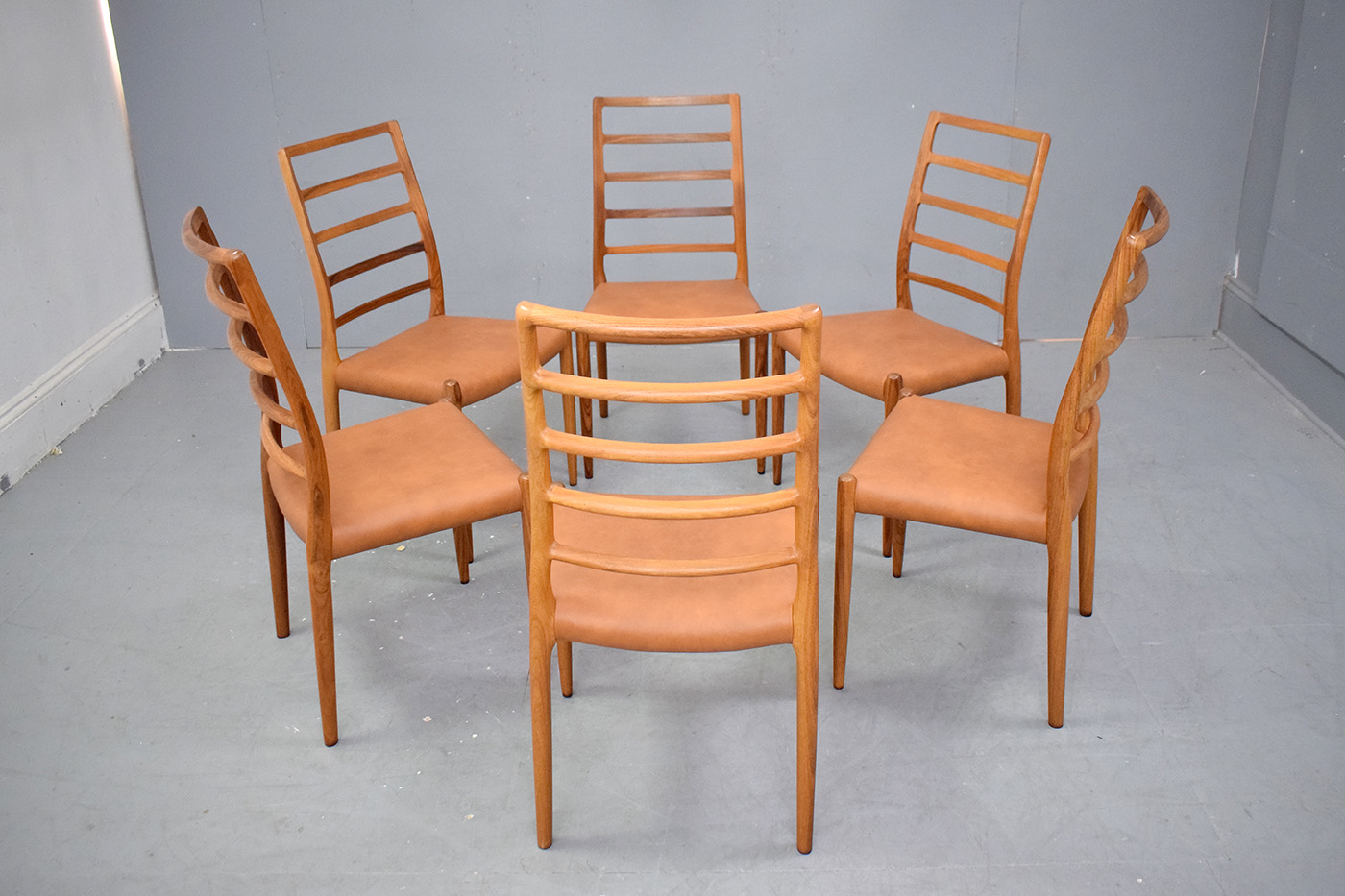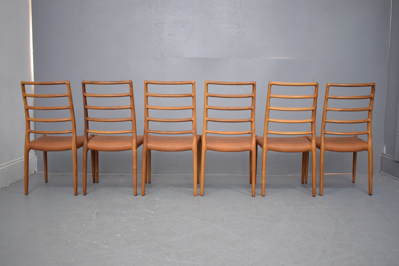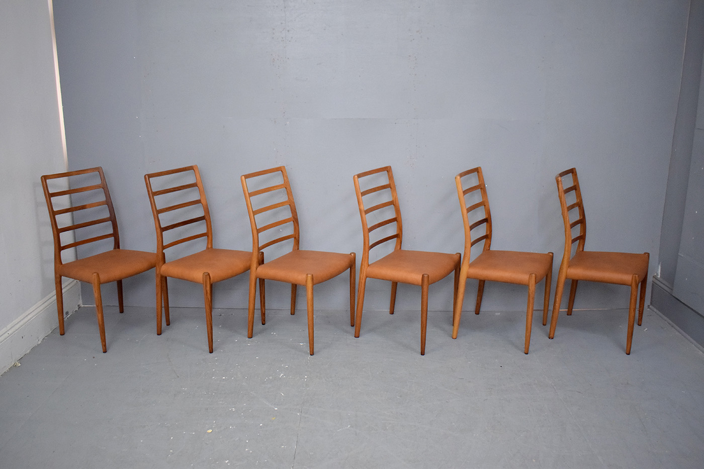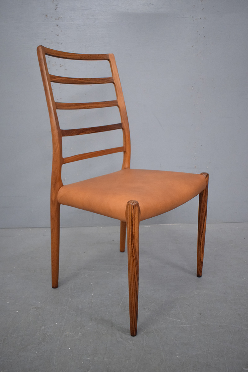 Set of 6 high-back dining chairs with vintage rosewood frames and new leather seats, designed by Niels O Moller and produced 1970 by J L Mollers Mobelfabrik.