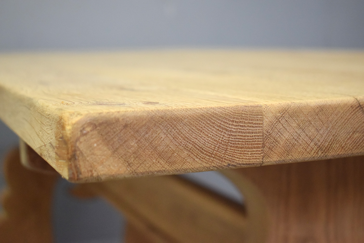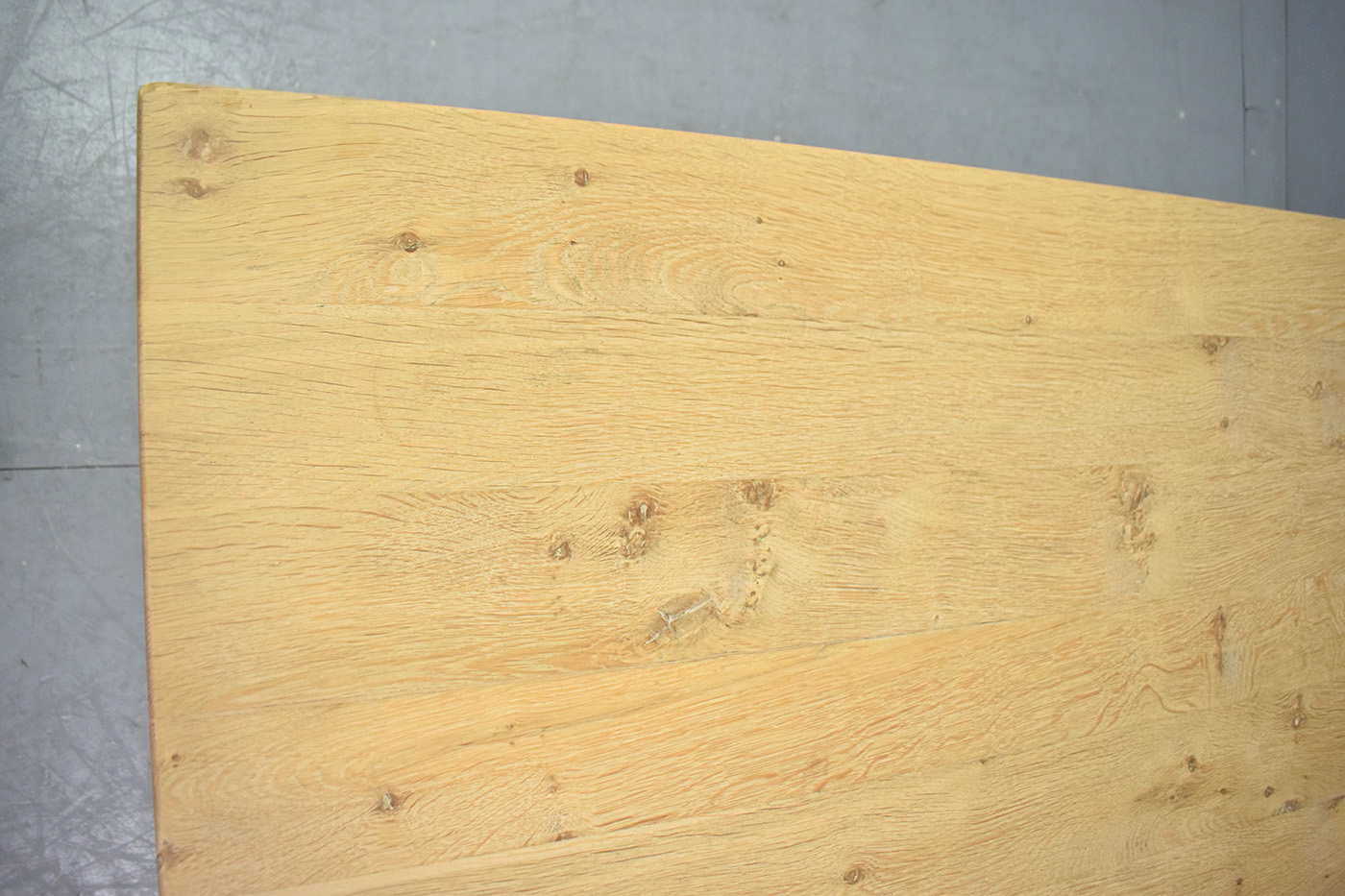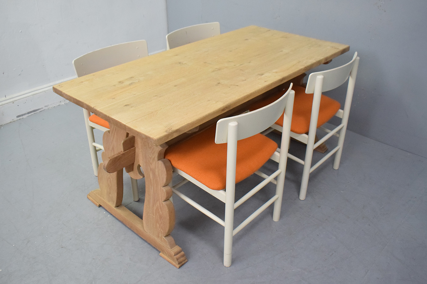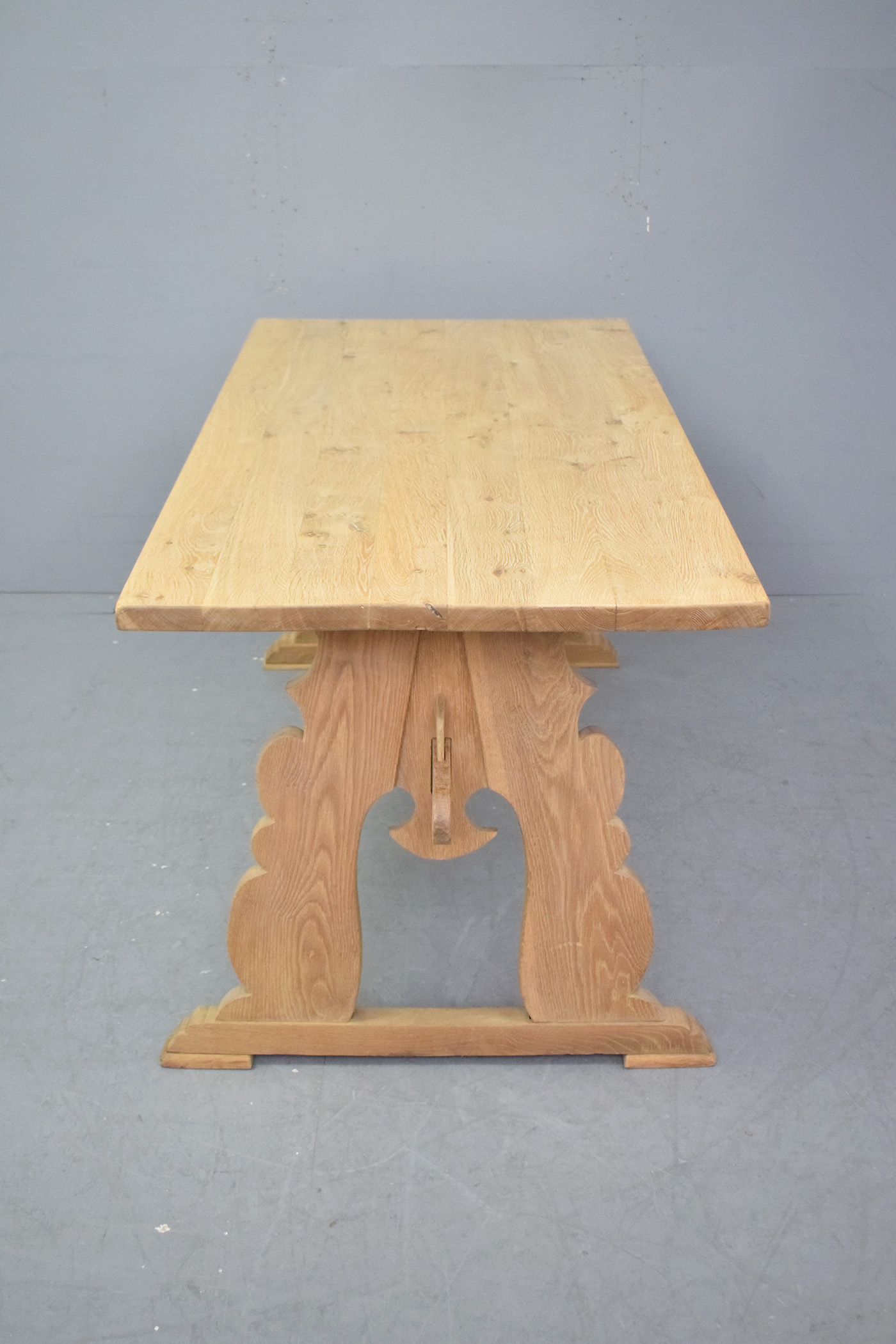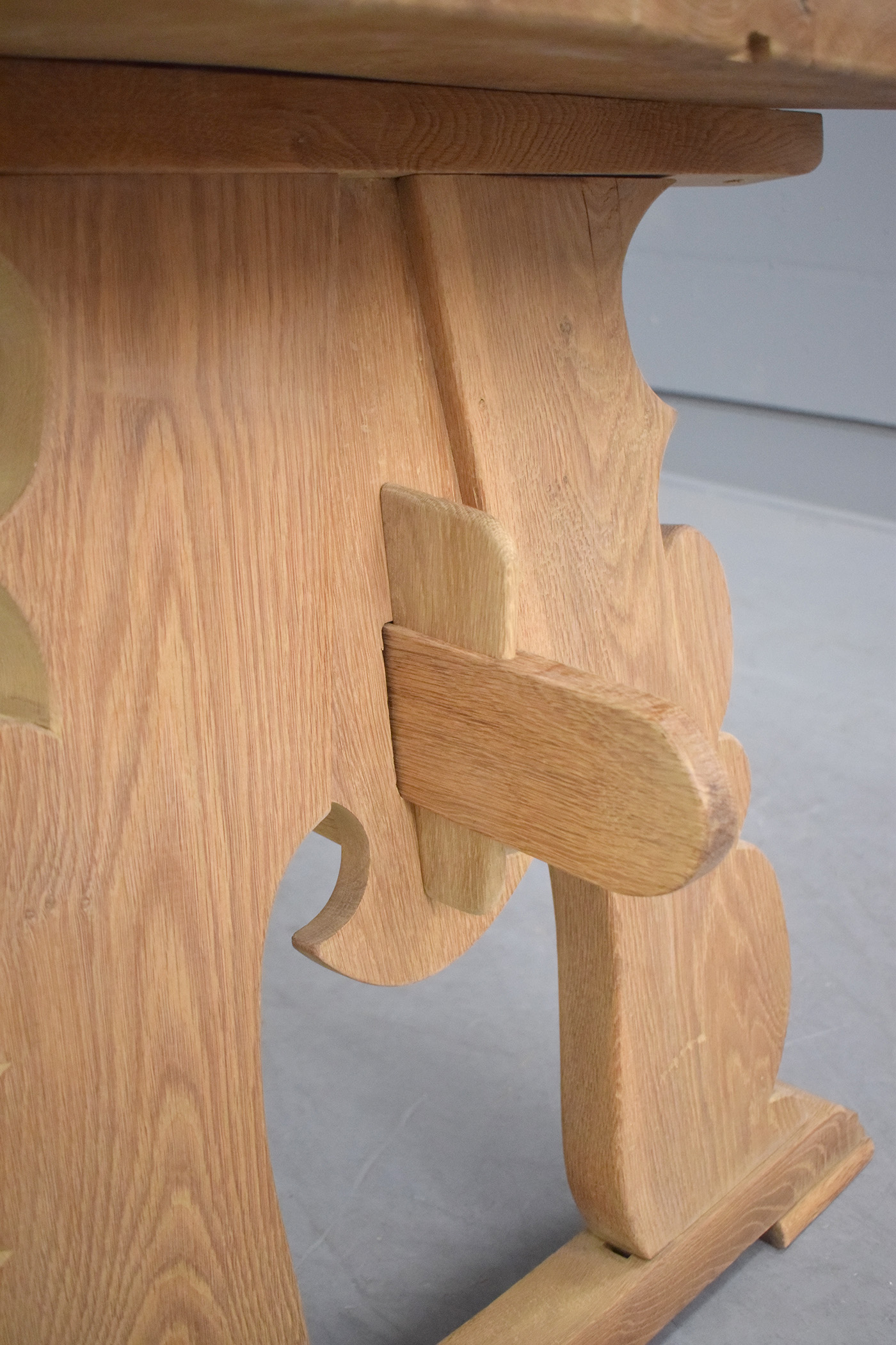 Solid oak plank table on trestle legs produced by Danish Mobelfabrik.