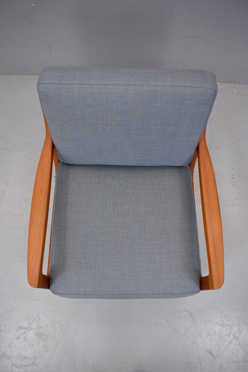 Stylish teak frame SENATOR armchair model FD166 with blue / grey upholstered cushions designed 1951 by Ole Wanscher for France & Son.