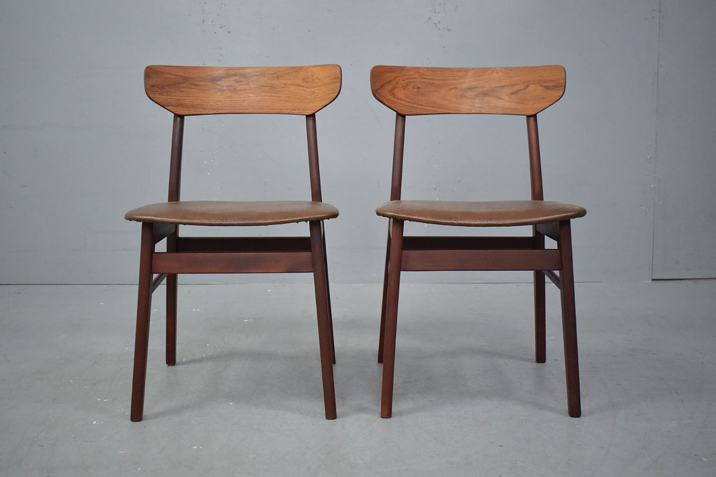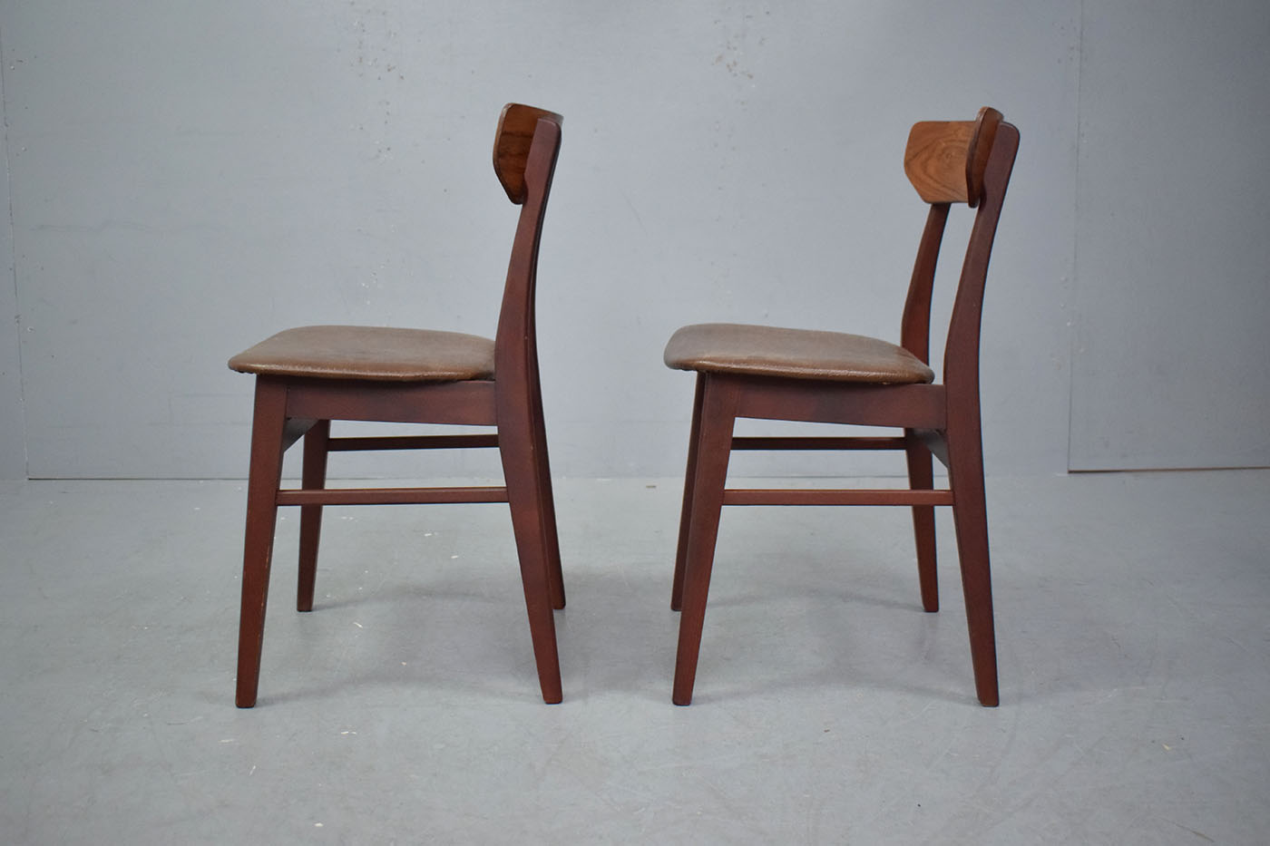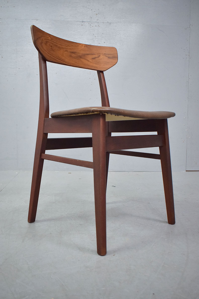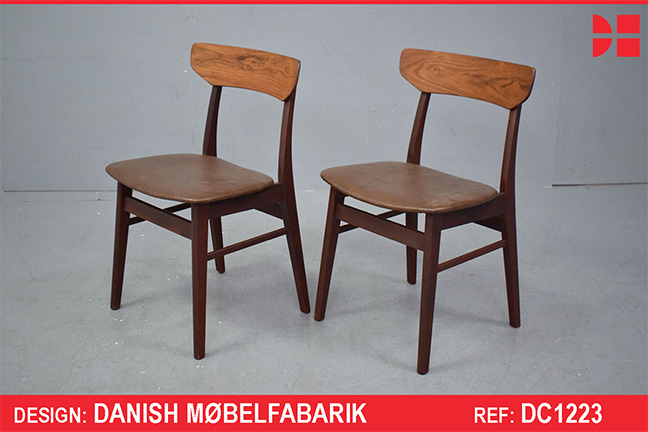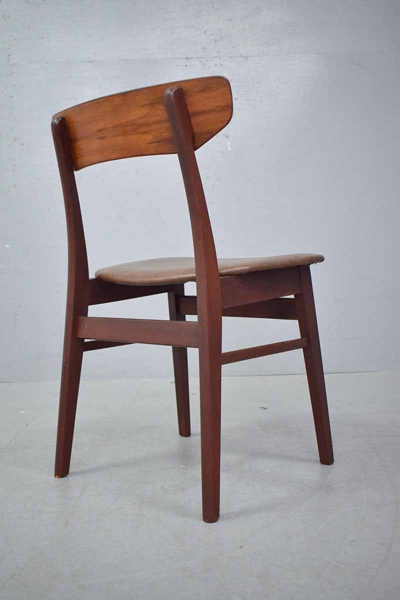 Pair of vintage beech frame dining chairs with original brown vinyl upholstery produced 1970s by Danish Mobelfabrik.