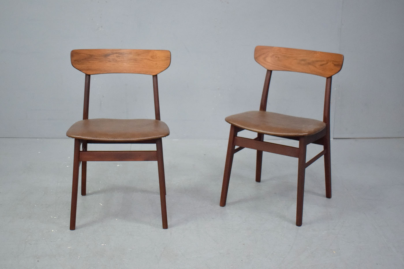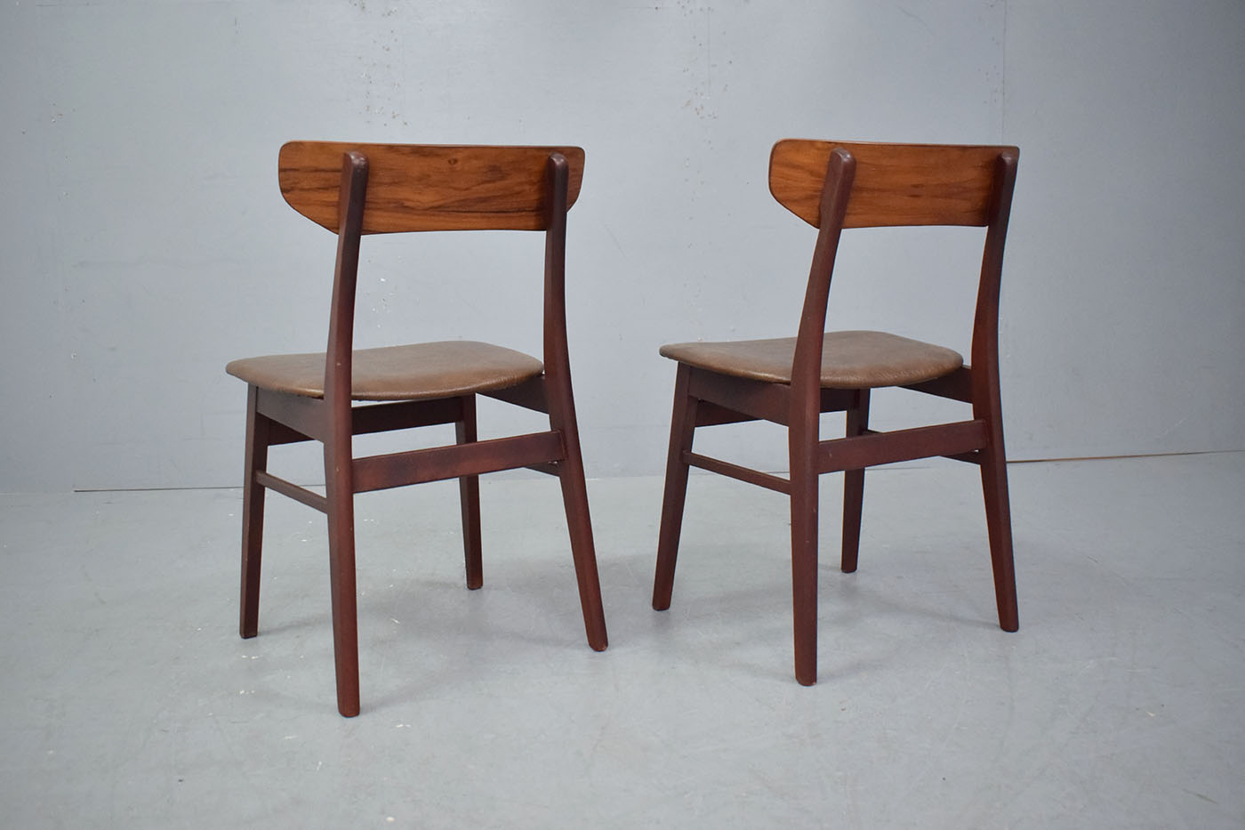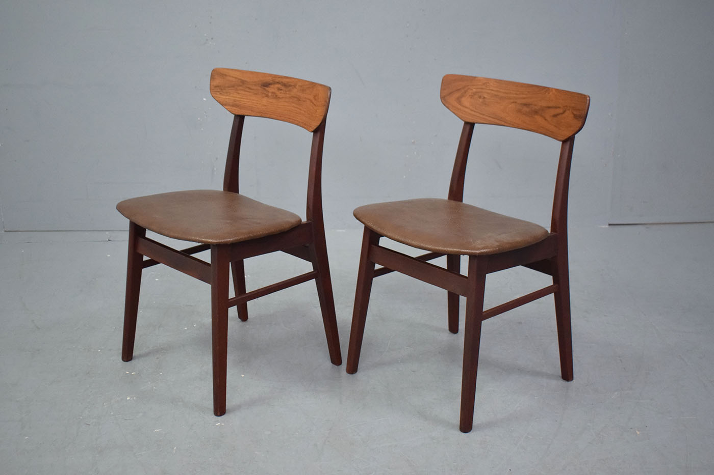 Pair of vintage beech frame dining chairs with original brown vinyl upholstery produced 1970s by Danish Mobelfabrik.