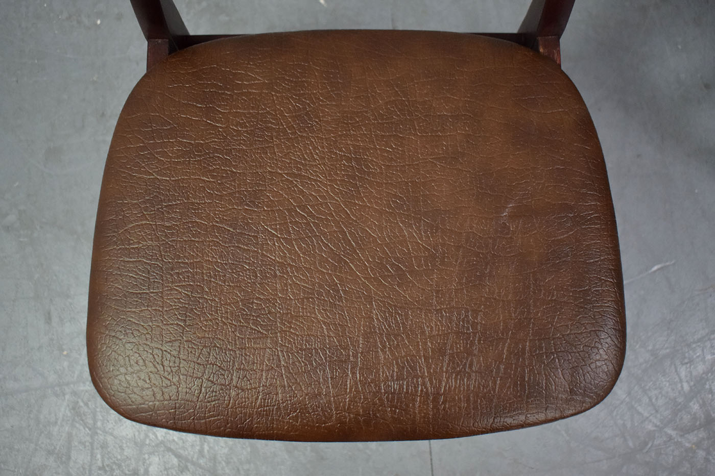 Both chairs feature their original brown vinyl upholsery, embossed with a faux leather texture. Whilst the upholstery is in excellent condition, we do offer a reupholstery service.